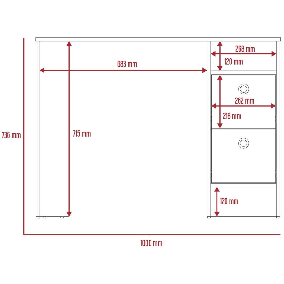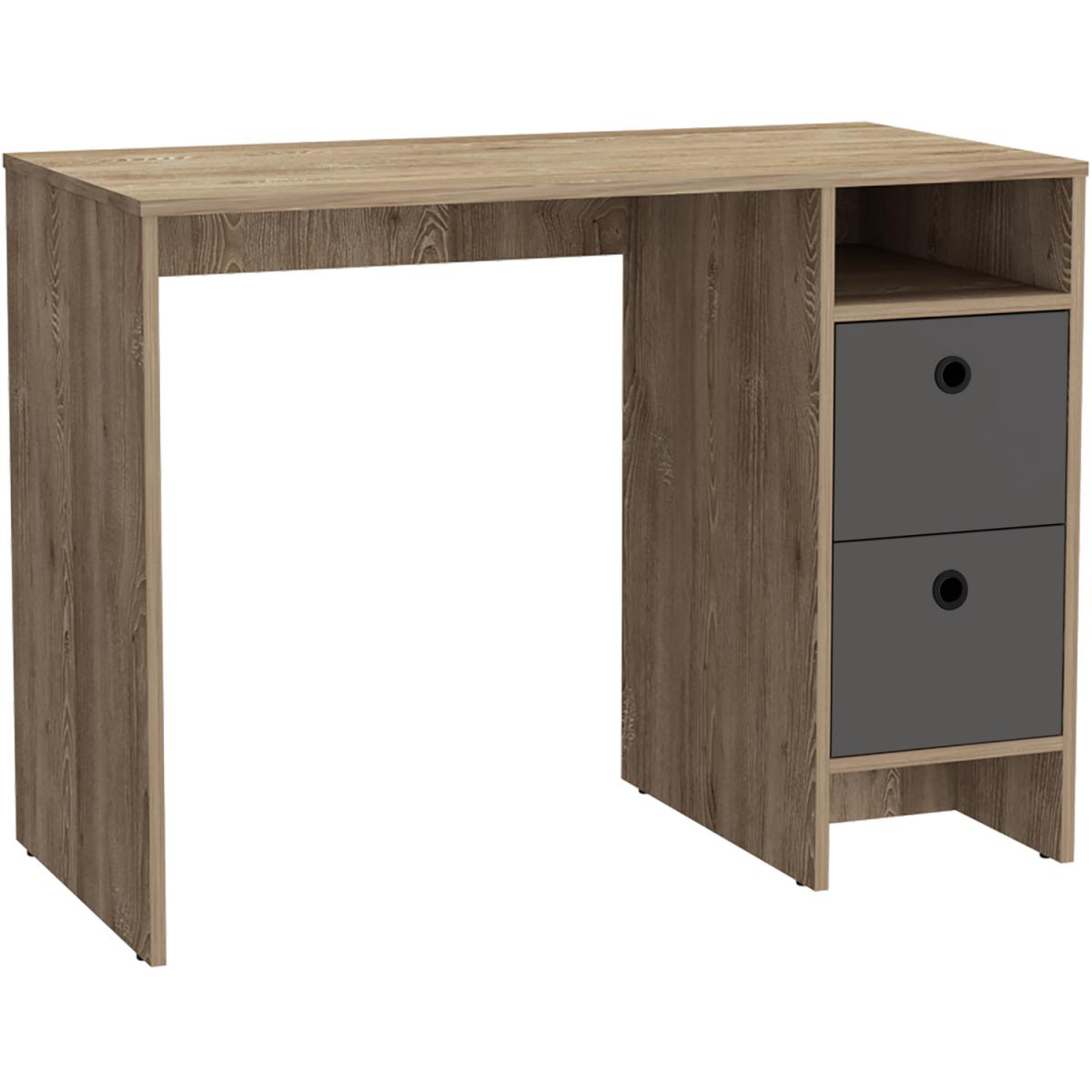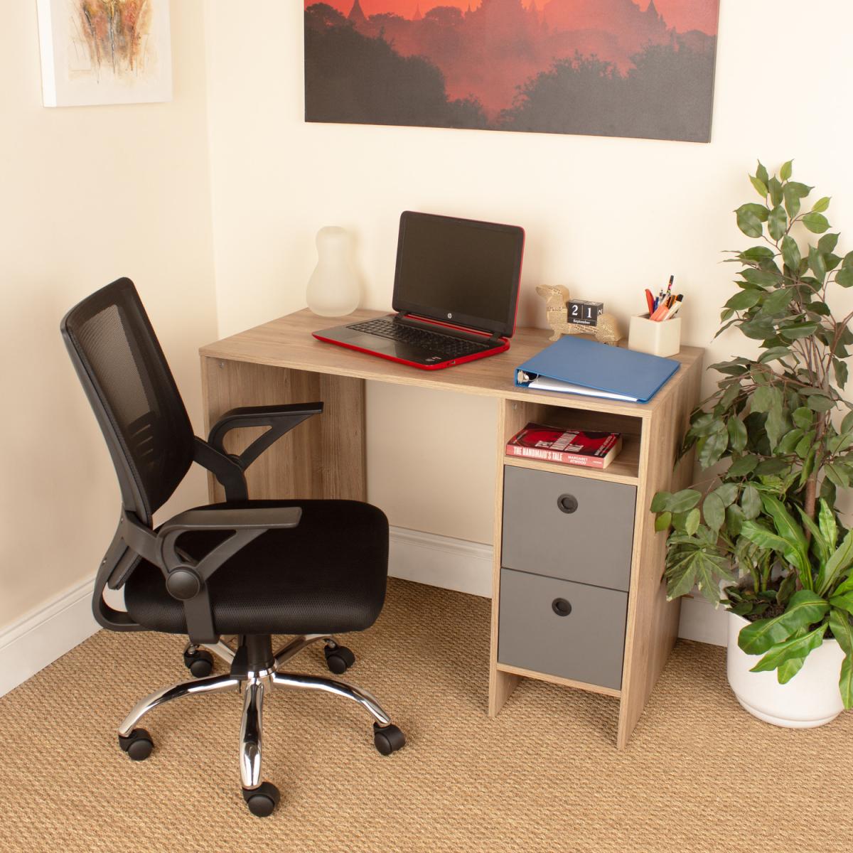 This compact, practical desk and chair are ideal for use at home to create your work or study space. Made from easy to clean, hardwearing melamine in bleached oak effect with contrasting grey drawer fronts and unobtrusive inset pull handles. The desk has two useful drawers with an open storage space above. The chair has a black upholstered seat and black mesh back with black plastic moulded base with castors and the gas lift enables the seat height to be adjusted to your requirements. The arms lift for ease of access. Maximum weight 120 KGDimensions:Desk - 100w x 50d x 73.6h cm Chair - 61w x 57d x 94-105h cm