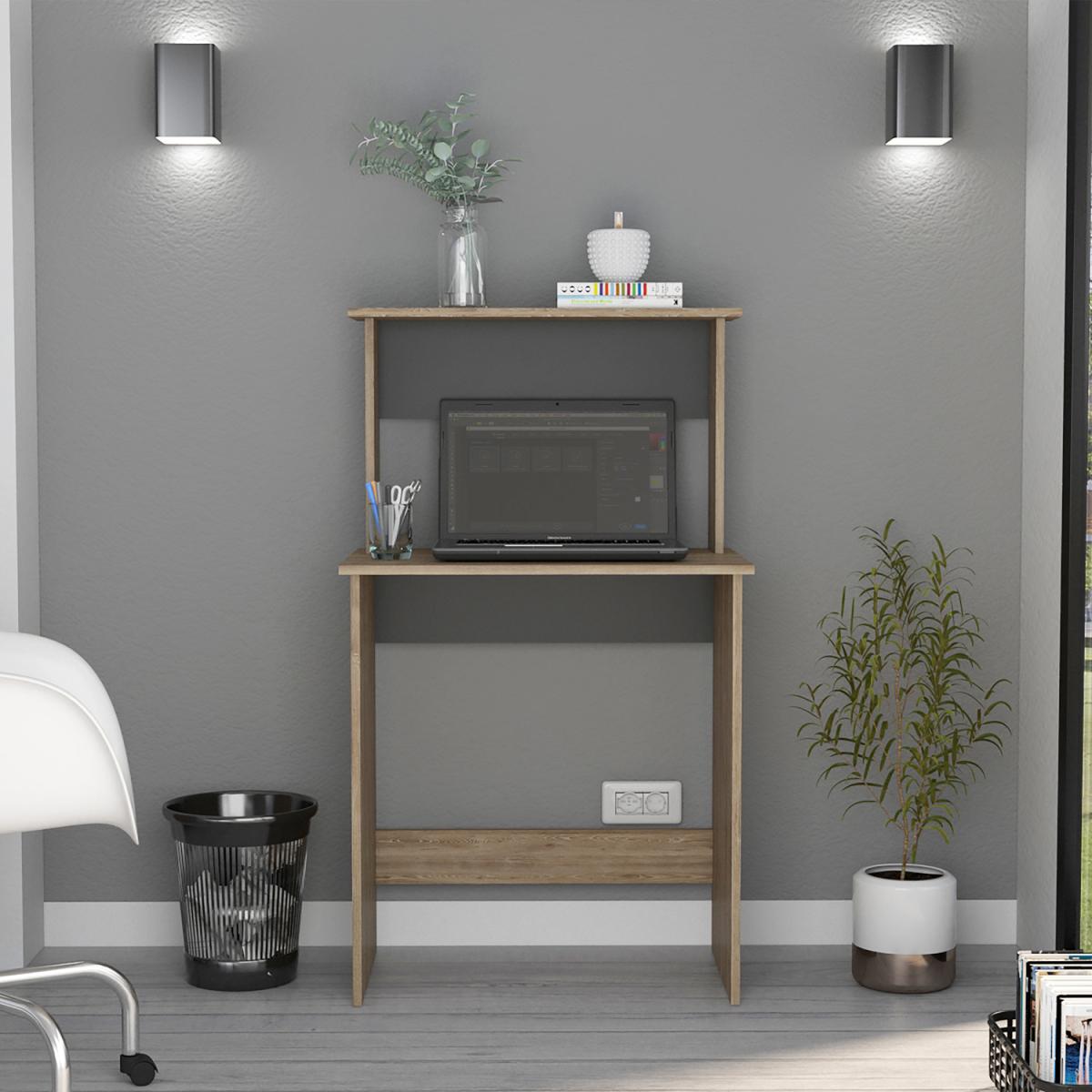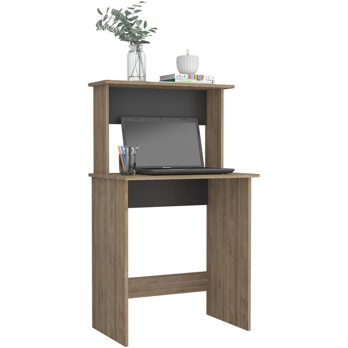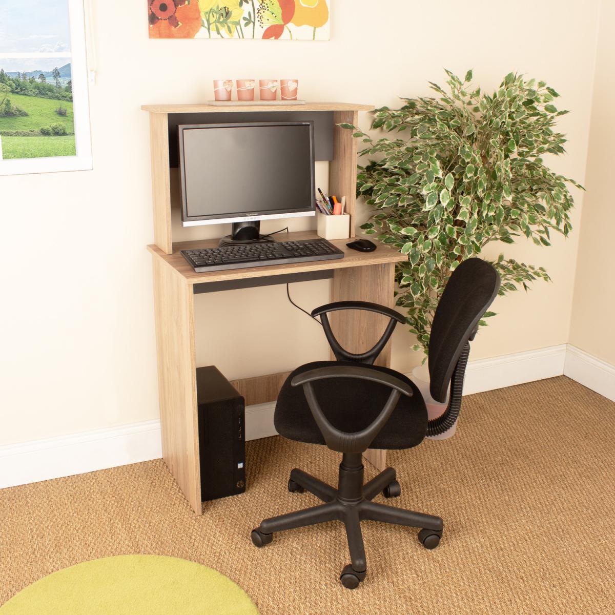 This compact simply designed workstation and chair are ideal where space is at a premium but you need to create a work space at home. It has a large desk area for working and a high shelf to hold your office essentials. It is made from bleached oak effect melamine with contrasting grey panels, which are hardwearing and easy to clean. The chair has black fabric upholstery to the seat and back and the black plastic moulded base has castors. the gas lift enables the seat height to be adjusted to suit your needs. Maximum weight 120 KG.Dimensions:Workstation - 69.1w x 44.8d x 119.6h cm Chair - 58w x 53d x 80-92h cm