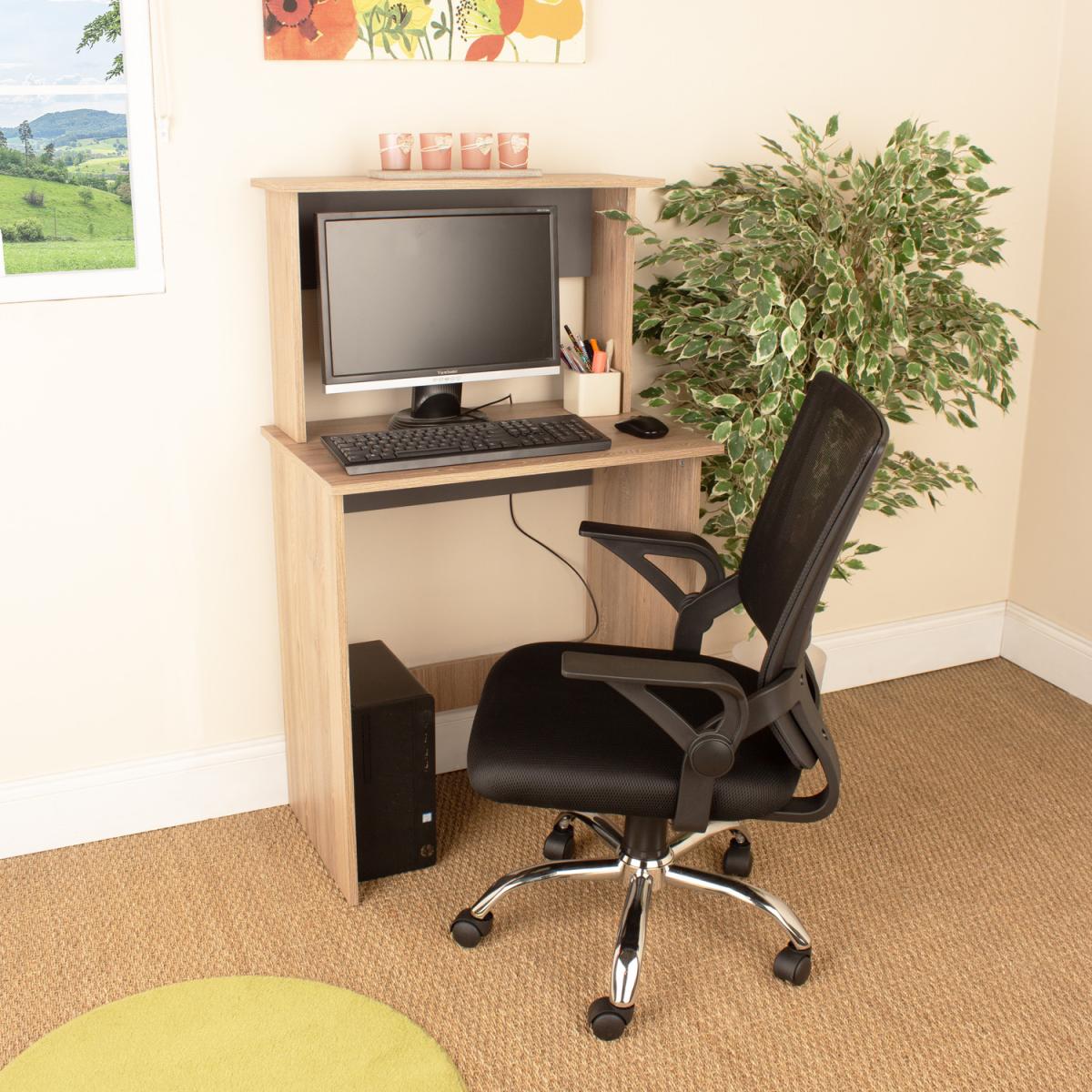 This compact simply designed workstation and chair are ideal where space is at a premium but you need to create a work space at home. It has a large desk area for working and a high shelf to hold your office essentials. It is made from bleached oak effect melamine with contrasting grey panels, which are hardwearing and easy to clean. The chair has black fabric upholstery to the seat and a black mesh back. The chrome plated steel base has castors and the gas lift enables the seat height to be adjusted to suit your needs. The arms lift for ease of access. Maximum weight 120 KG.Dimensions:Workstation - 69.1w x 44.8d x 119.6h cm Chair - 61w x 57d x 90-100h cm