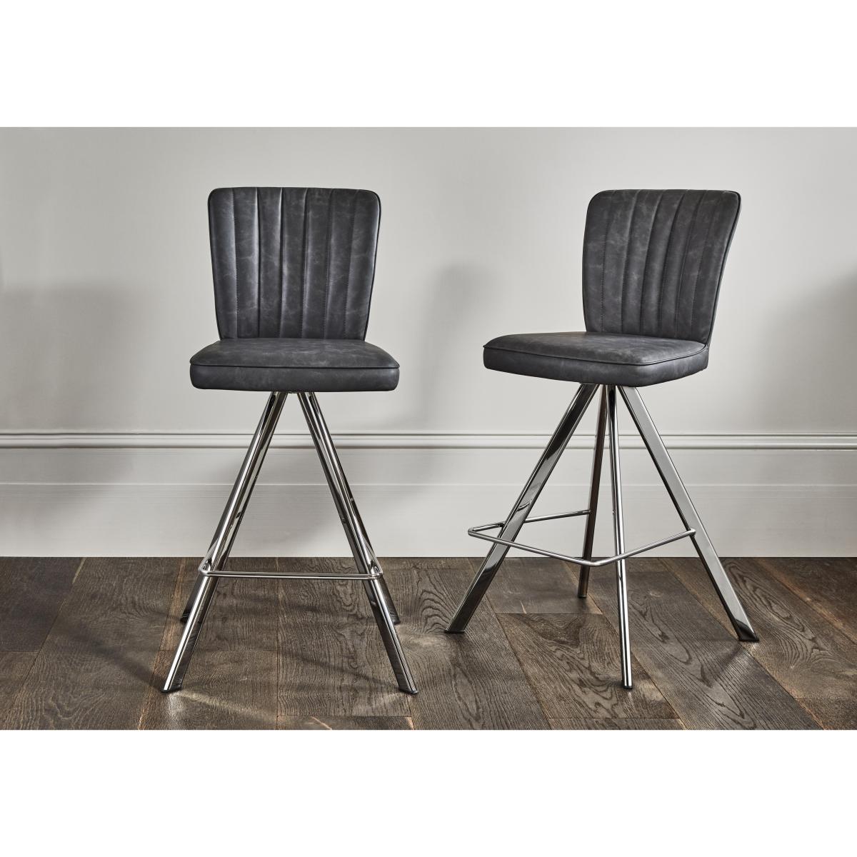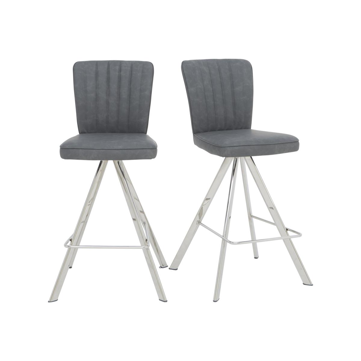 The gorgeous marble-effect ceramic and polished stainless steel of the Vegas range epitomises modern glamour. This stunning range instantly brings a touch of class to any interior, and with a range of furniture to choose from you can enjoy its timeless beauty throughout your home. From dinner party-ready dining sets to a wonderfully stylish yet practical shelving unit, this range is both beautiful and sturdy. The extending dining table steals the show, seating up to 10 people when fully extended, perfect for hosting in comfort and style. This gorgeous range is exclusive to Furniture Village. With a high-back and integrated footrest, this swivel barstool offers stylish dining in comfort. The faux leather and stainless-steel are perfect for contemporary interiors. Why you'll love it. This pair of swivel barstools is ideal for relaxed dining. Contemporary glamorous style. Sleek dark grey faux leather upholstery. Stylish stitched flute detailing. Swivel base with polished stainless steel legs and integrated footrest. Exclusively at Furniture Village. This pair of swivel barstools is part of the Vegas range. What you need to know. Cushioned with foam for comfortable dining. Steel frame and legs. These swivel barstools pair perfectly with the Vegas bar table.