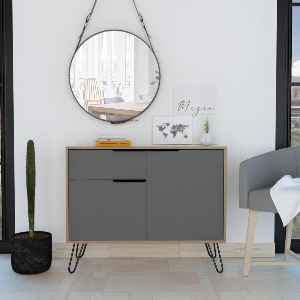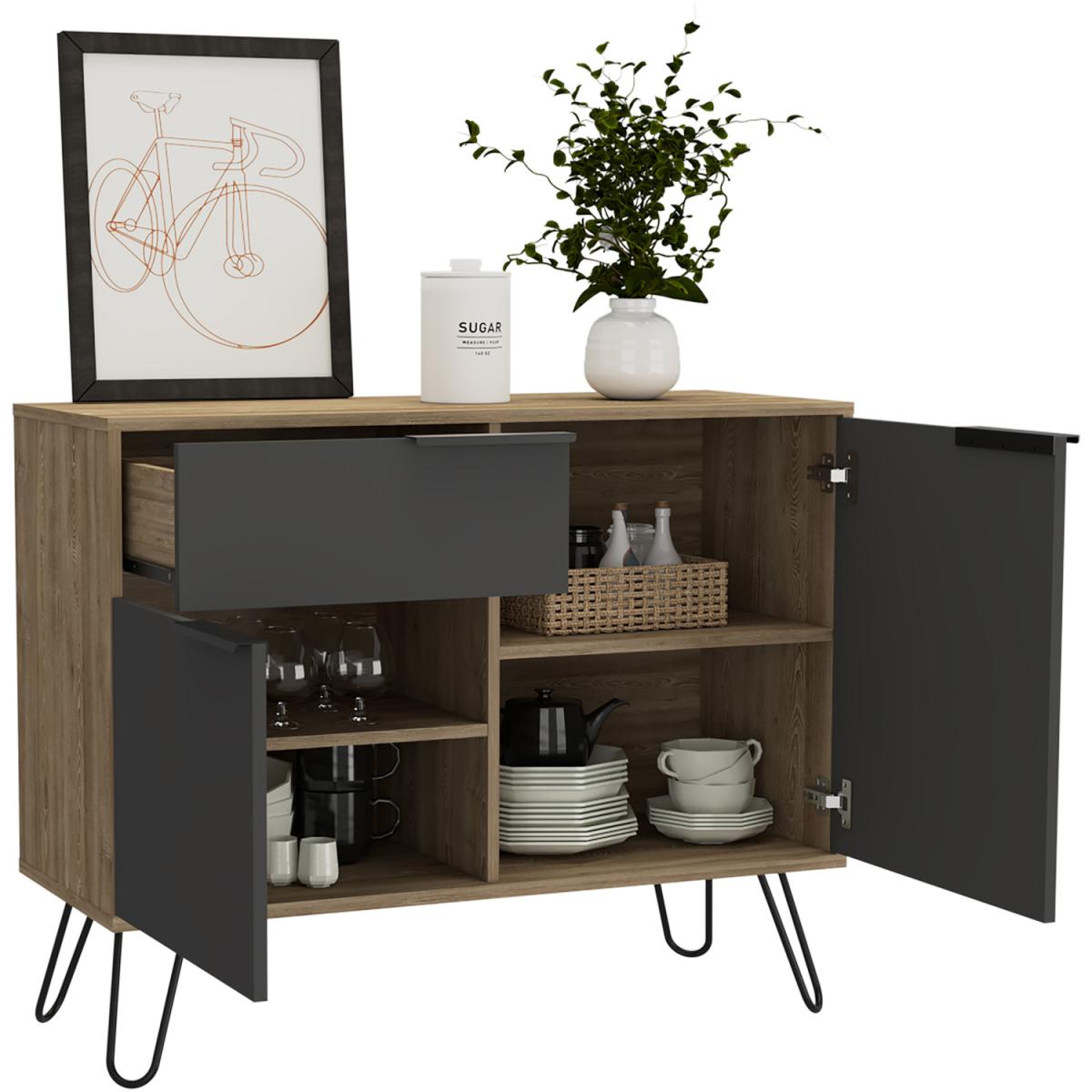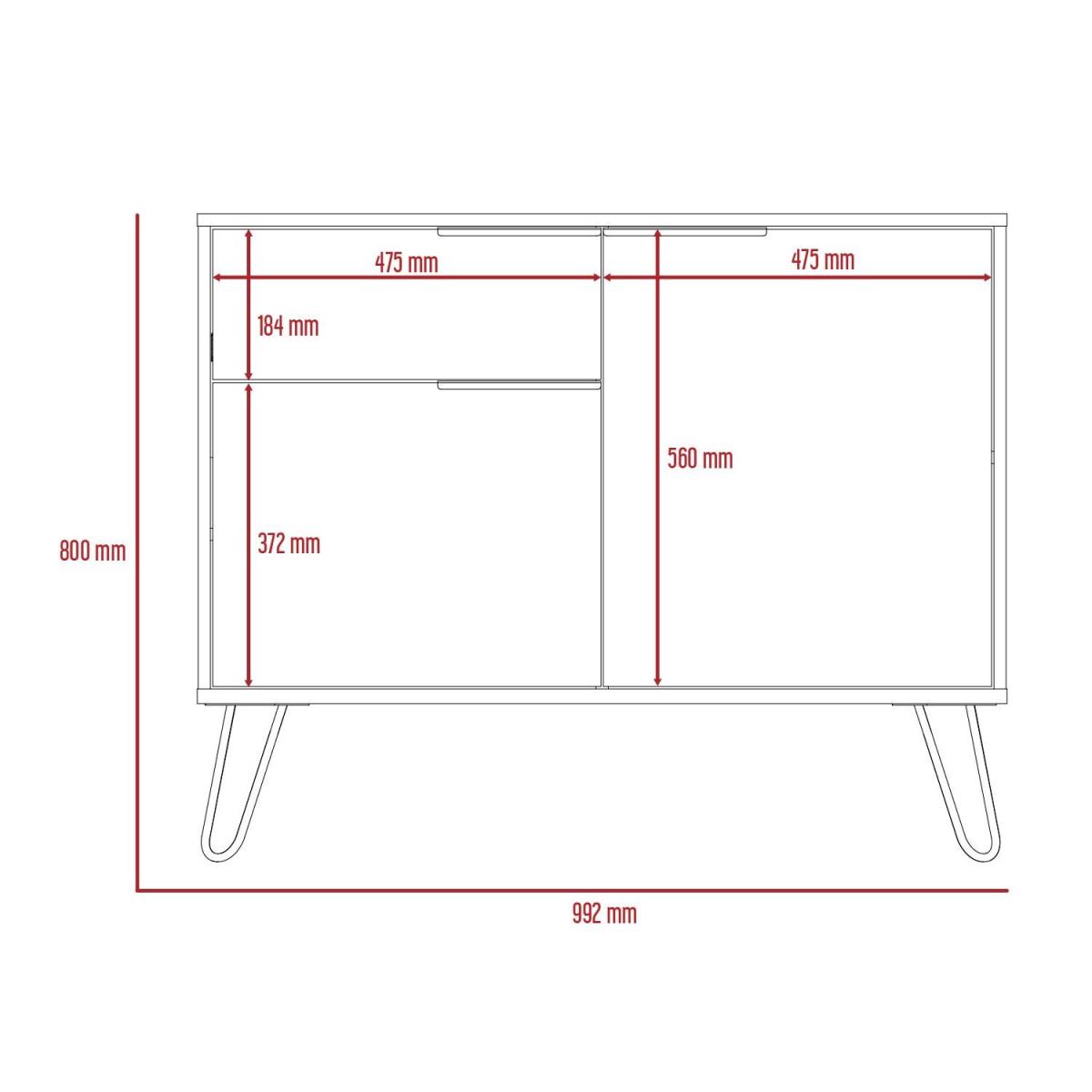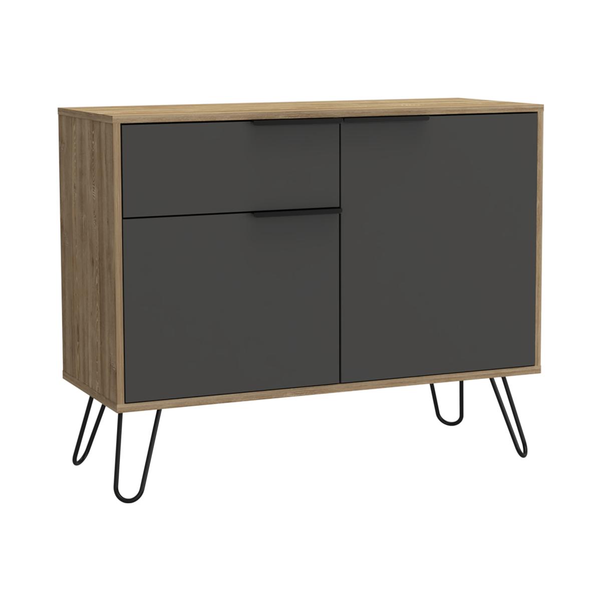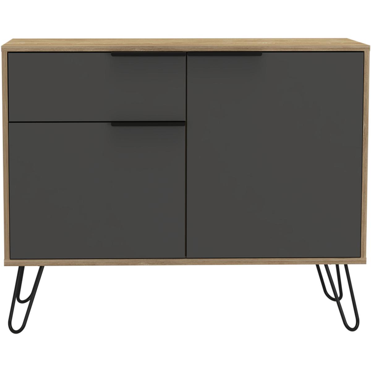 The Vegas collection brings you stylish, innovative designs, ideal for todays casual lifestyle. Each piece is designed to serve a practical purpose and can be used individually or combined with other pieces from our Vegas range for a fully coordinated look. Made from hardwearing manufactured wood boards with an easy to clean finish, a bleached oak woodgrain effect is used for the cabinets with a contrasting grey for the fronts. The industrial feel is further accented with real metal black painted grip handles and hairpin legs. A small sideboard with lots of storage possibilities. The top itself is ideal as a serving area with its wipe clean finish. Underneath is a useful drawer on easy glide runners, ideal for cutlery. Underneath this you will find a low cupboard area whilst alongside is a full height cupboard, both with shelves so you can make even more use of the space.