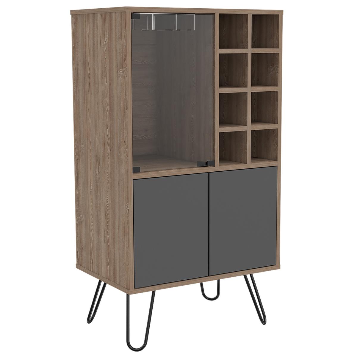 A sophisticated way to store your wine bottles and glasses. Made from hardwearing melamine board and finished with a bleached oak effect and contrasting grey effect with black metal hairpin shape legs.