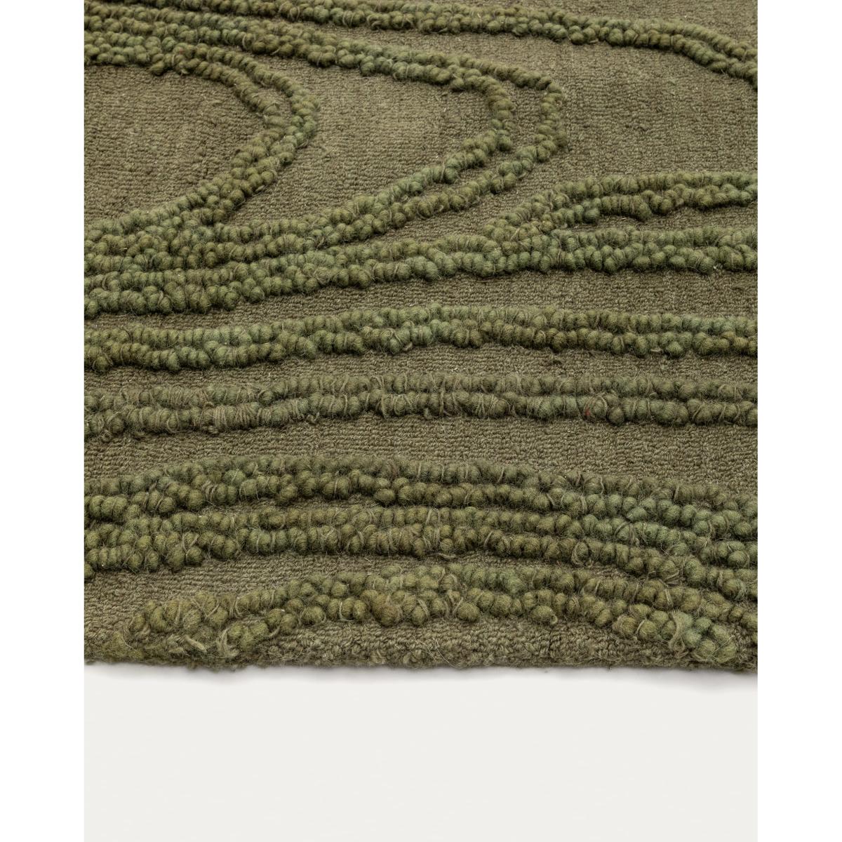 I really like this green wool rug for its versatile and understated style. Its subtle, natural tone works well in both contemporary and traditional interiors, adding warmth without overpowering the space. It’s perfect for living rooms or bedrooms where you want a cosy feel underfoot. For styling, consider pairing it with neutral upholstery and wooden accents to enhance its earthy appeal. Practical tips include placing it underneath a coffee table or bed to anchor the room, and layering with smaller textiles in complementary colours for added texture. Since it's wool, it’s also easy to maintain with regular cleaner, making it a practical yet stylish choice.
