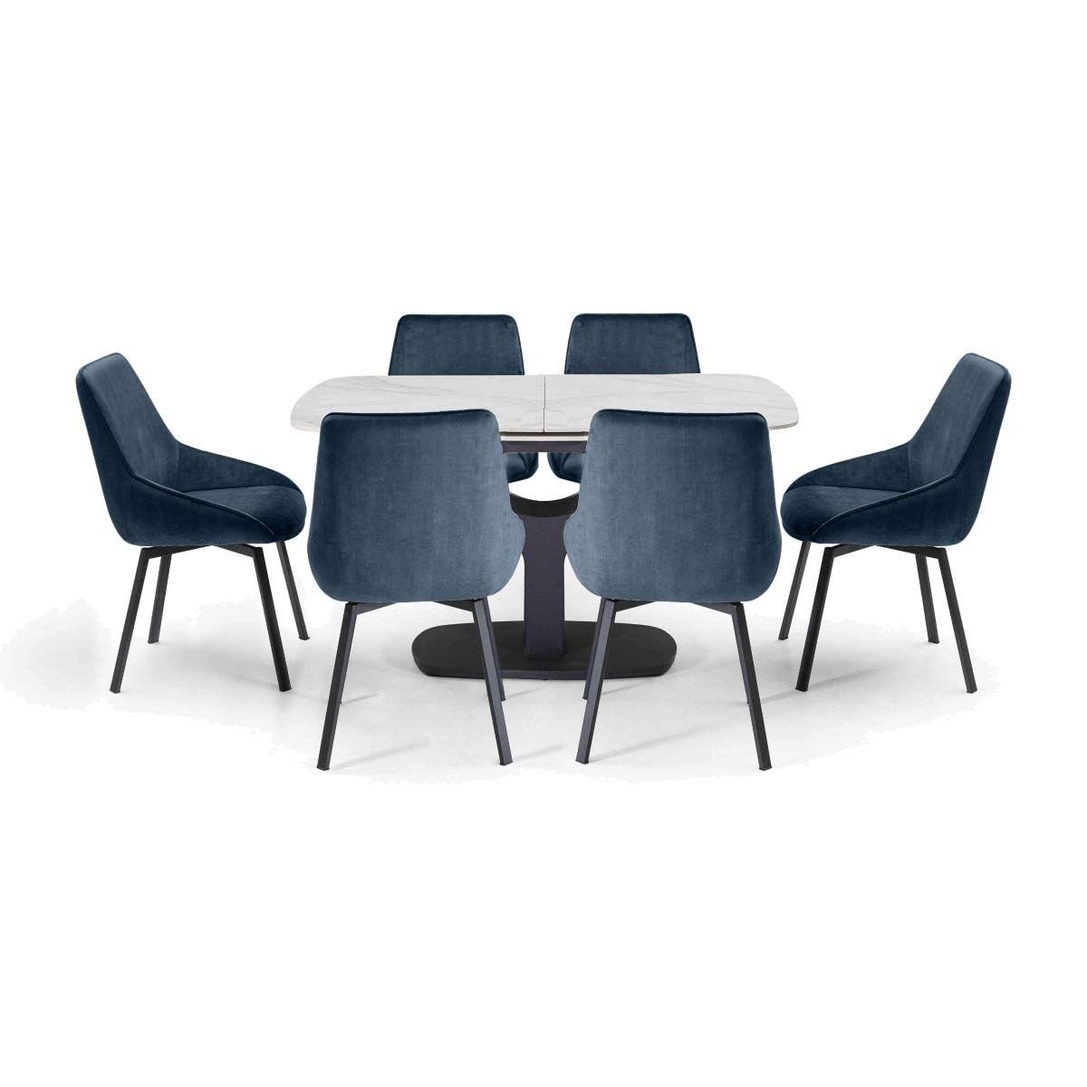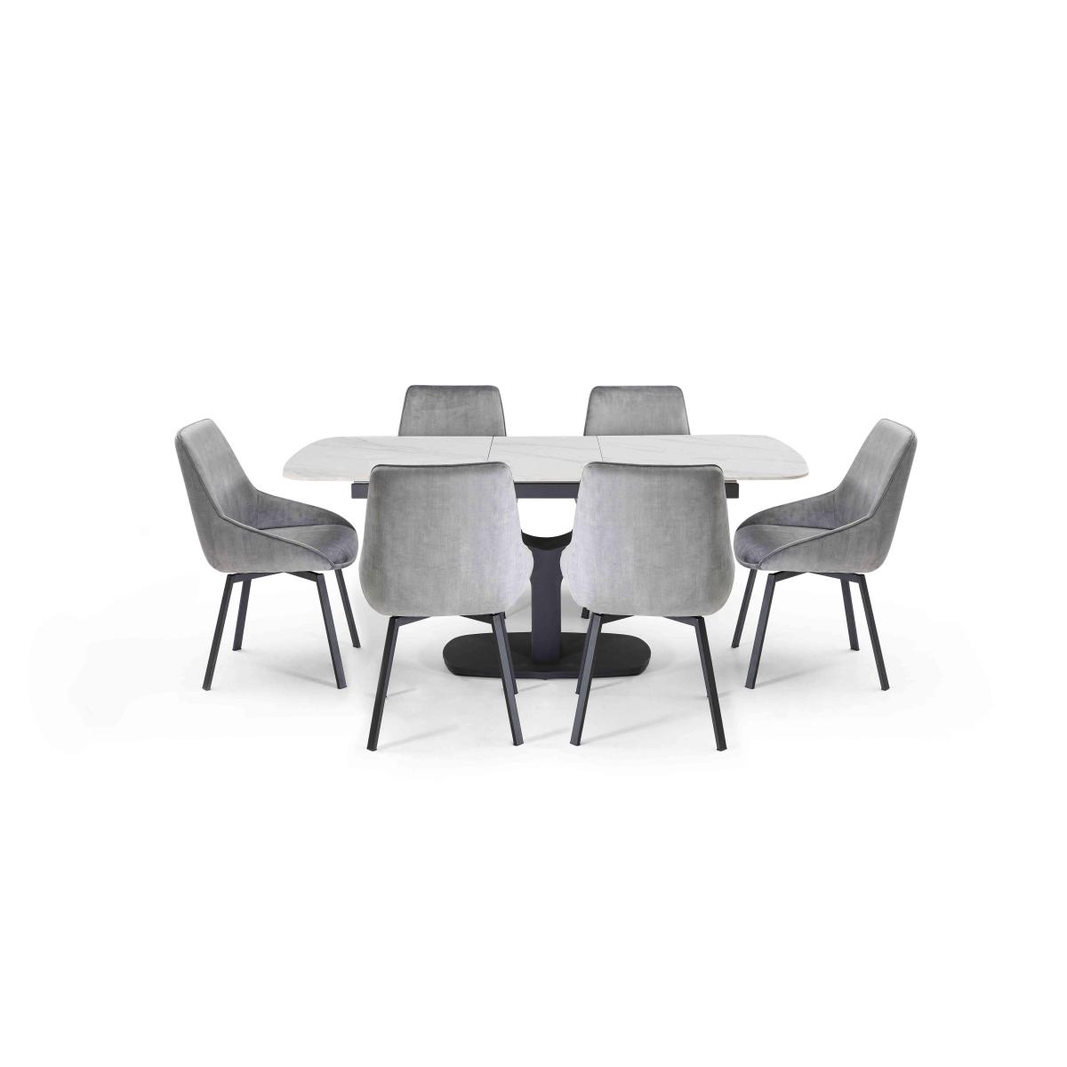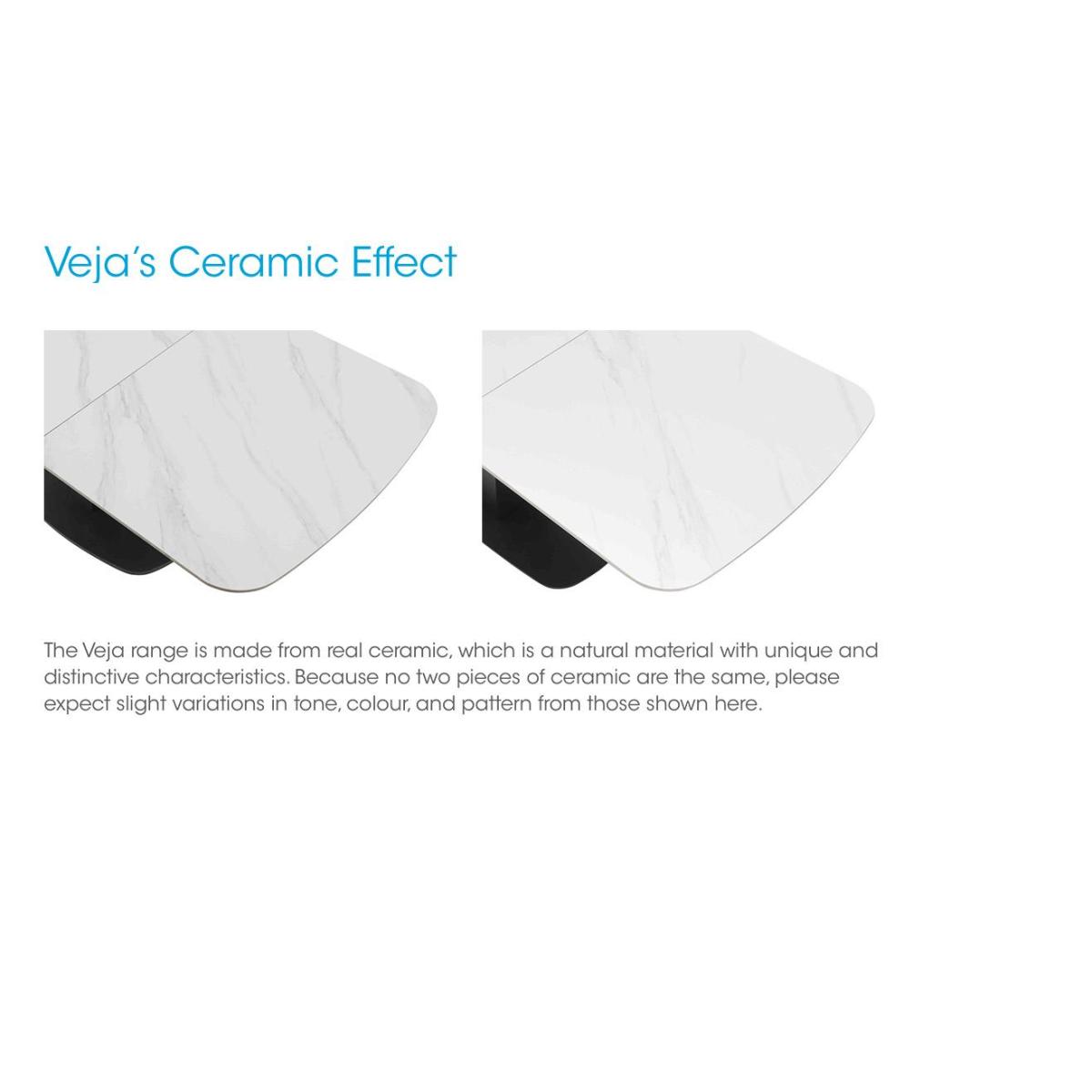 Our Veja range delivers unique modern style that will never go out of fashion. The collection’s handcrafted extending dining table is all-round fabulous – from its showstopping black metal Y-shaped base to its smooth white ceramic finish to the gentle curves of the table top ends. It’s also a wise choice – ceramic is super hardwearing and you’ll love the fact that, open or closed, the table top always displays a perfect and seamless ceramic finish. The Veja range also includes a selection of dining sets and stylish swivel base dining chairs and bar stools upholstered in grey velvet. The Veja range is exclusively available at Furniture Village. Bold lines and ingenious curves make our Veja dining set a one of a kind. The ceramic-topped extending dining table has a unique Y-shaped base. With six chairs. Why you'll love it A showstopping look for your stylish modern home. Handmade dining table has a truly striking black metal Y-shaped base. White ceramic top has smooth curved ends. Super-durable finish – ceramic is heat-, scratch- and chip-resistant. Easy to extend – the centre leaf simply pops up into place. Closed or extended, the ceramic pattern continues seamlessly across the table top. With 4 swivel dining chairs with velvet upholstery in a choice of colours. Curved and cushioned seats and matt-finish black metal legs. Only at Furniture Village. This dining set is part of our Veja range. What you need to know Chairs have metal frames and legs, and are cushioned with foam. Dining table seats 4 closed and 6 when extended. Top is made with 12 mm ceramic. This dining table is very heavy. Once in place, it will be difficult to reposition. Please take care if you have to move it. Please note that ceramic is not 100% heatproof. We recommend using coasters and placemats at all times. Easy to care for. Simply wipe with a clean damp cloth. Browse the Veja range for dining sets, dining chairs, occasional tables and more.
