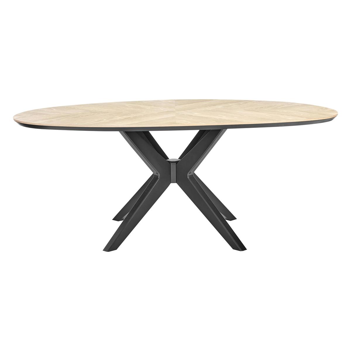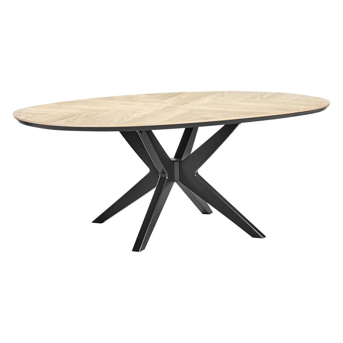 It’s the combination of distinctive geometric shapes and bold angles that makes the 6-seater Velodrome dining table so stylish. The unusual oval-shaped top is a perfect choice for a narrower dining area, and an interesting alternative to the more common rectangular shape. The table top is made of American white oak veneers arranged to create striking geometric patterning, with the wood grain set at 45° angles. The starburst-style base is made of solid beech finished in a bold and fashionable gunmetal grey. The Velodrome oval dining table is just one of the dining tables in the great-value, contemporary-style Velodrome range. This range includes four different dining tables, two styles of dining chair, and several living room and dining room storage pieces as well as occasional tables.