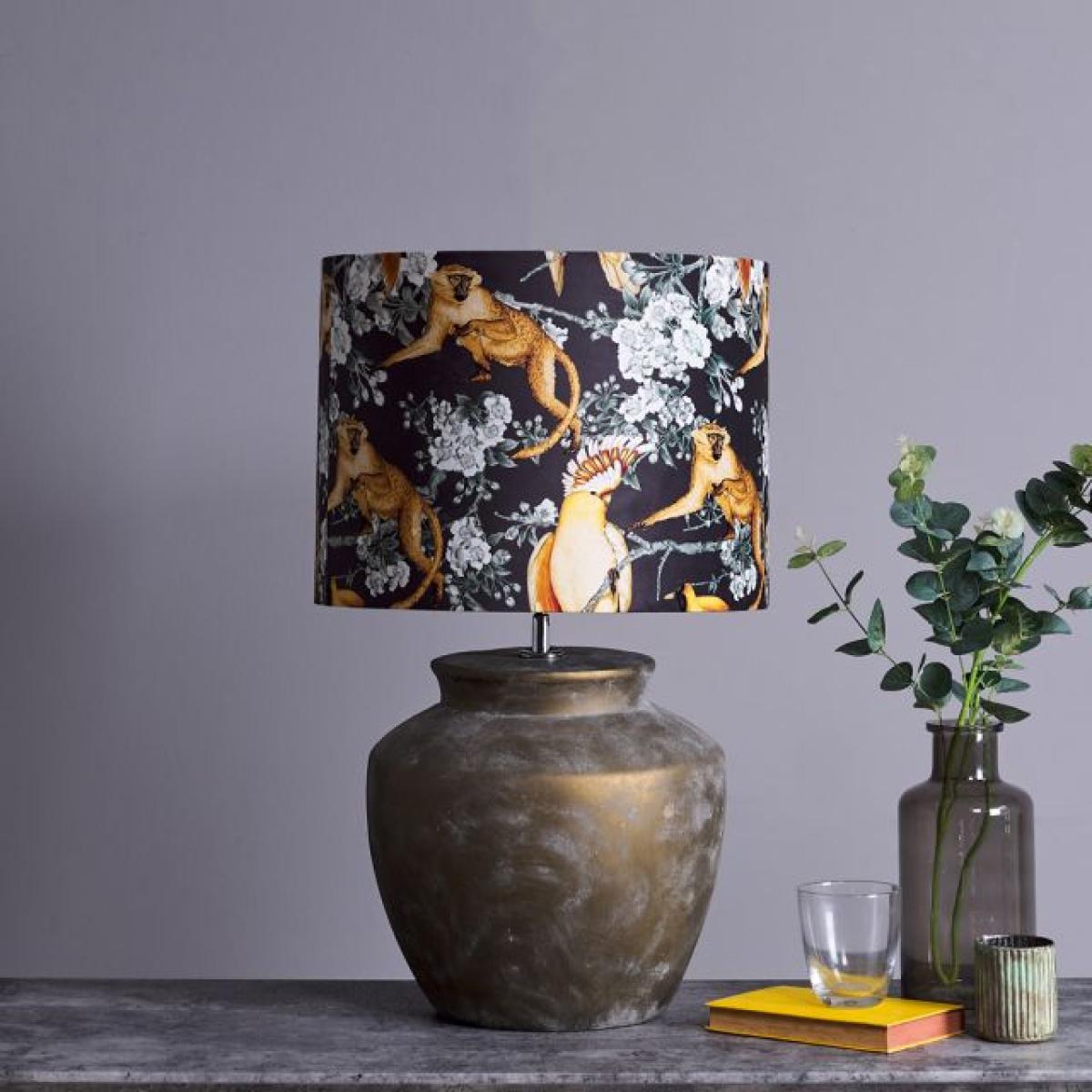 We absoloutly love this lampshade! It's beautifully eclectic design features a monkey and parrot tiled print on a soft velvet lampshade that will certainly make an excellent statement piece in your home.