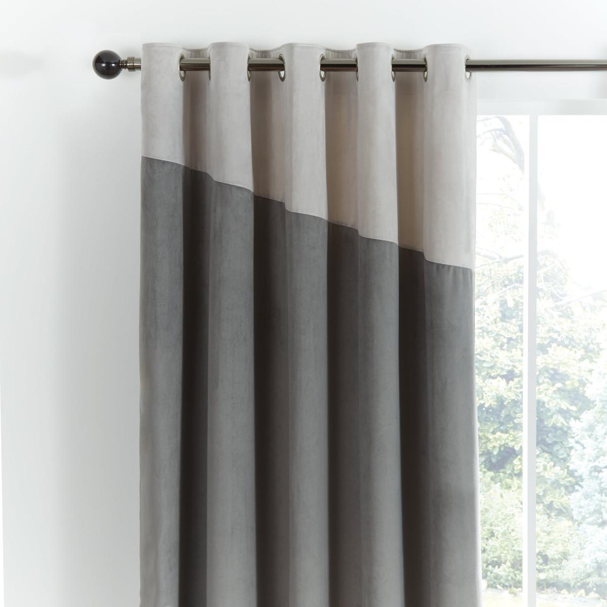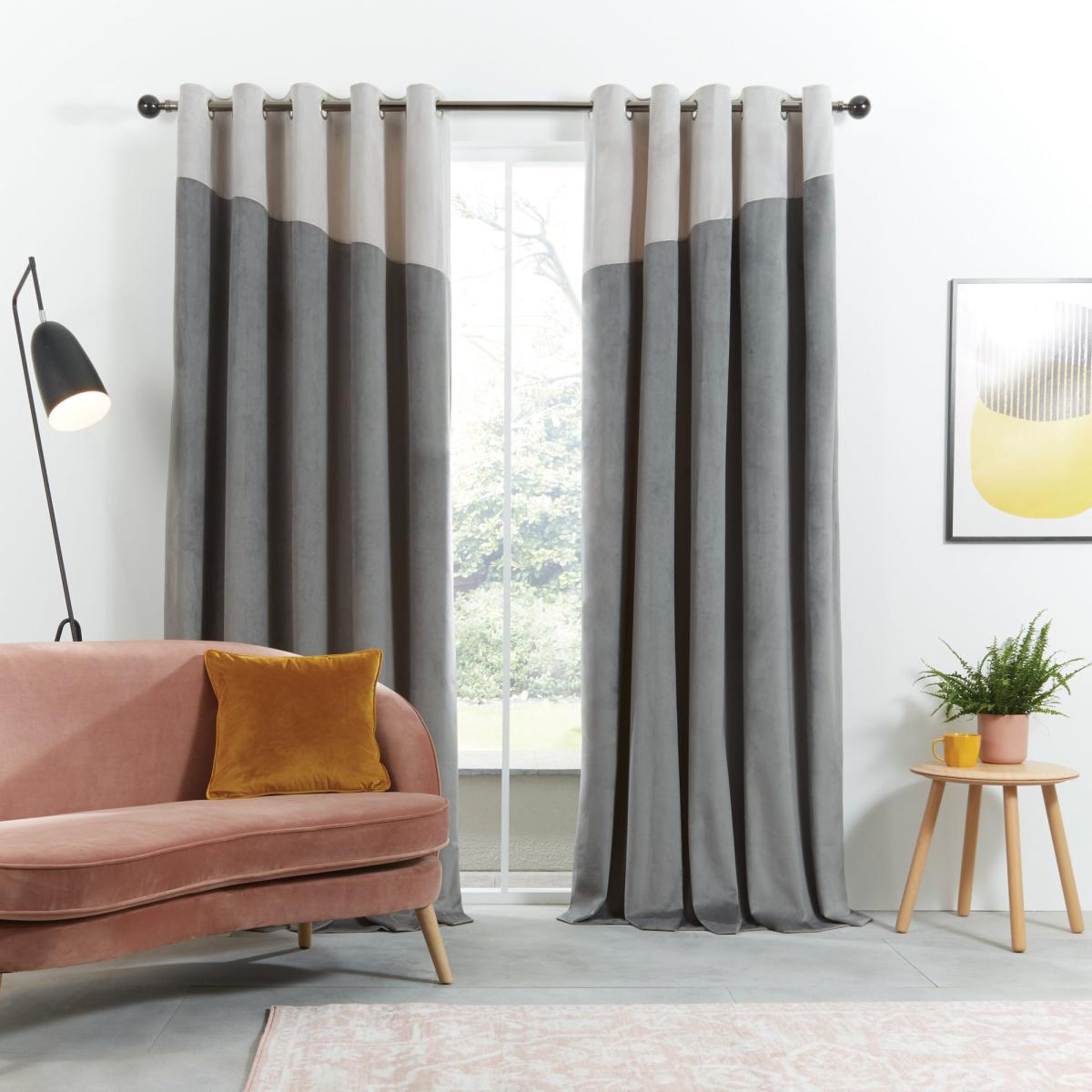 Crafted using a luxurious velour fabric in a stylish grey colourway, this pair of curtains features a contemporary angled border design, perfect for adding a sophisticated, modern edge to your home décor. This pair of curtains feature a modern, durable brushed steel eyelet header, allowing for easy installation and smooth movement across your curtain pole whilst creating full, elegant folds, and are fully lined for added privacy. Available in a selection of sizes to suit your requirements. Please note: these curtains are sold as a pair.