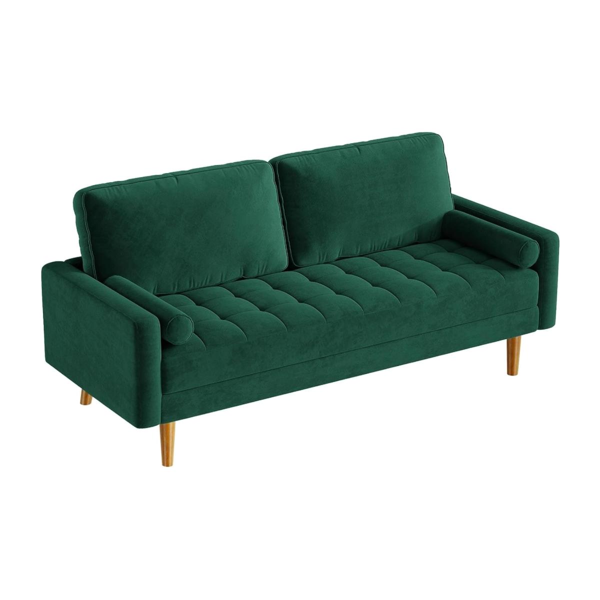 High-quality small couch with a low back design for excellent support and comfort, ideal for living rooms, bedrooms, and home offices. Mid-Century Modern 3-seater sofa with classic shape and retro details, cushions offer medium firmness (3 out of 5) for a comfortable, upright sitting position. Includes velvet loveseat, seat cushion, back cushions, bolster pillows, armrests, solid-wooden legs, and mounting accessories. Supports up to 250 kg and remains durable with no deformation after 100,000 press tests.