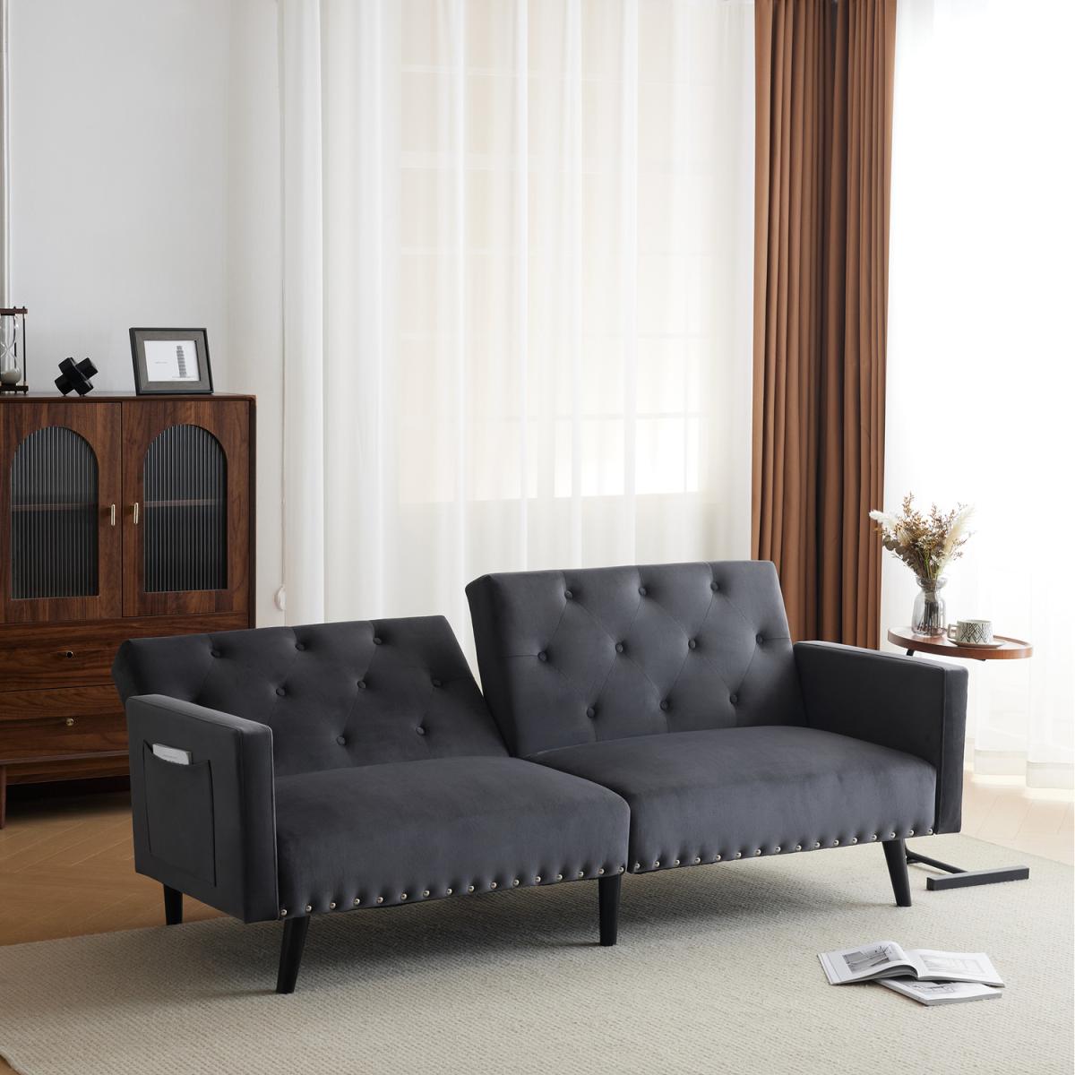 Our adaptable sofa bed offers 3 adjustable backrest positions and 2 detachable armrests, allowing for flexible use as either a sofa or a bed. With its velvet upholstery, nail head trim, and button-tufted accents, this sofa bed enhances a modern yet classic aesthetic. High-density foam padding and breathable velvet fabric ensures a cosy sitting and lying experience and with side pockets offering convenient storage for books, magazines, or snacks