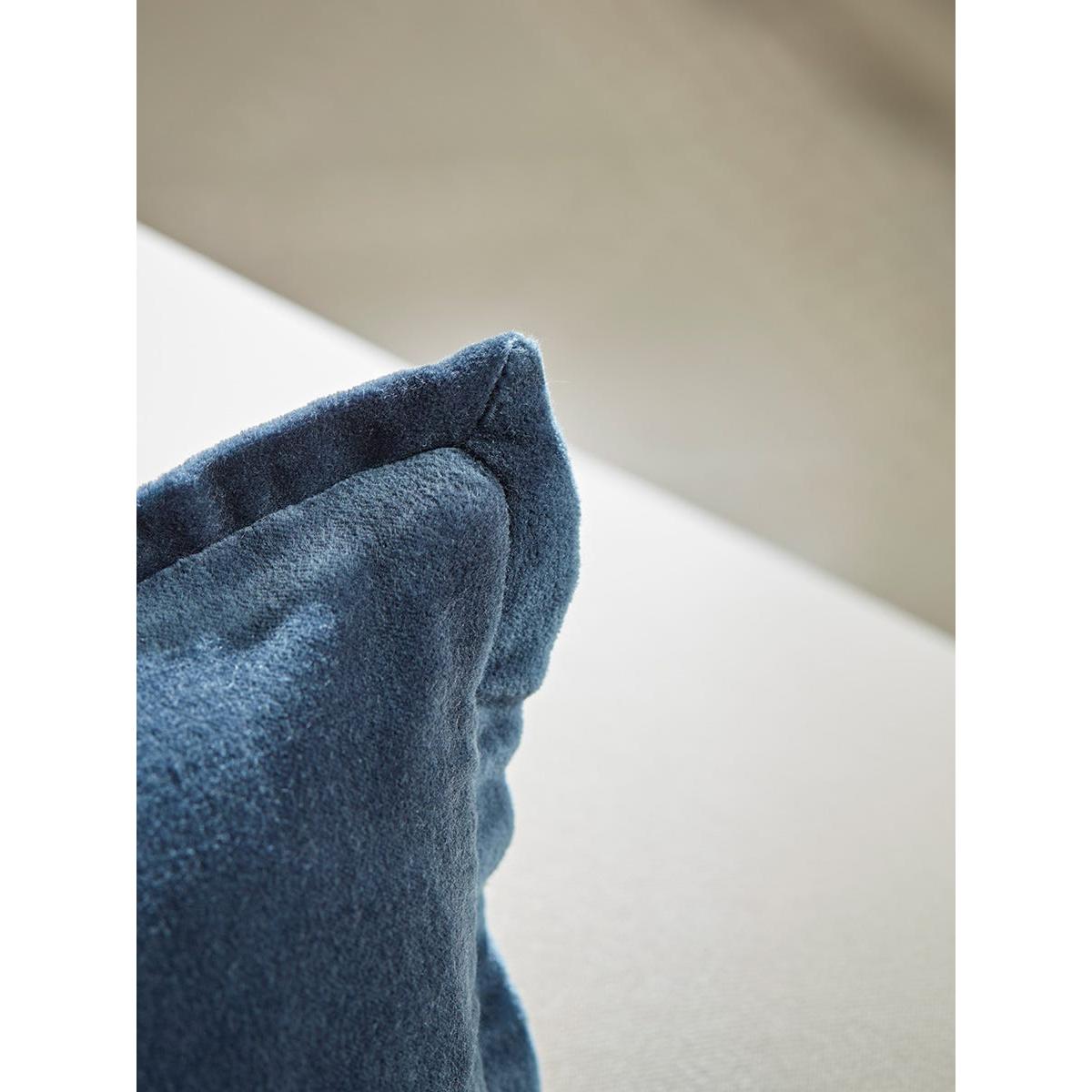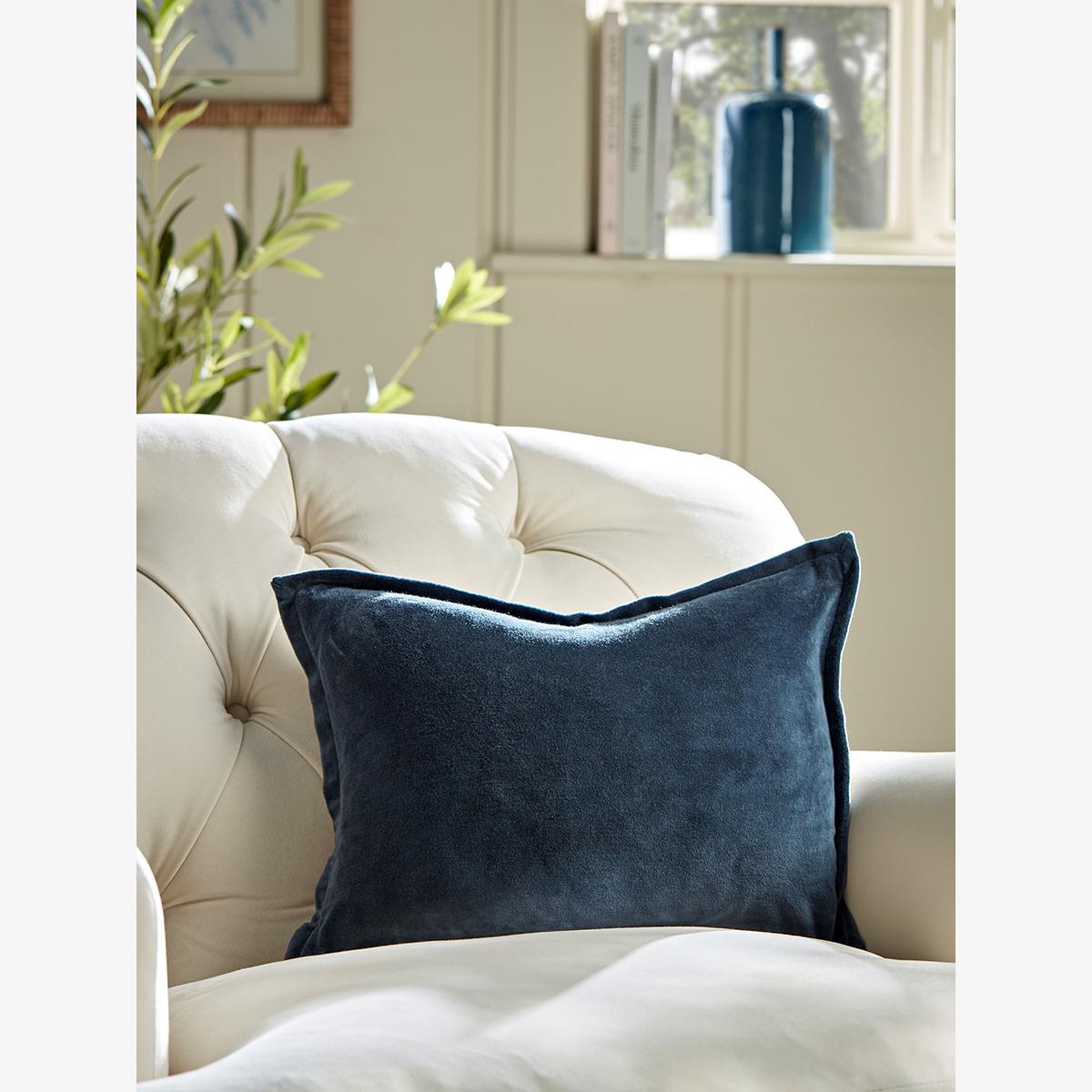 In a luxurious velvet, this cushion adds a wonderful touch of comfort to your home. Deep blue tones add depth and dimensions to your space and bring a sense of cosy simplicity to your living space.  The rectangular shape makes this perfect for placing on your bed or on an armchair. Also available in square.