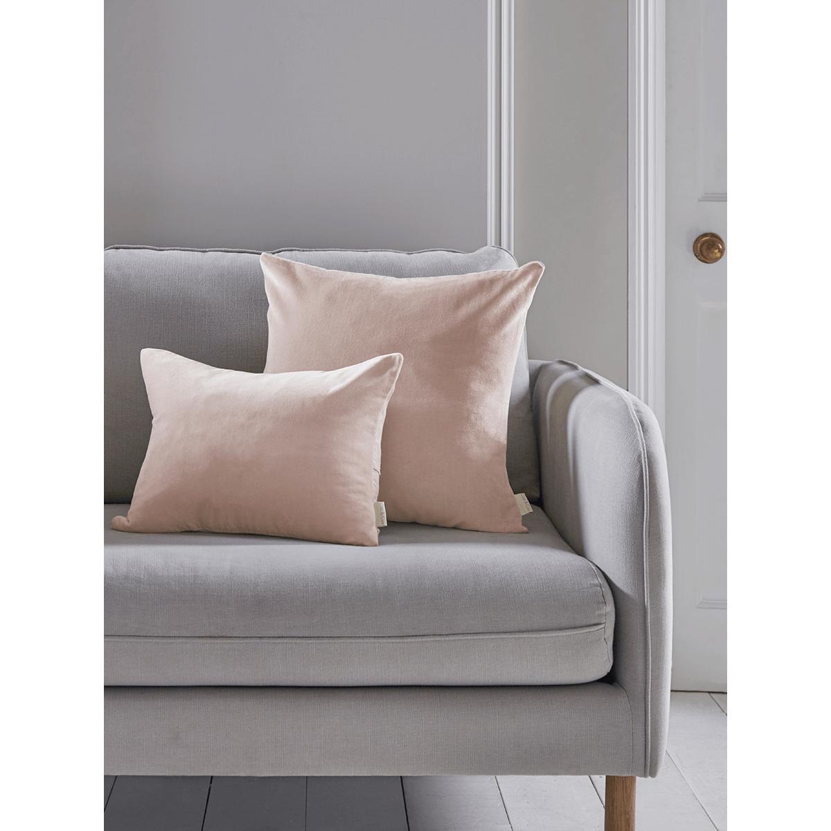 Fronted in luxuriously soft velvet with a natural colour linen reverse and three mother-of-pearl buttons, our bestselling velvet & linencushions are available in either a rectangular or a large square shape. Display on your favourite arm chair, or team different colours together and scatter across your sofa or bed. This product comes filled with a feather filled pad, which is made in the UK and give a beautiful, full shape to the cushion. Blush, a pearly feminine soft pink colour that works well as an accent colour for simple interiors.