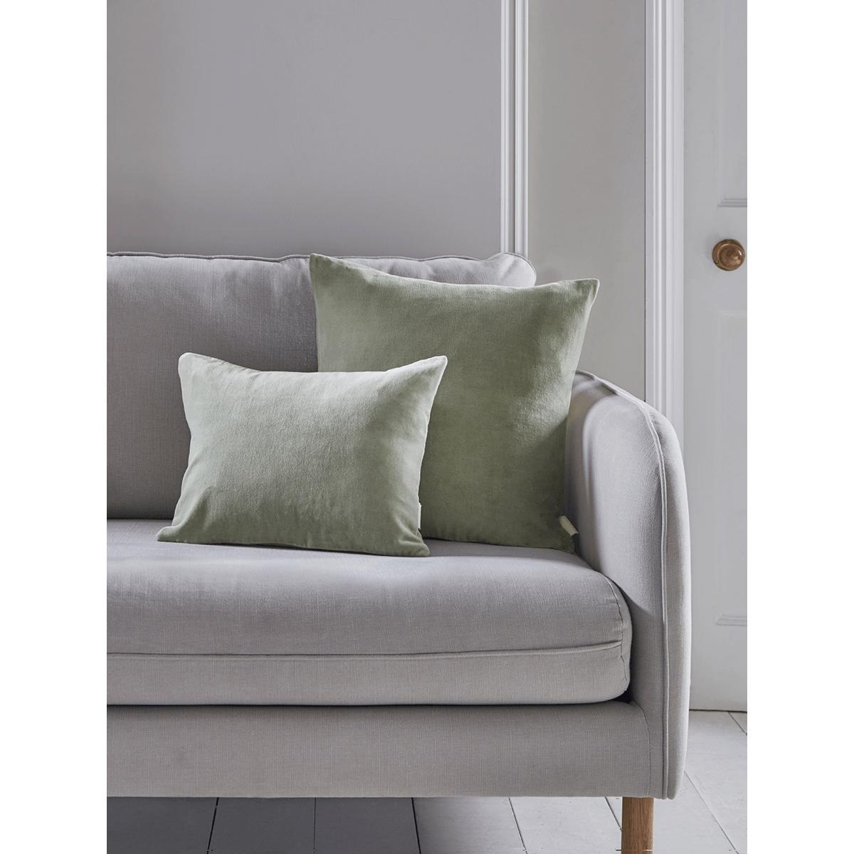 Fronted in luxuriously soft velvet with a natural colour linen reverse and three mother-of-pearl buttons, our bestselling velvet & linen cushions are available in either a rectangular or a large square shape. Display on your favourite arm chair, or team different colours together and scatter across your sofa or bed. Sage, a muted green shade which will add a calming, earthy tone to your interior.