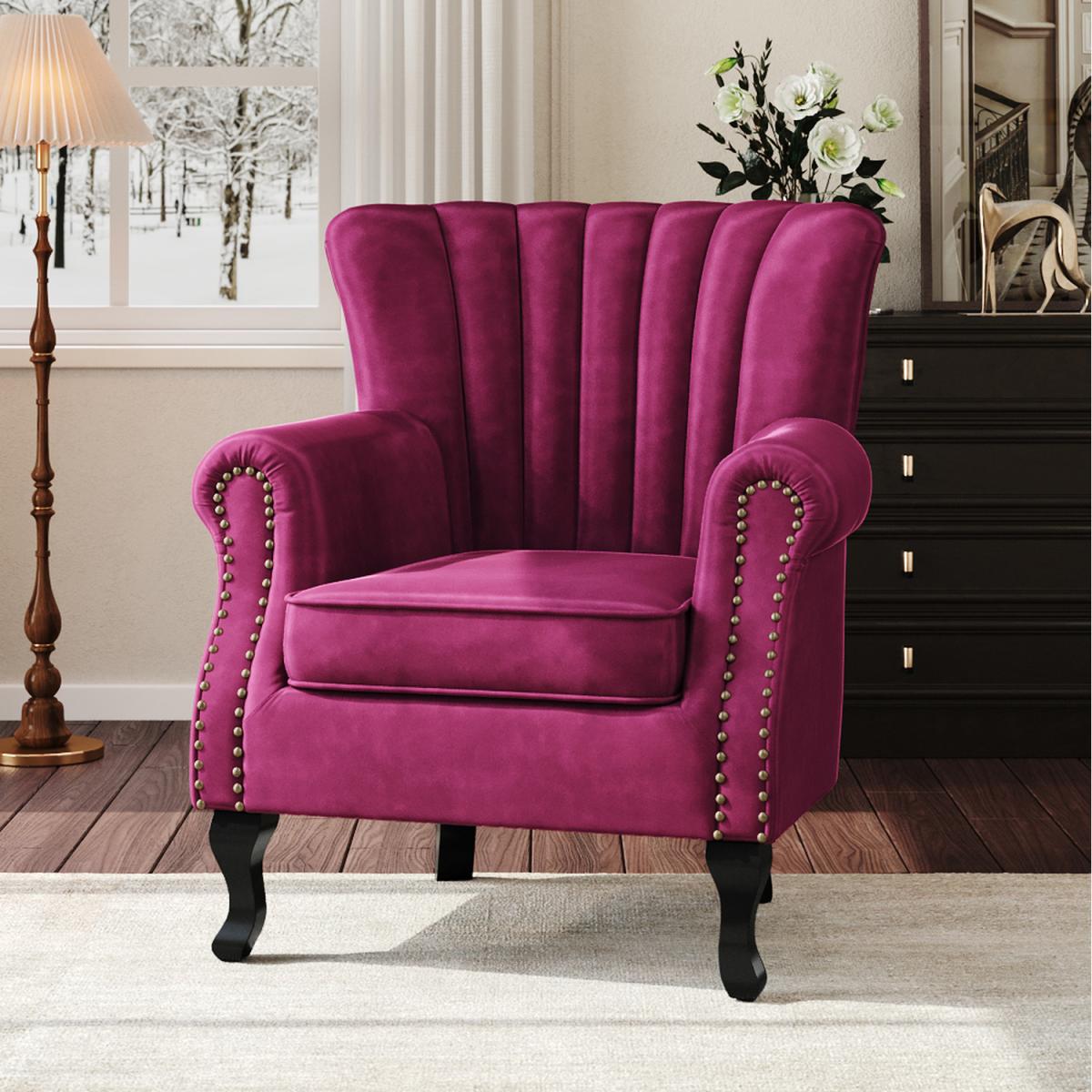 Velvet Armchair with Wingback and Studs Details - Wine Red