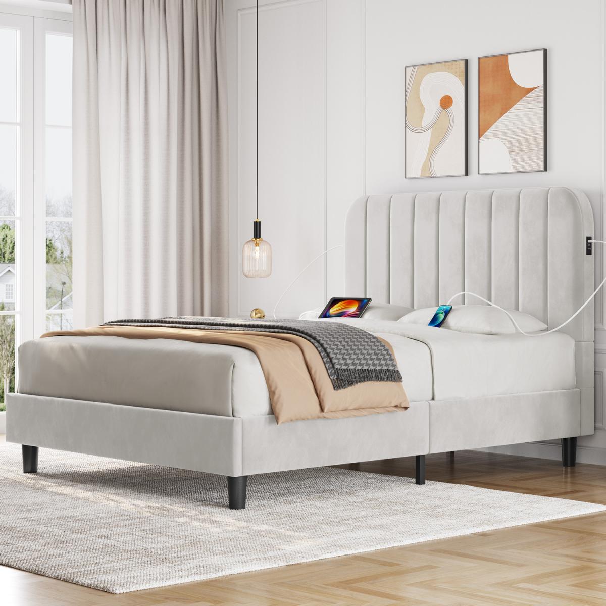 Transform your bedroom into a peaceful retreat with our upholstered bed that embodies comfort and simplicity. This bed is covered in luxurious velvet fabric that showcases varying colors depending on the angle and light. Upholstered with velvet fabric and dense foam padding, the headboard is comfortable to lean on for reading books or watching videos. Additionally, built-in USB ports (Type-A Type-C) on the headboard sides make it convenient to keep your devices charged while you sleep, simplifying your morning and evening routines. This bed's seamlessly connected headboard is adaptable to different height mattresses, eliminating any gap between the headboard and mattress.