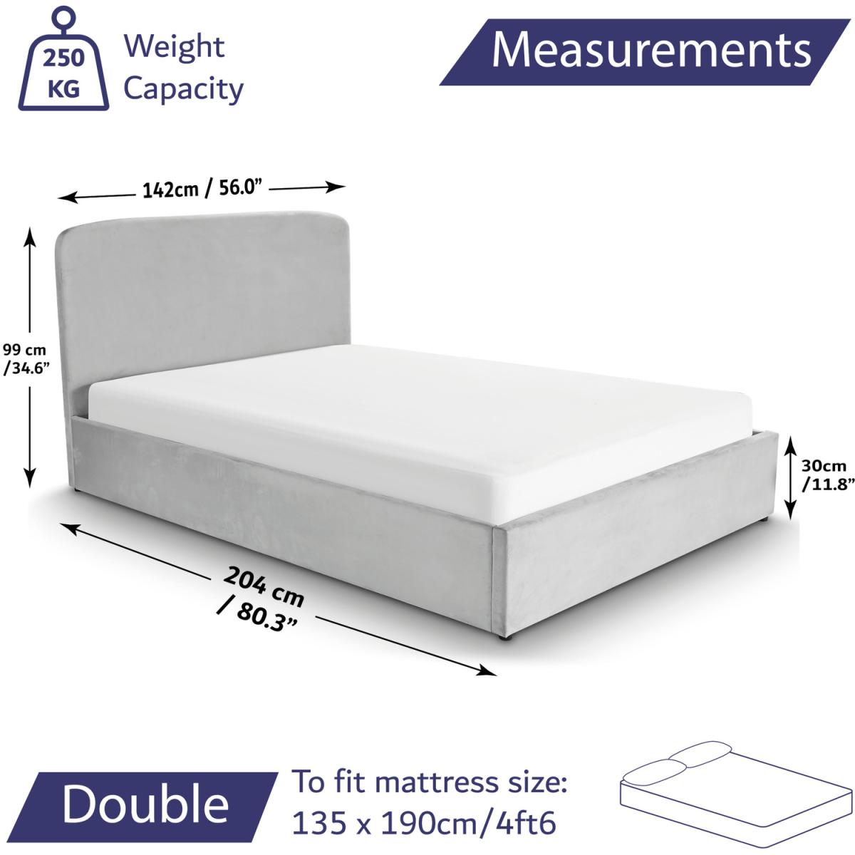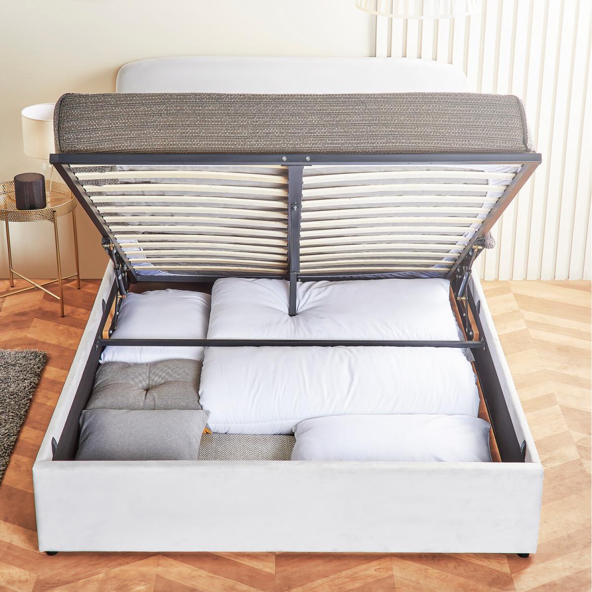 Deluxe feature headboard & footboard with plush padding makes the bed a standout piece in any bedroom. Upholstered in soft touch velvet premium fabric with an elegant silver-grey light sheen finish. Made with a strong steel internal frame with centre support beams and legs for stability. Sprung slats support and adapt to weight. Create extra space in your bedroom with large under-bed storage ottoman gas lift-up with easy access gas gas-assisted under-bed storage compartment. Purchase with or without mattress. Mattress option a thick 16cm luxury pocket sprung mattress with independent pocket springs to adapt to weight. Breathable cool touch hypoallergenic cover, anti-dust and anti-mite. High-density 400gsm foam top sleeping layer medium-firm rating.