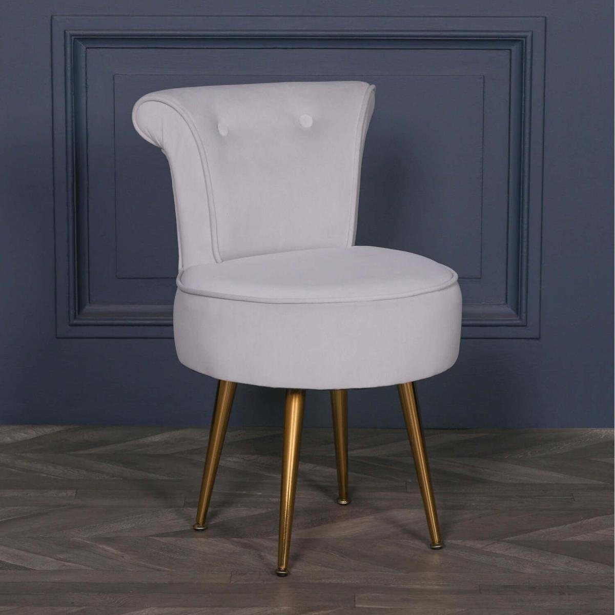 Light Grey Velvet Round Dressing Table Bedroom Chair With Gold Legs. The low, curved back of mid-century designs inspired this vanity stool. A modern chair is an excellent tool for creating statement seating in your bedroom. Please note, the gold plated legs may have various small marks or dimples in surface from manufacturing process