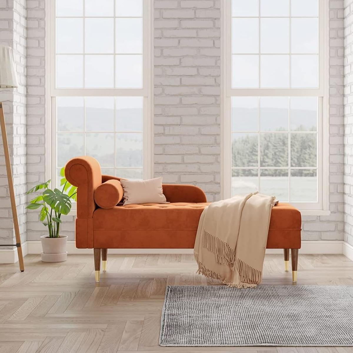 I love this orange velvet chaise because it brings a bold, tactile statement to any space. Its vibrant colour works particularly well in modern or eclectic interiors, especially when paired with neutral walls and understated accessories to let the sofa really stand out. The velvet finish adds a touch of luxury without feeling overly formal, making it versatile for both relaxed living rooms and more sophisticated spaces. Practical styling tips include pairing it with simple, muted cushions and a cosy throw for added comfort, and placing it near natural light to enhance the rich texture and colour. Its sleek, minimalist legs make it adaptable to various interior styles, from Scandi to contemporary, providing an eye-catching yet functional focal point.