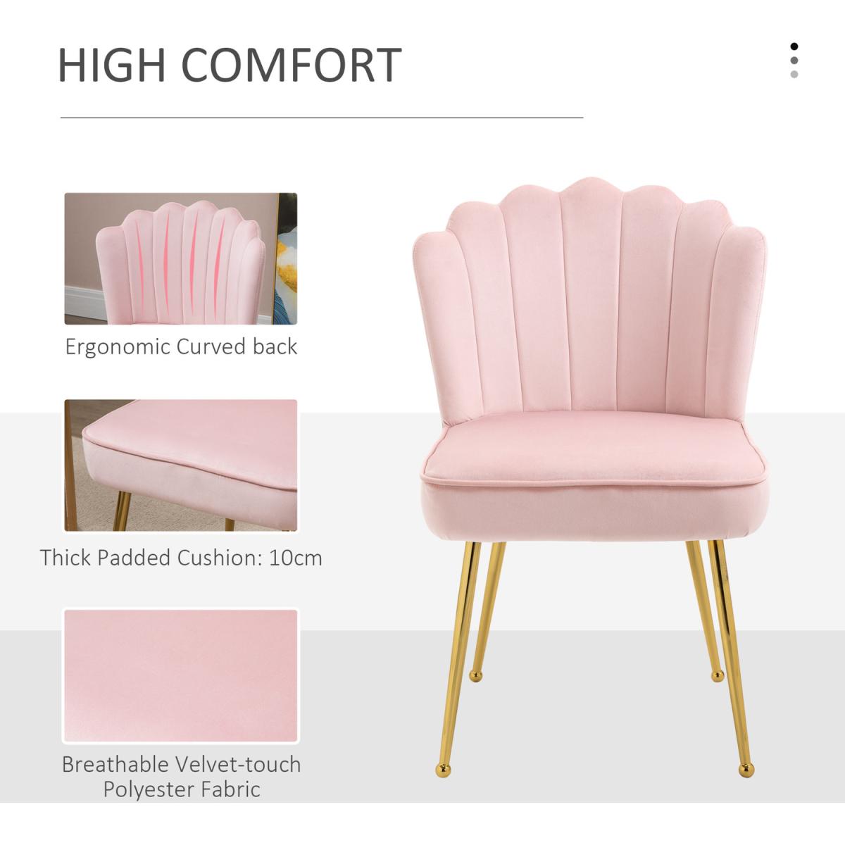 Take the shell-shaped back, and pair it with the velvet-feel upholstery and gold-tone legs for a beautiful combination - easy to transform your home/living space instantly. The seat and back are filled with sponge for comfort, with angled metal legs for full support when sat down. A beautiful way to read a book, lounge with a friend or simply enjoy time to yourself.