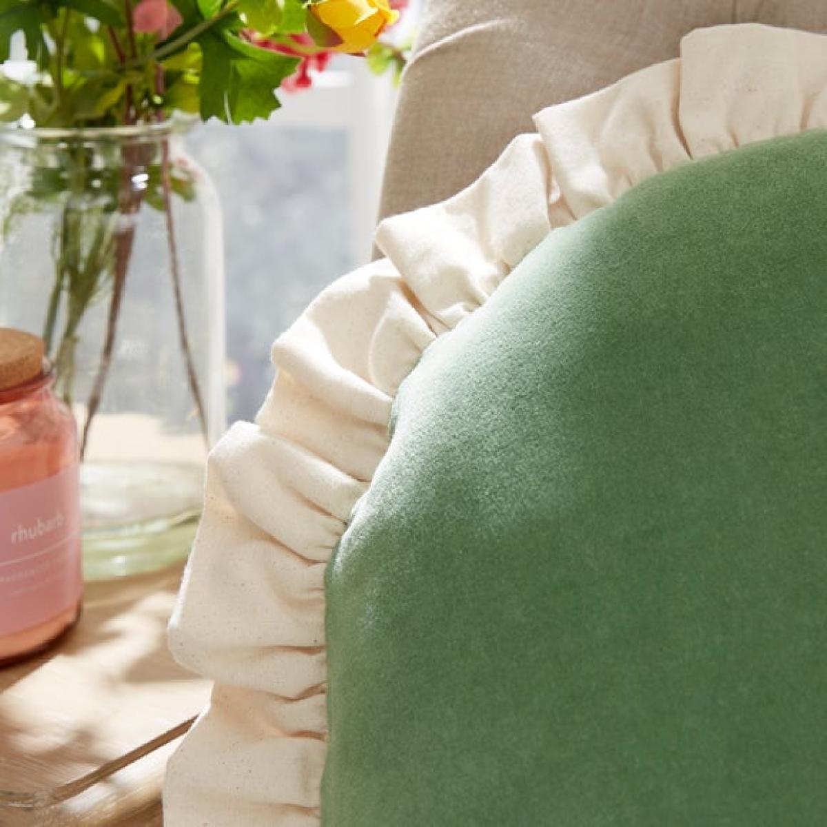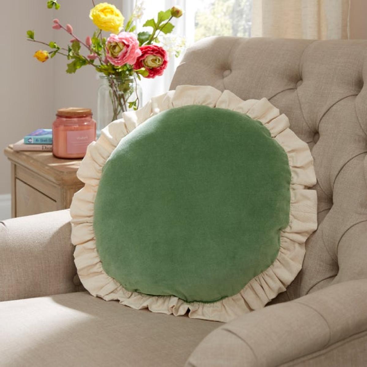* Unique round shape * Frill edge * Luxurious velvet * Spot clean only Round, plush, and packed with personality. This velvet cushion makes a standout statement with its unique shape and frilled edge. Soft, luxurious, and ideal for layering – just give it a gentle spot clean to keep it looking its best.