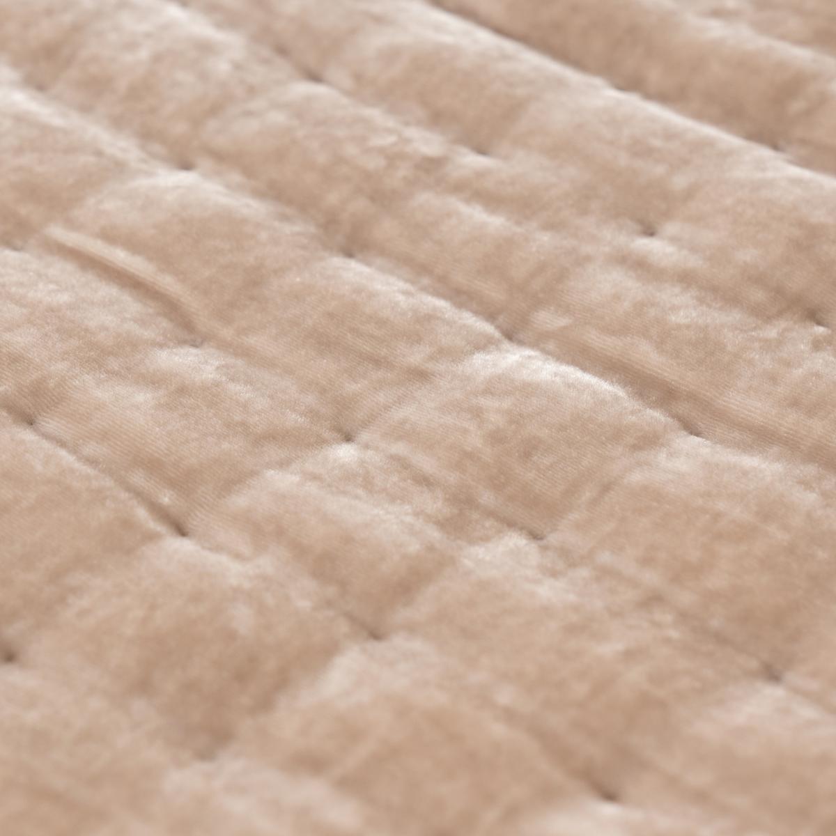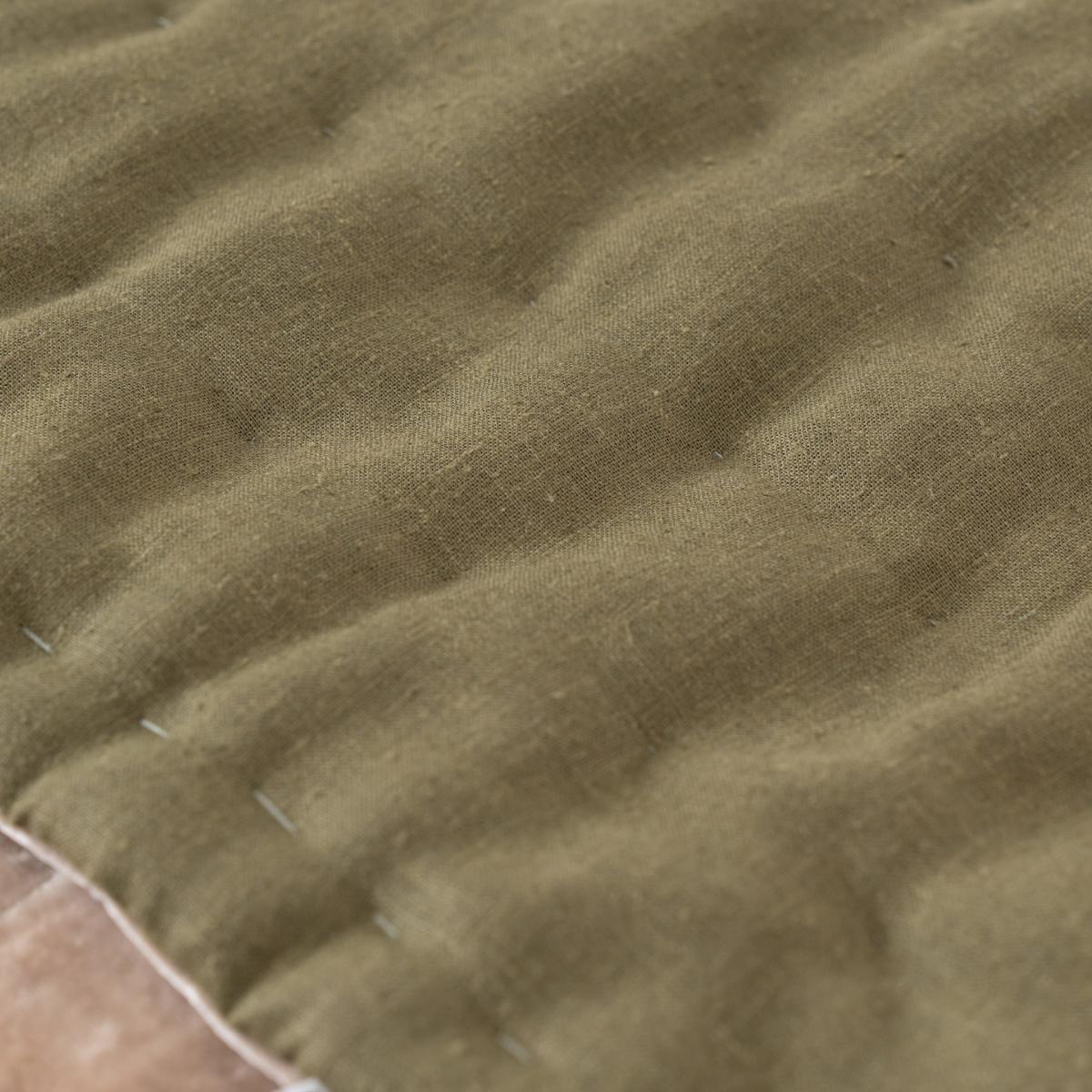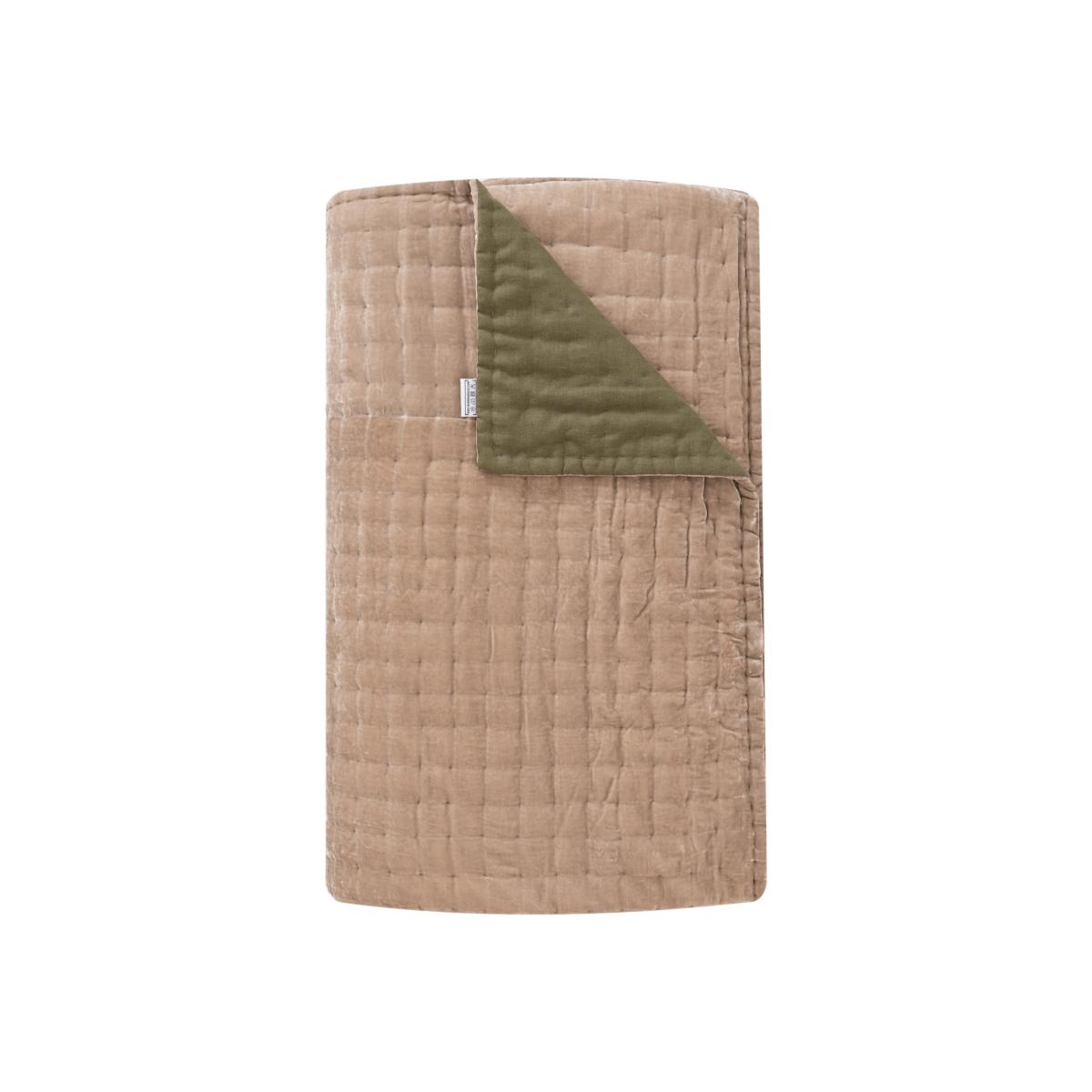 Velvet Hand Quilt Throw l Oat x Olive. Crafted from luxury velvet & linen fabric, perfect for coveted moments of relaxation, the inviting softness of the Annam House hand quilt is irresistible. Lending an extra layer of dream-like comfort to bedspreads or couches, its sumptuous luxury velvet plush call for lazy days with loved ones. H:240cm, W:260cm Storage bag included 65% Silk 35% Polyester Outer 100% Polyester filling100% Linen inner