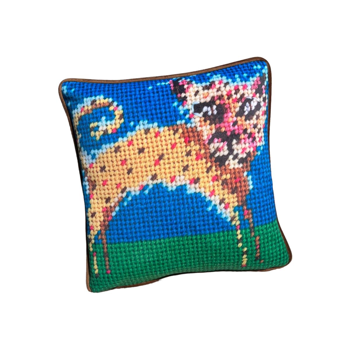 not needlepoint Uptown funk gon' give it to you. That's our only explanation for HAROLD and his pink spots. custom made with crazy heart and soul delivered new to you in eco friendly packaging remove pillow insert dry clean private label velvet, a fabric reproduction of our original needlepoint art finished in coca velvet designer velvet welting and reverse velvets are 100% polyester new feather down pillow insert invisible zipper