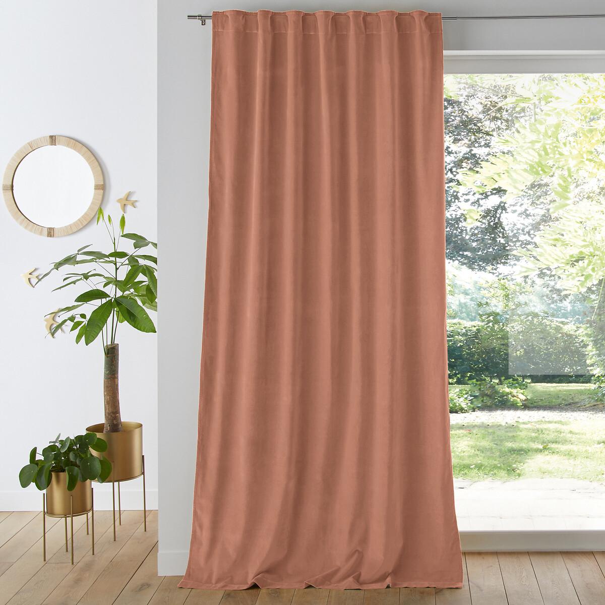 Bring colour, softness and style to your interior with this velvet curtain,: an excellent cut and superior finish for a truly luxury product!Warm and elegant, velvet is a soft, silky fabric with a tactile appearance. The tabs give a regular wave to the curtain and an impeccable straight fall. Hidden behind the fabric for an impeccable finish, they also hide the rod. Product Details • Screening • 100% cotton, 230g • Velour • Top finish : hidden legs • Finished bottom :Plain hemmed edging. To help you in the choice and maintenance of your curtains, do not hesitate to consult our guide by typing "Curtain Buying Guide" in our search engine on the site. Care Advice • Machine washable at 30°C • Maximum shrinkage after washing : Approximately 5 to 7%. Fabrics made from natural fibres may shrink in the first wash. Always wash your curtains before making any alterations. • Do not tumble dry • If you don't need to iron them (linen curtains, Voile Panel...), let the curtains air dry by hanging them immediately after washing, making sure to spread them out to their full width. • If you want to iron your curtains, we recommend using a low-temperature steam iron or a steamer. Dimensions • Drop 180 x W135cm • D220 x W135cm • D260 x W135cm • Drop 300 x W135cm • Drop 350 x W135cm • OEKO-TEX® Standard 100. Standard 100 certification by OEKO-TEX® tests textile products for harmful substances via an independent, international label.
