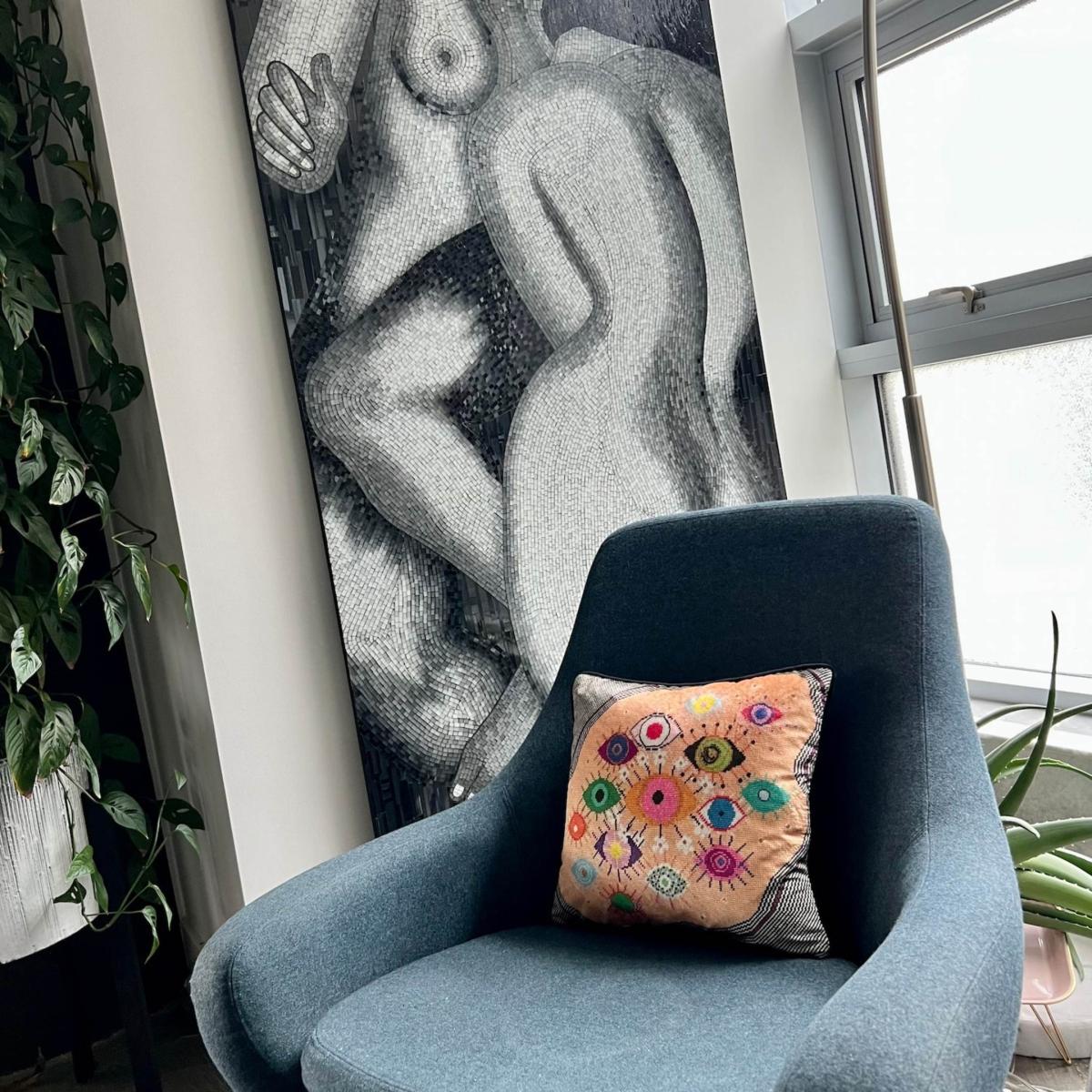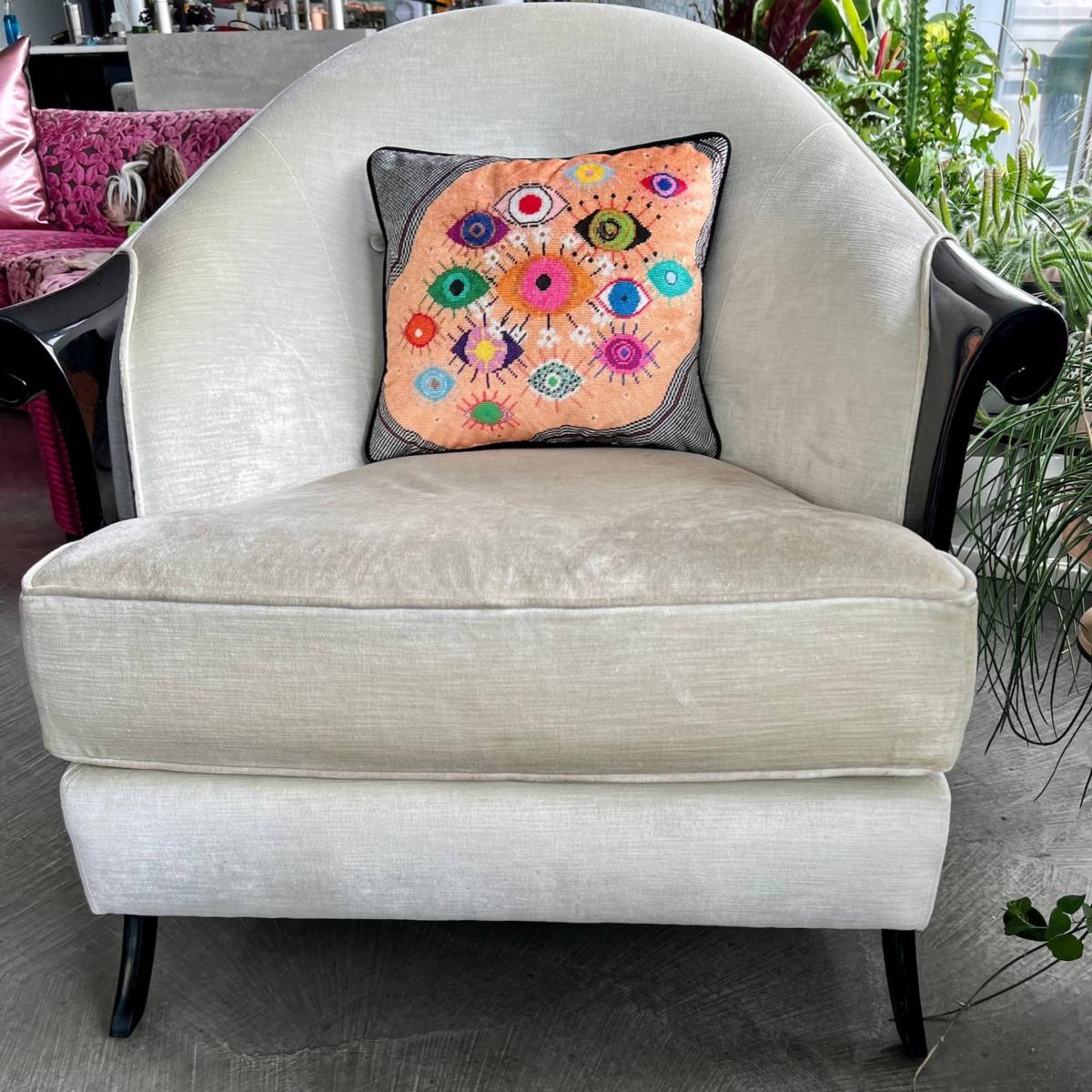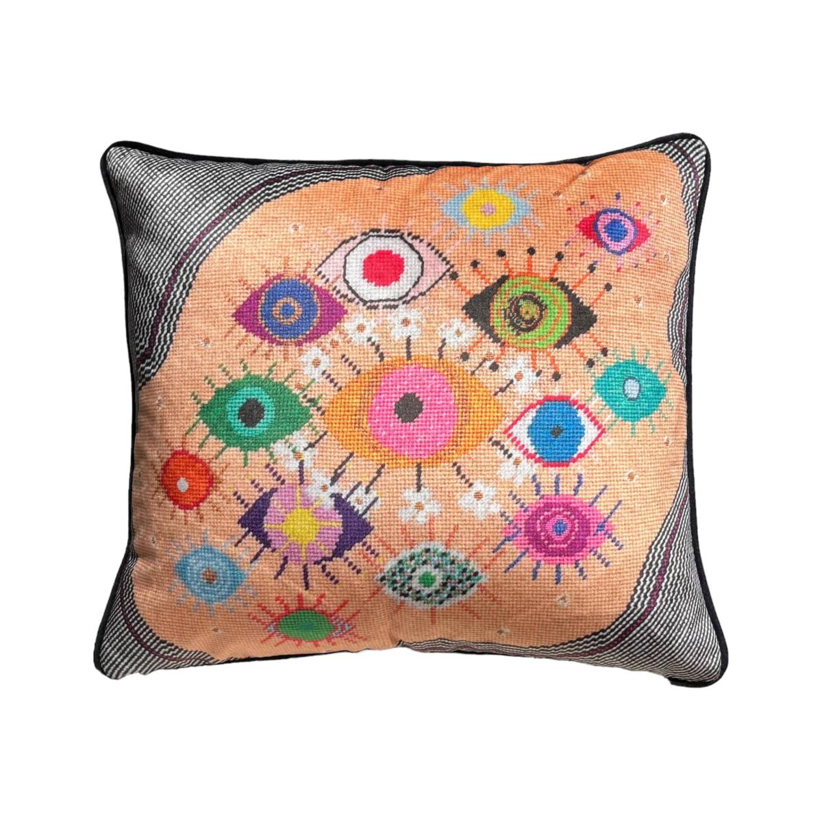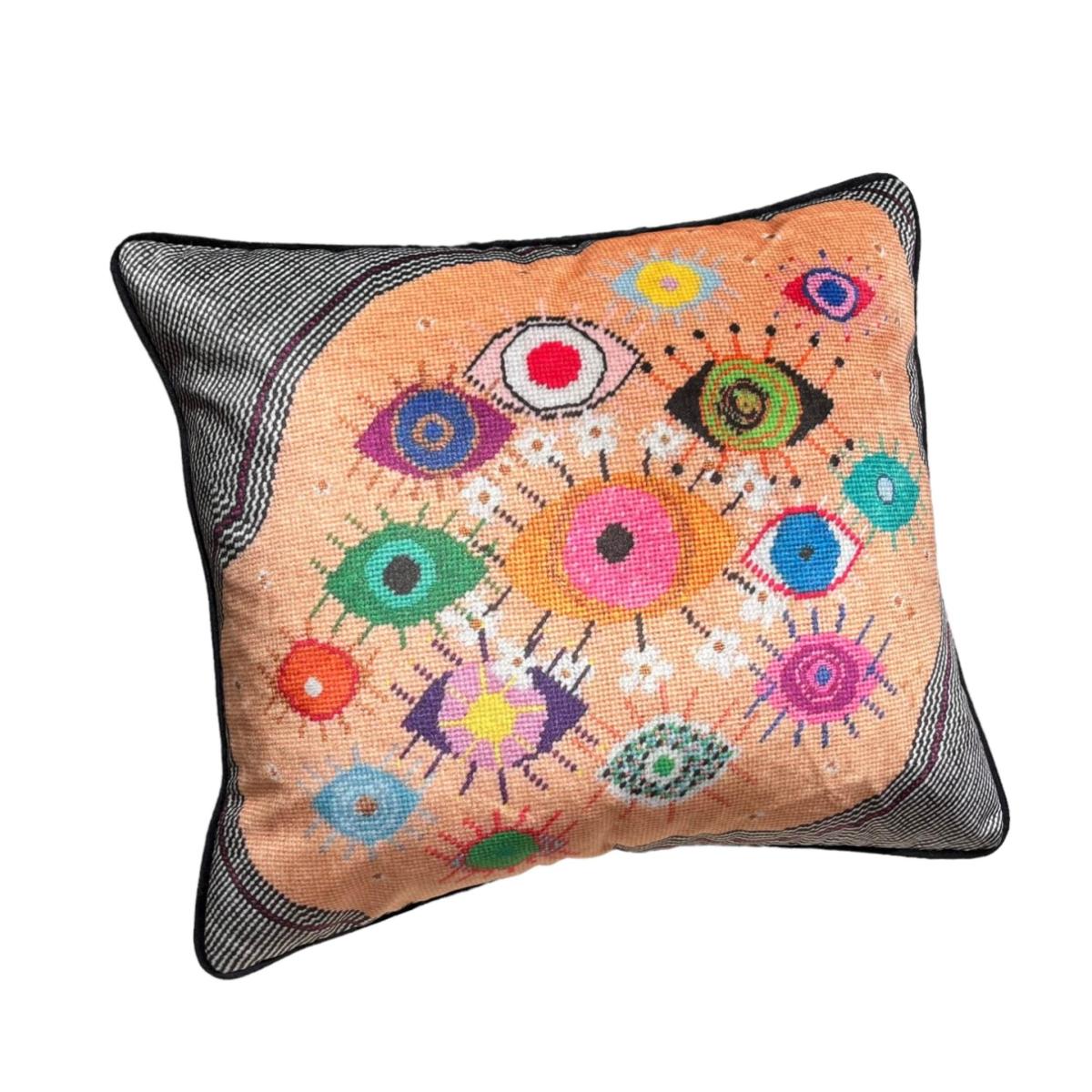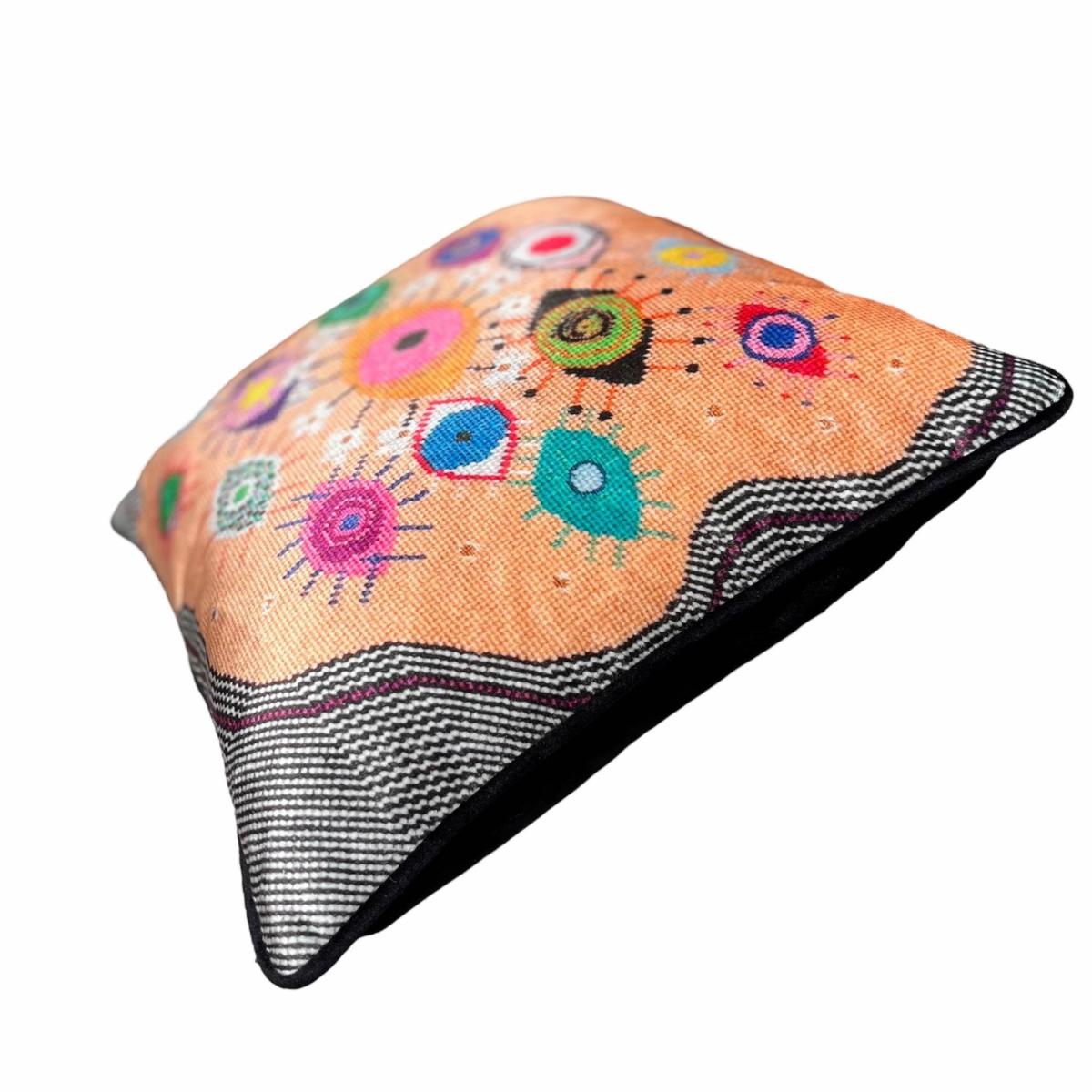 Where do we begin? IdolEYE S is spectacular! Every orb possesses its own identity, like an individual piece of art, presented in a fantastical, imaginative form. Sunbeam iris. Hitchcock vertigo. Candy-coated almonds and daisy eyelashes with the tiniest gold disc florets. All framed in a lyrical black and white ice cream swirl with a singular, wacky whirl of twilight lavender. The myriad of colors make this pillow art at home in any room. custom made with crazy heart and soul delivered new to you in eco-friendly packaging