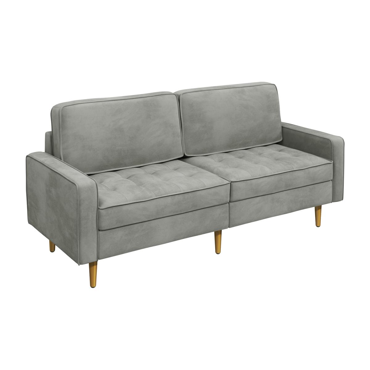 This elegant two-person couch is designed to elevate the aesthetics of your interior space with its captivating deep biscuit tufting, gold-tone tapered legs, and luxurious silky velvet upholstery. It effortlessly blends modern glamour into any room. The wide square arms, fiberfill back pillows, and thick foam-filled seats ensure comfortable seating for various activities like cozy movie nights or engaging conversations. Its compact size and track arm design make it a smart choice for smaller spaces like one-bedroom apartments, condos, or offices.