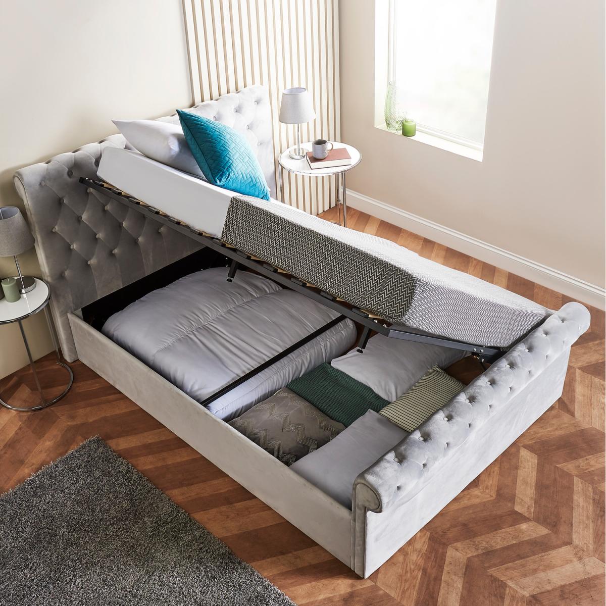 Upholstered in a beautiful grey two-tone brushed velvet in sleigh design with buttons. This ottoman storage bed frame will make a statement in any bedroom interior. Create extra space in your bedroom with a huge capacity under-bed storage compartment. Install Left or Right facing side lift. Fabric base included. Extra padded headboard, base & sides with sprung wooden slats to absorb body and mattress weight. Made from the highest quality materials including the strong centre support beams, slats and extra middle support legs. Pocket Sprung Mattress Option 16cm thick with independent pocket springs to adapt to weight, high-density foam sleeping layer - medium firm rating, hypoallergenic anti-dust and anti-mite cool touch cover.