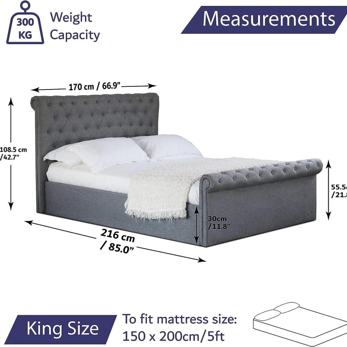 Upholstered in a beautiful grey two-tone brushed velvet in sleigh design with buttons. This ottoman storage bed frame will make a statement in any bedroom interior. Create extra space in your bedroom with a huge capacity under-bed storage compartment. Install Left or Right facing side lift. Fabric base included. Extra padded headboard, base & sides with sprung wooden slats to absorb body and mattress weight. Made from the highest quality materials including the strong centre support beams, slats and extra middle support legs. Pocket Sprung Mattress Option 16cm thick with independent pocket springs to adapt to weight, high-density foam sleeping layer - medium firm rating, hypoallergenic anti-dust and anti-mite cool touch cover.
