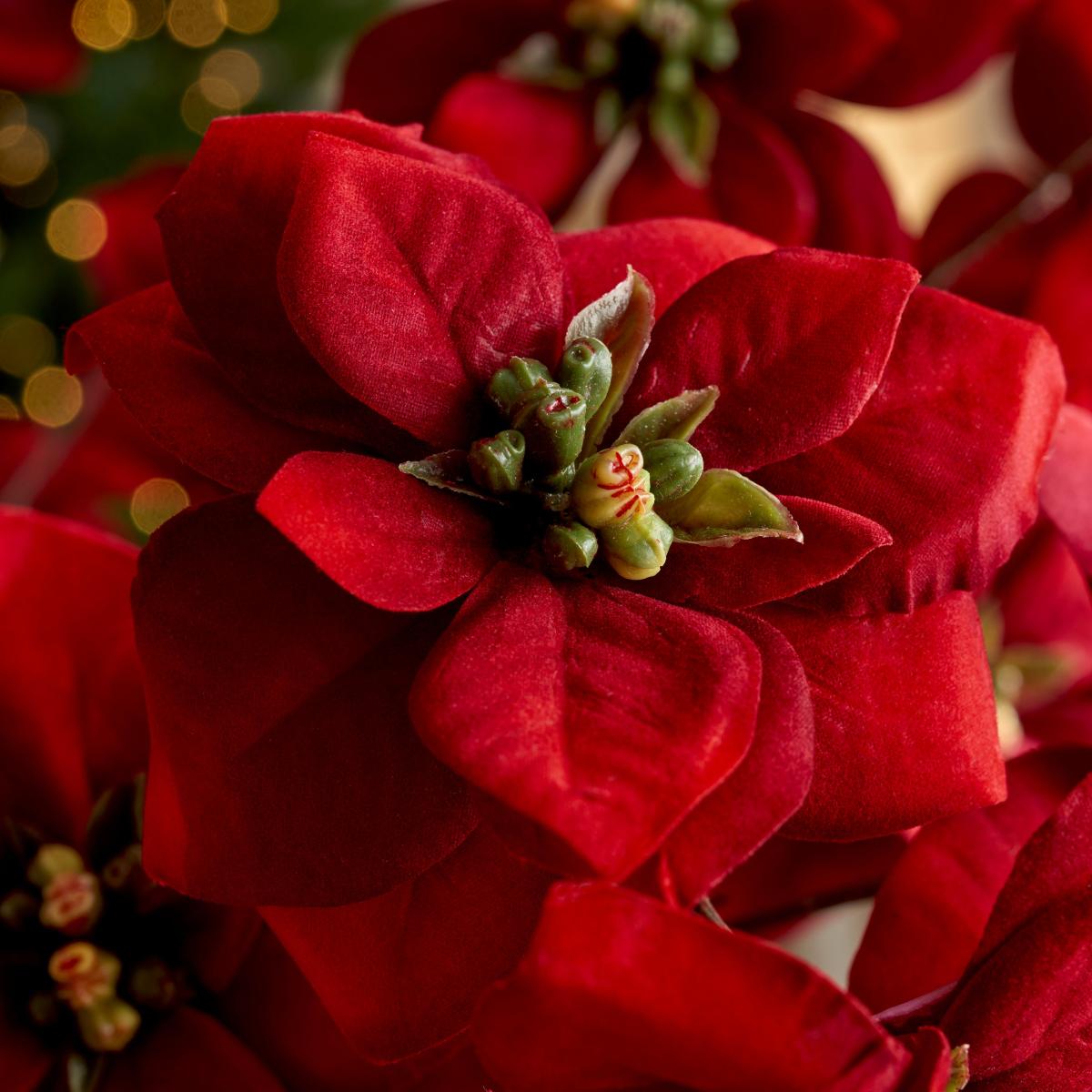 Perfect to use in a festive floral arrangement, this realistic velvet poinsettia spray requires no maintenance and comes in a stunning eye catching red velvet.
