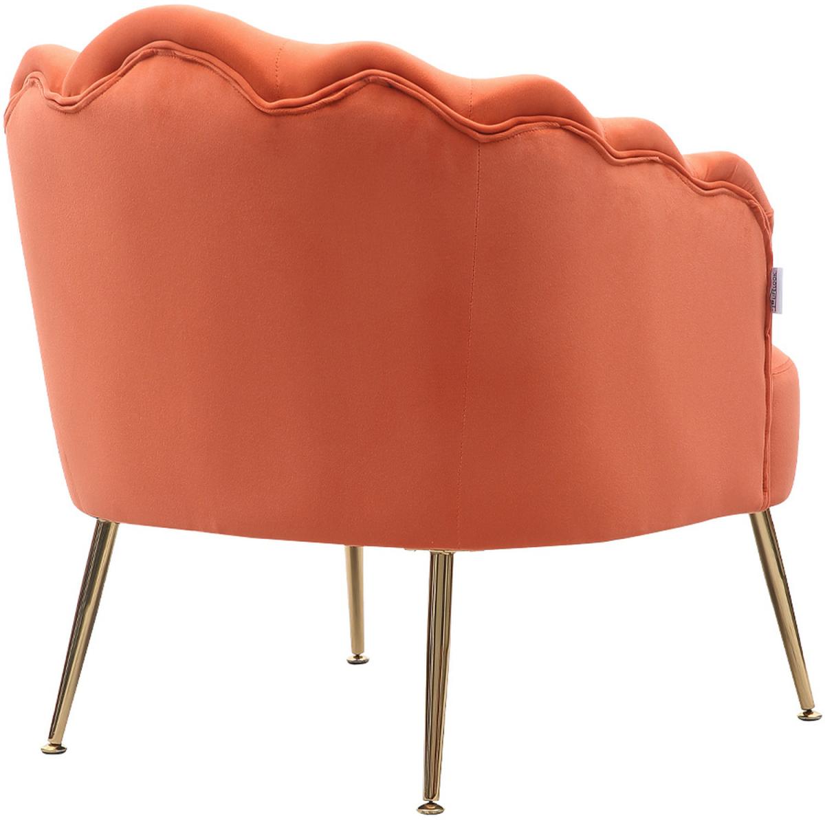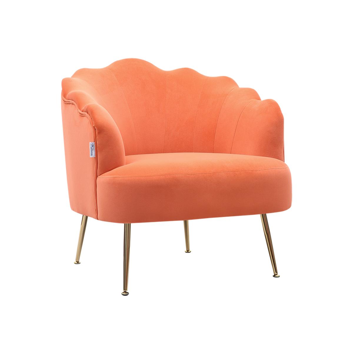 Bring the charm of fashion to your living space with this accent chair in the shape of a shell. Featuring a gently curved silhouette and ergonomic backrest, the tub chair delivers a luxurious seating experience due to its soft velvet fabric and dense foam filling. Supported by gold metal legs with protected footpads, this chair is not only good-looking and durable but also top-notch comfort.