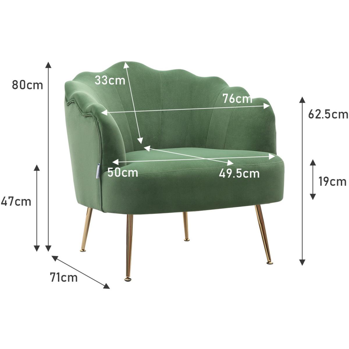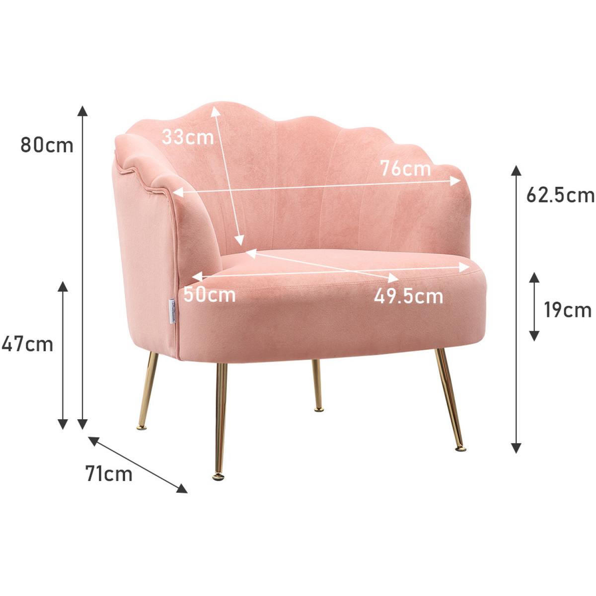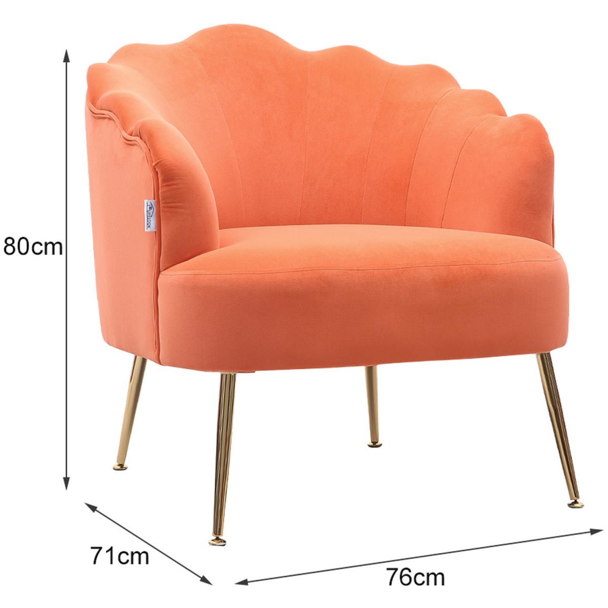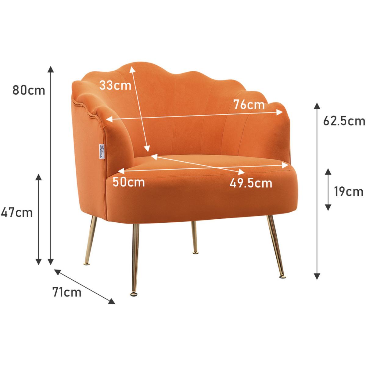 Bring the charm of fashion to your living space with this accent chair in the shape of a shell. Featuring a gently curved silhouette and ergonomic backrest, the tub chair delivers a luxurious seating experience due to its soft velvet fabric and dense foam filling. Supported by gold metal legs with protected footpads, this chair is not only good-looking and durable but also top-notch comfort.