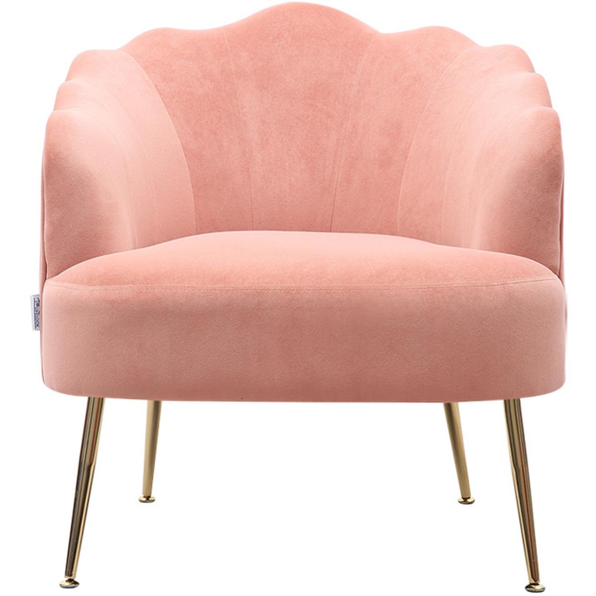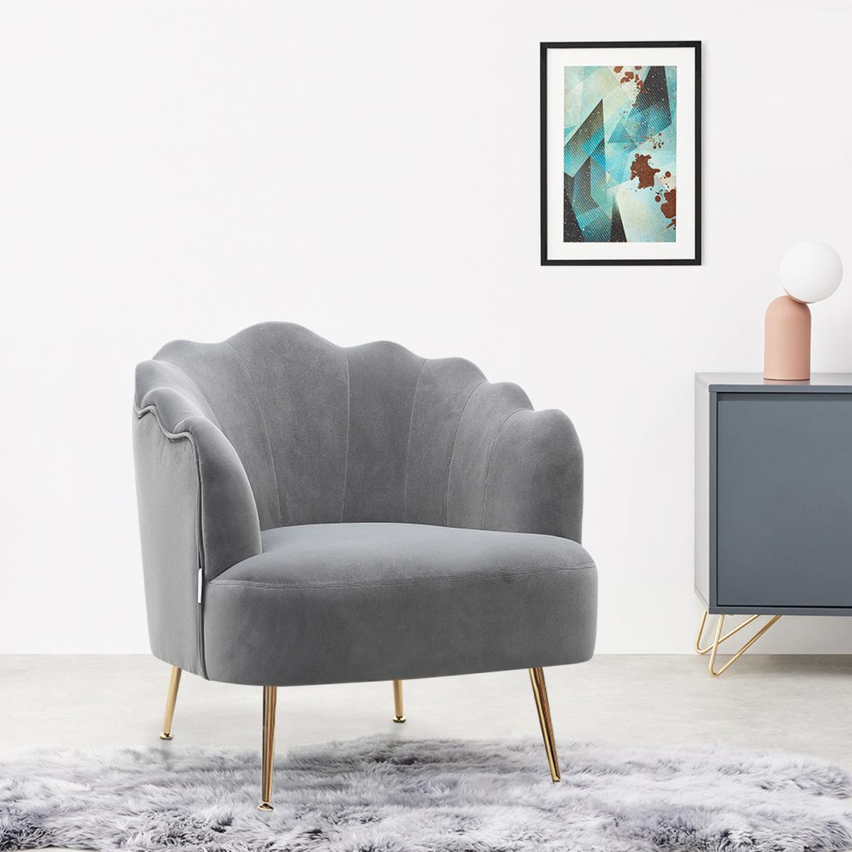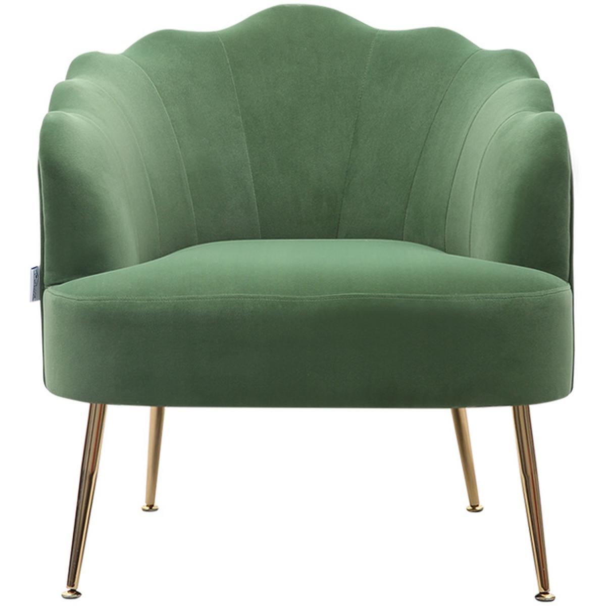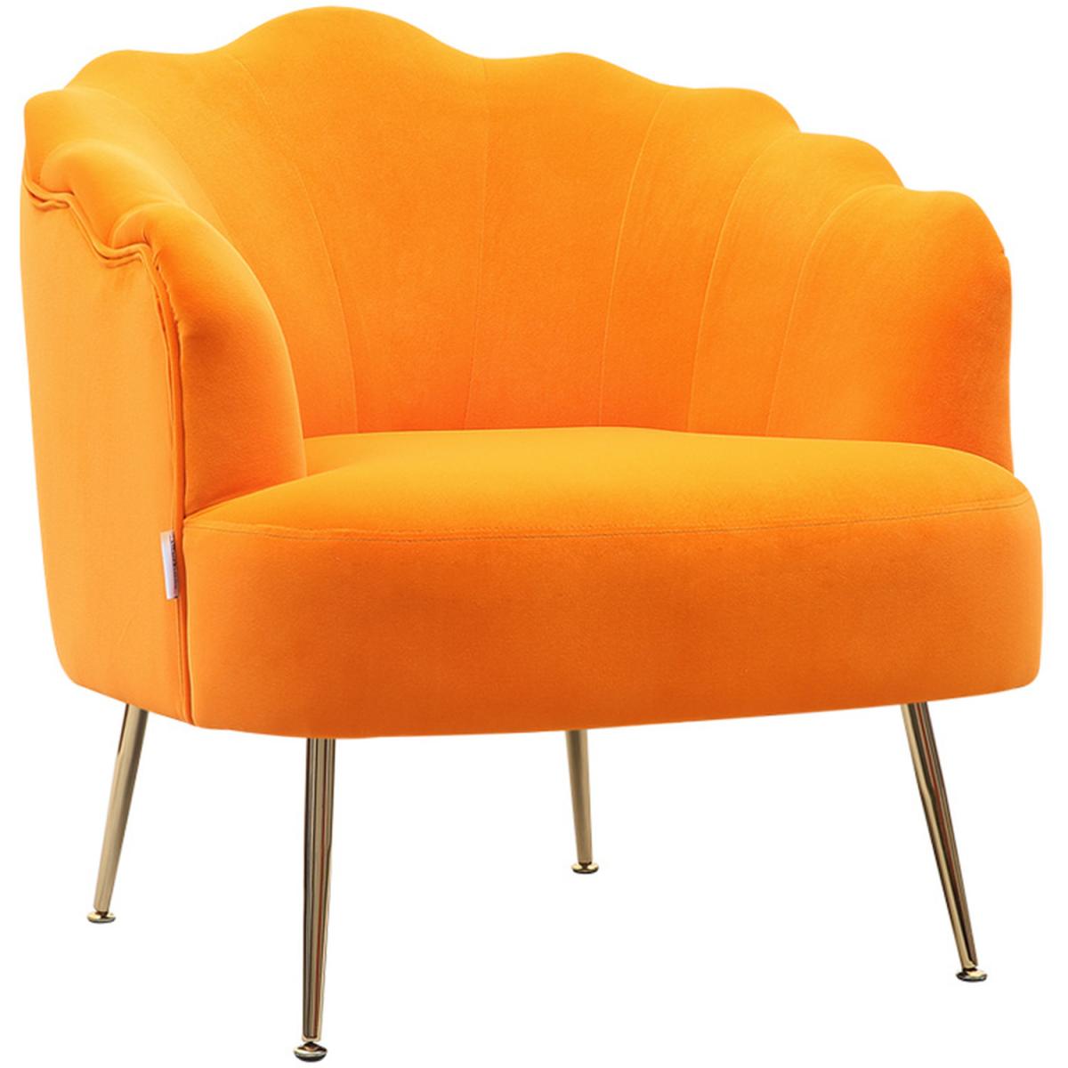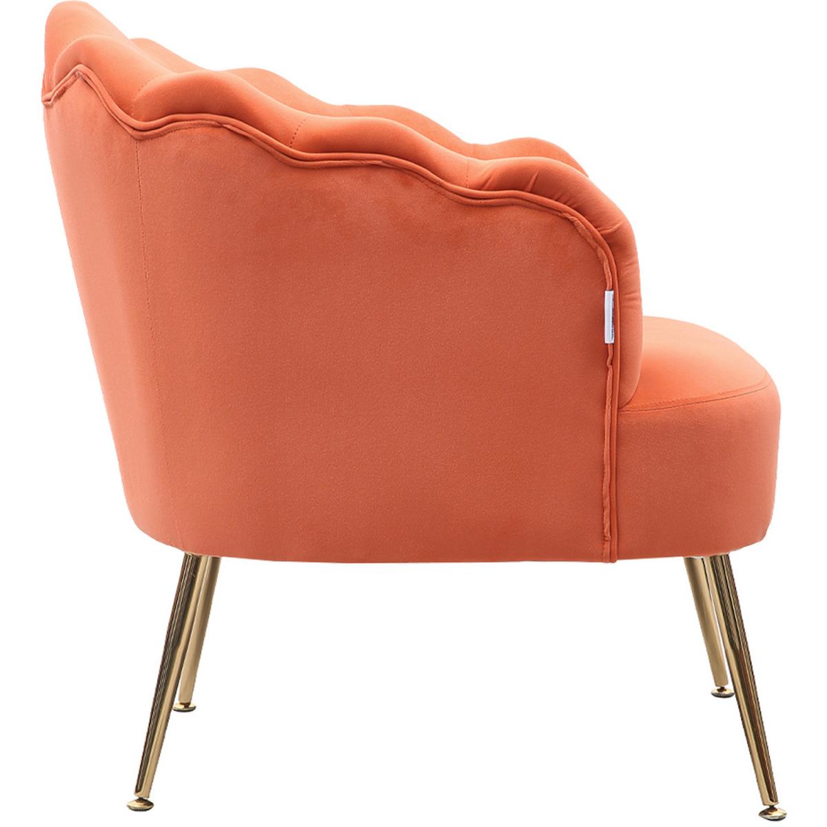 Bring the charm of fashion to your living space with this accent chair in the shape of a shell. Featuring a gently curved silhouette and ergonomic backrest, the tub chair delivers a luxurious seating experience due to its soft velvet fabric and dense foam filling. Supported by gold metal legs with protected footpads, this chair is not only good-looking and durable but also top-notch comfort.