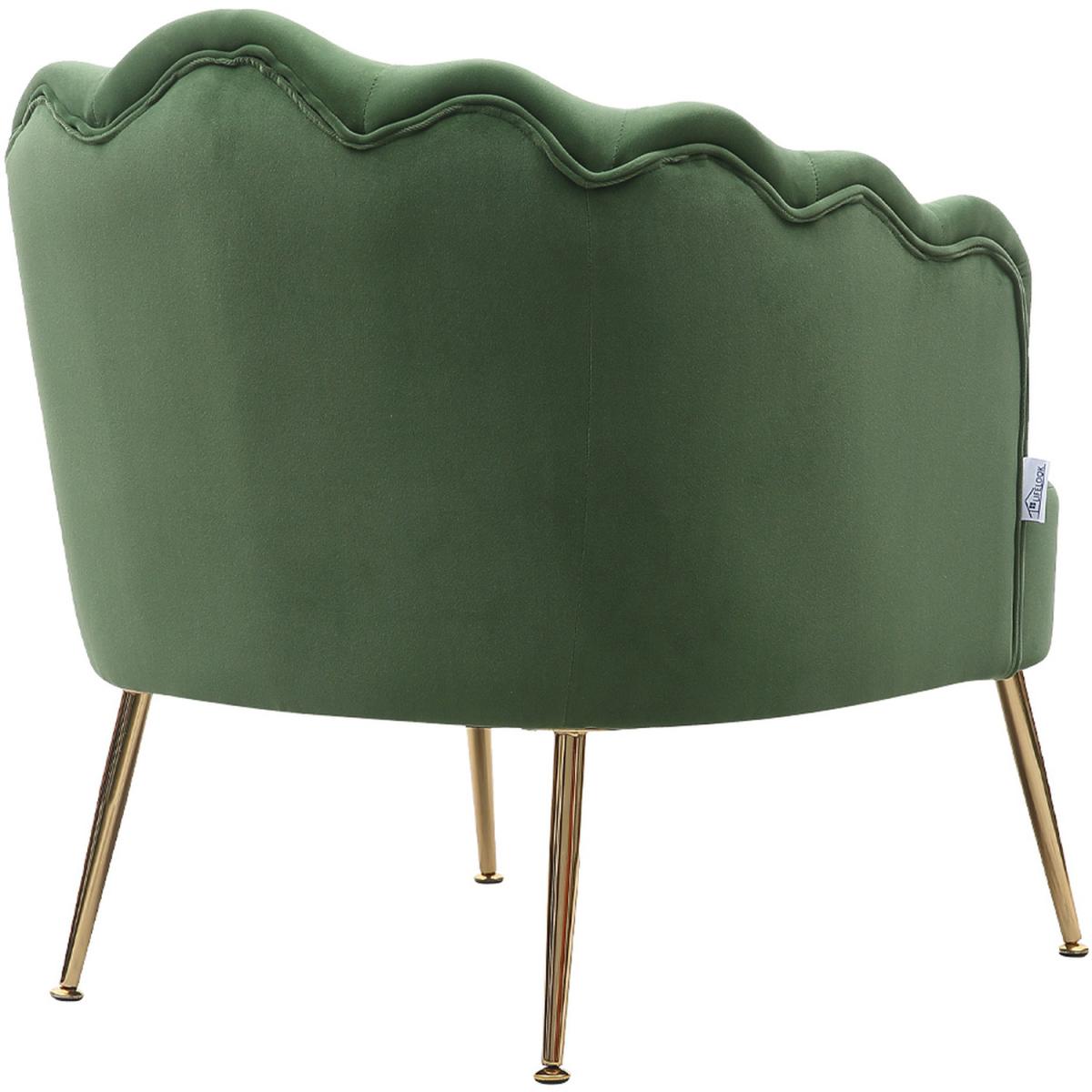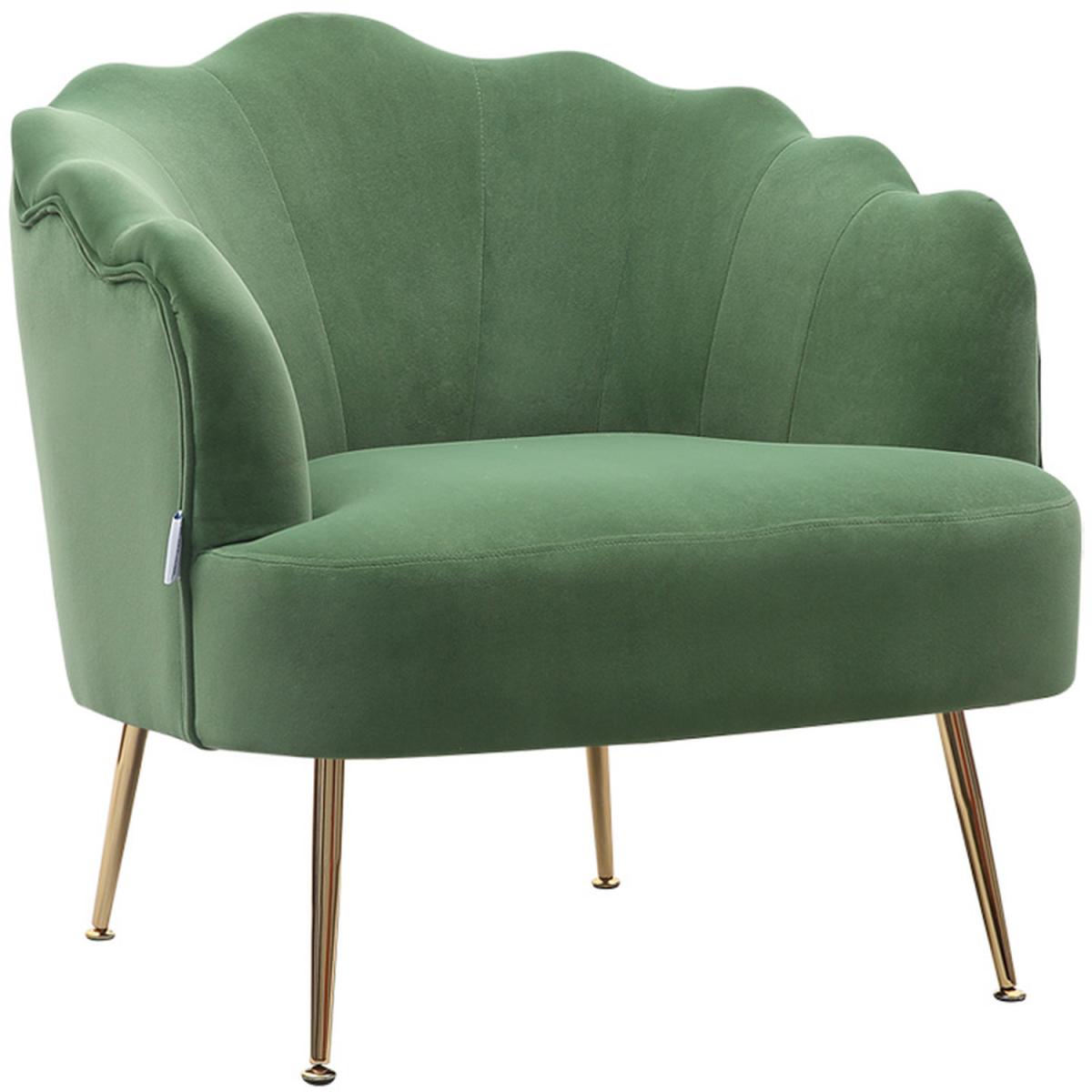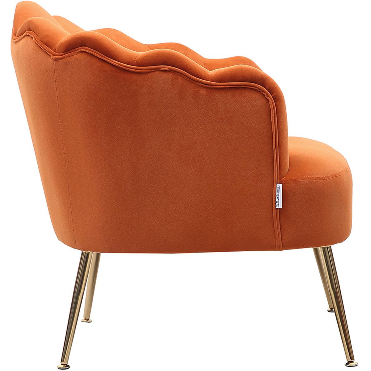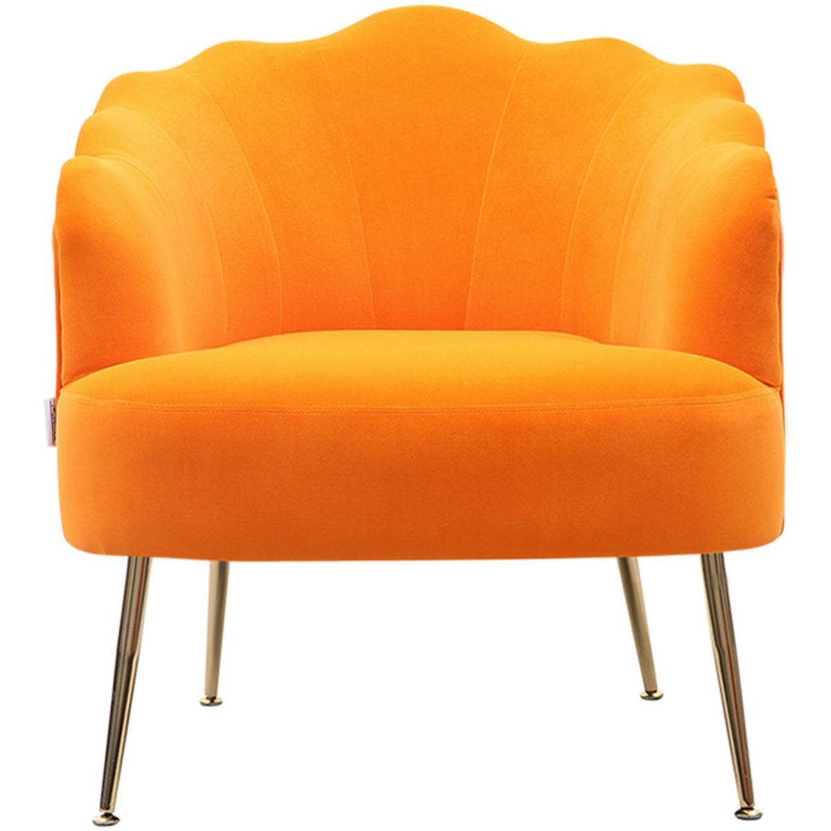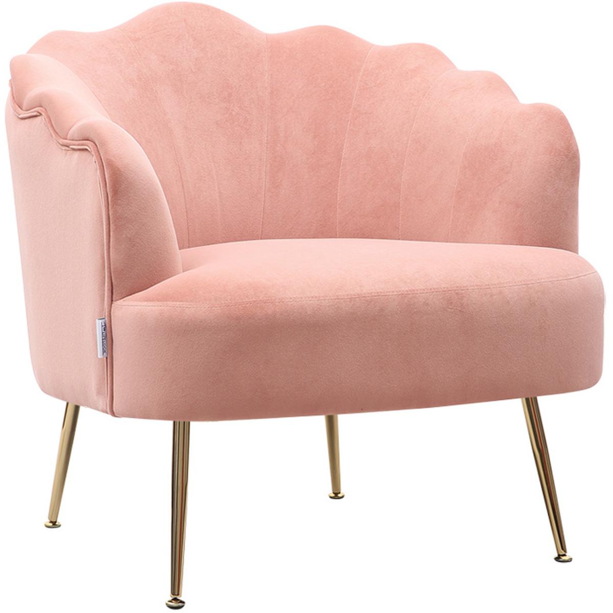 Bring the charm of fashion to your living space with this accent chair in the shape of a shell. Featuring a gently curved silhouette and ergonomic backrest, the tub chair delivers a luxurious seating experience due to its soft velvet fabric and dense foam filling. Supported by gold metal legs with protected footpads, this chair is not only good-looking and durable but also top-notch comfort.