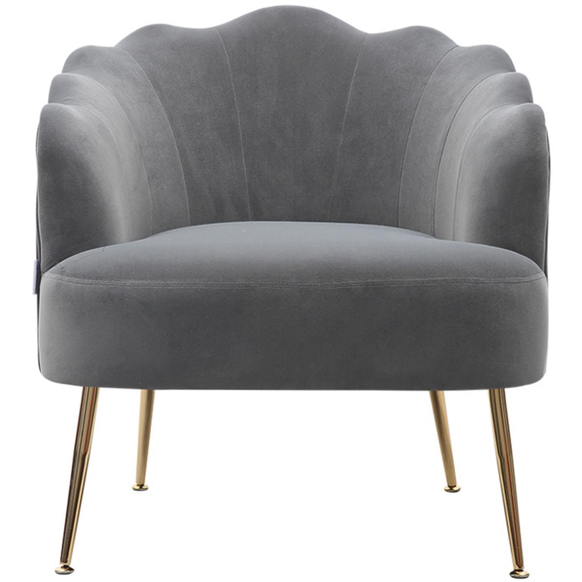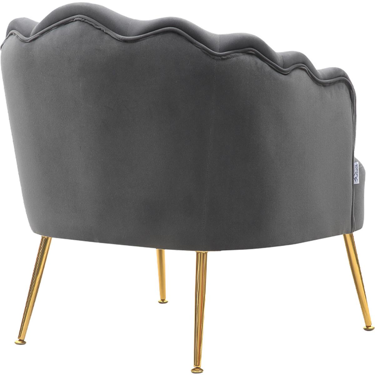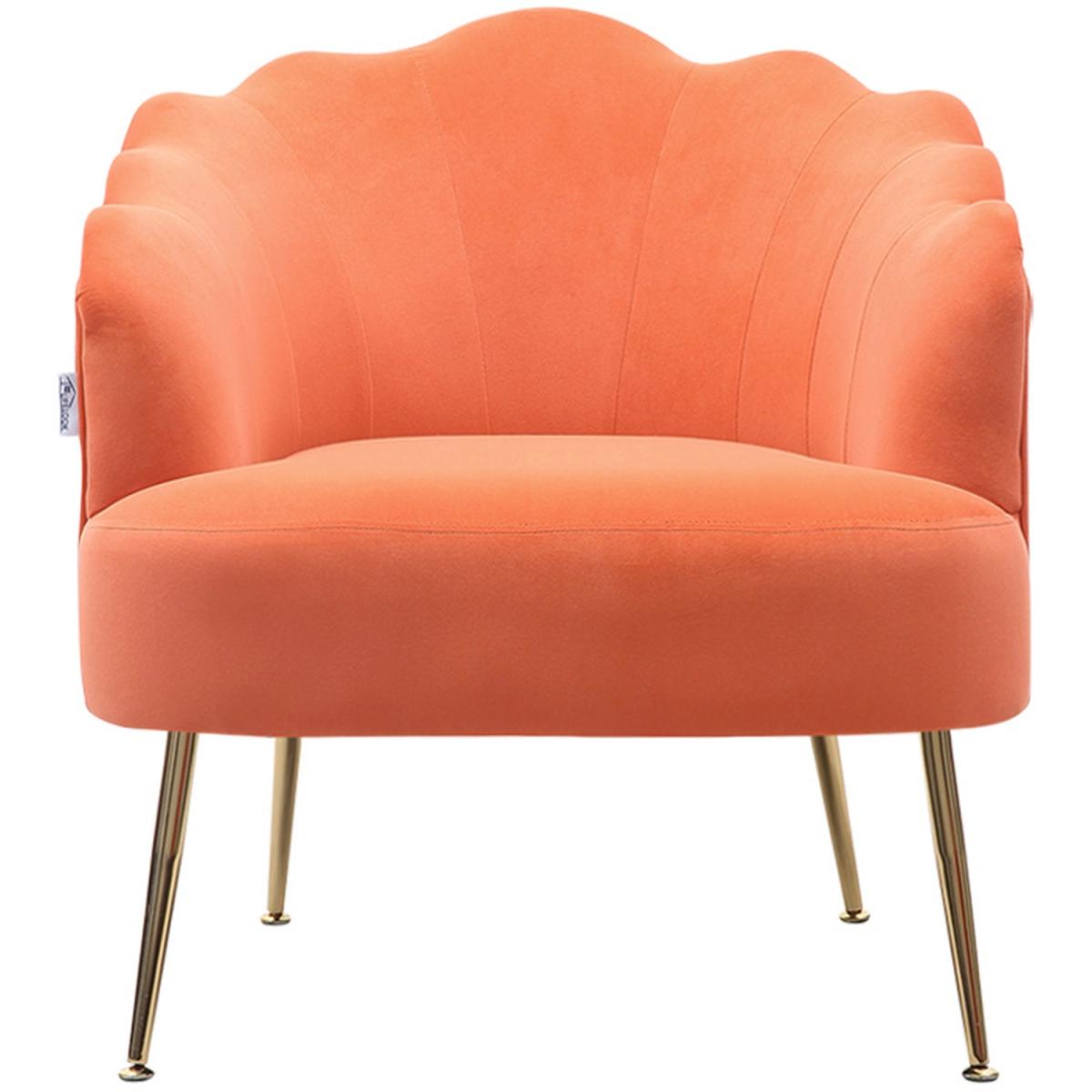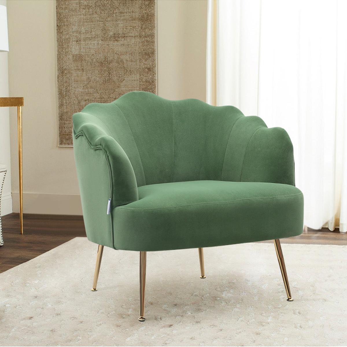 Bring the charm of fashion to your living space with this accent chair in the shape of a shell. Featuring a gently curved silhouette and ergonomic backrest, the tub chair delivers a luxurious seating experience due to its soft velvet fabric and dense foam filling. Supported by gold metal legs with protected footpads, this chair is not only good-looking and durable but also top-notch comfort.