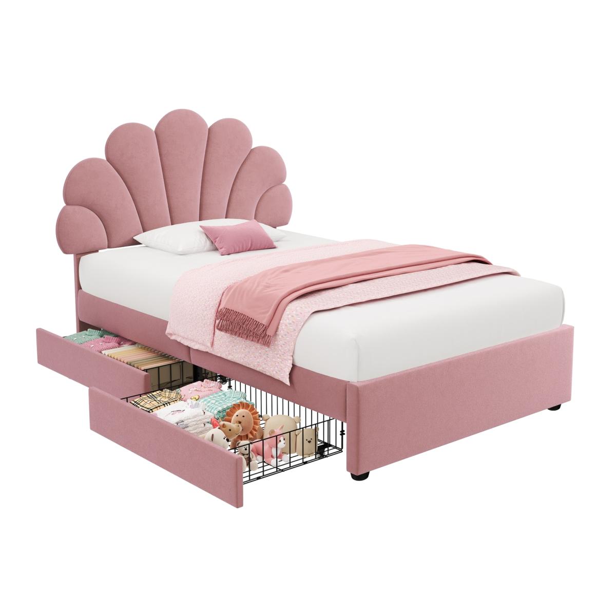 Introduce a touch of charm and practicality to any bedroom with this beautiful pink velvet upholstered 3ft single bed frame. Designed with a unique, adjustable chic petal headboard, it creates a stylish focal point whilst offering comfortable back support. The soft-to-the-touch velvet fabric enhances the cosy feel. Beneath the frame, two integrated storage drawers provide essential space for bedding, clothes, or toys, and can be flexibly positioned to suit your room layout. Constructed from a robust metal and wood frame with solid slats, this bed provides stable support and eliminates the need for a separate box spring, making mattress placement straightforward. Perfect for adding a touch of elegance, comfort, and clever storage to a child's room or guest bedroom.