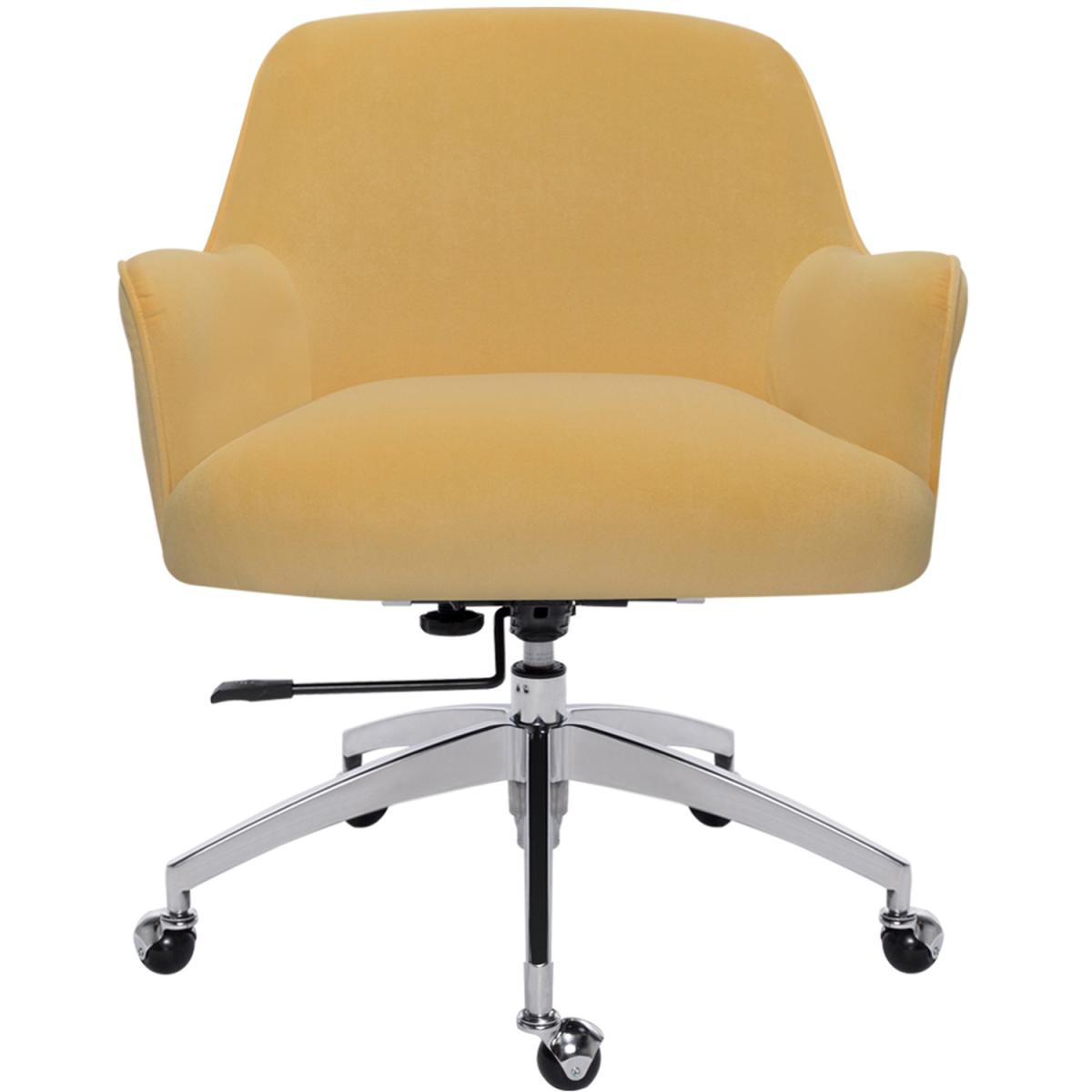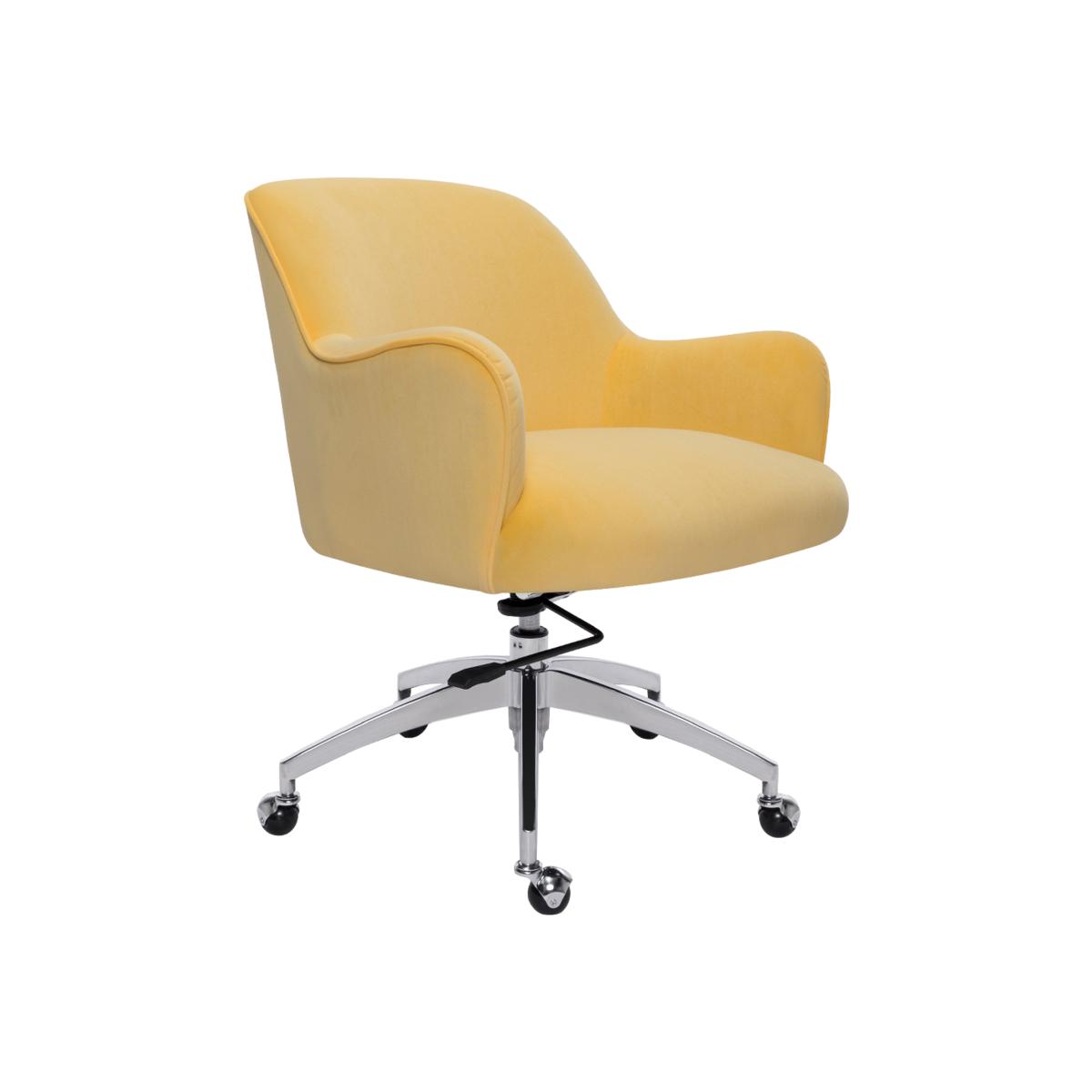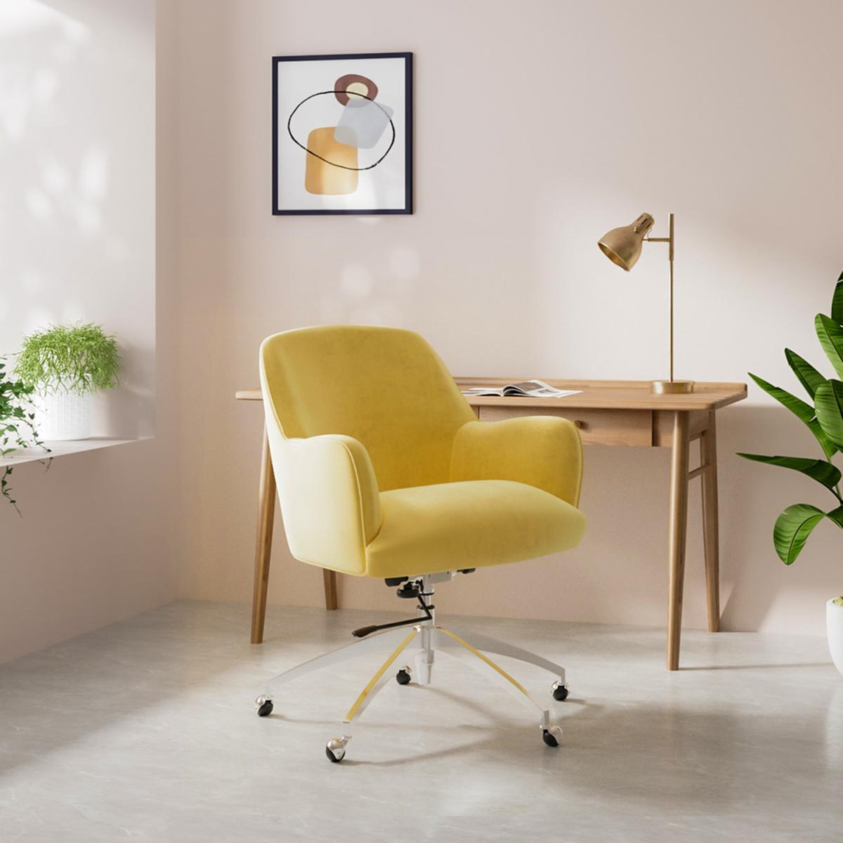 I love this yellow swivel chair for its bold colour and contemporary shape, making it a stylish statement piece in any home office. Its bright hue works particularly well in modern interiors that embrace colour, or as a pop of vibrancy in more neutral schemes. Practical styling tips include pairing it with muted furniture and lush textiles to create a balanced look, or mixing it with patterned accessories to enhance its playful appeal. Its swivel base adds functionality, making it perfect for multitasking workspaces. Overall, it’s a versatile choice for injecting character and comfort into a functional office setup.