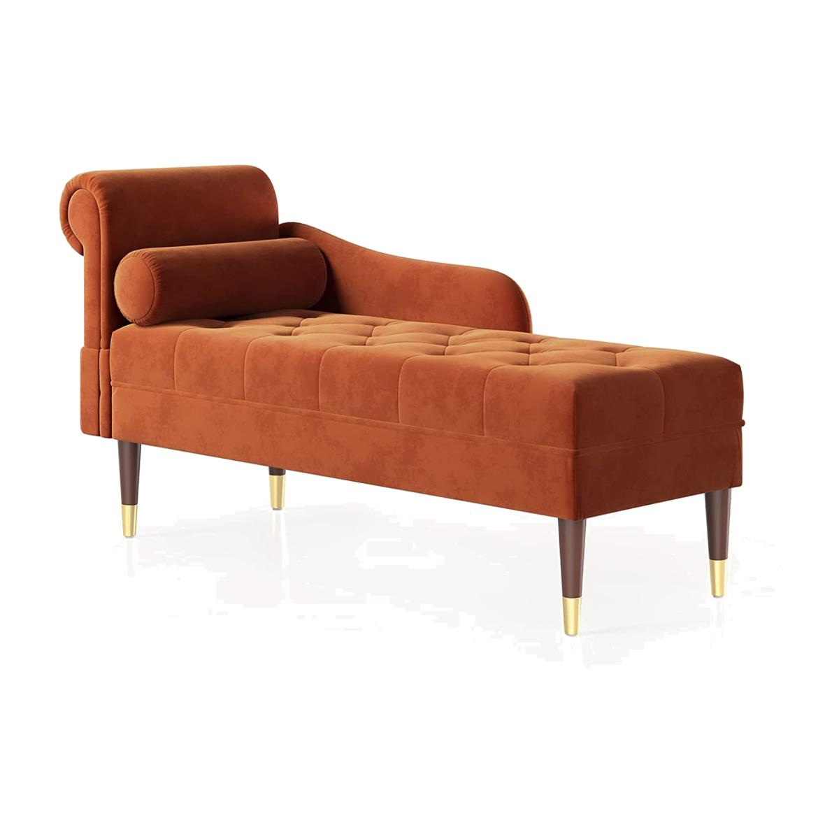 A simple velvet fabric lounge sofa with a backrest and armrest. A perfect support to allow your body to relax more when you rest, the cylindrical lumbar pillow offers a soft, comfortable addition while laying down. Equipped with rubber wood with golden-tipped legs, the luxurious sofa highlights its great stability, durability and beauty. The couch is made of skin-friendly breathable velvet fabric, filled with 2 layers of high-density foam, which is full of elasticity to make you feel super comfortable while you read books or magazines, have a rest, or take a nap. Easy to maintain, just clean the velvet with dry shampoo and a wet sponge or a mild cleaner. As it does not take up too much space, the chaise lounge can be placed near your sofa in the living room or next to the window in your bedroom or study room, which will be a beautiful addition to your space. It also applies to the leisure area or office rest area. You are sure to feel great when reading or resting.