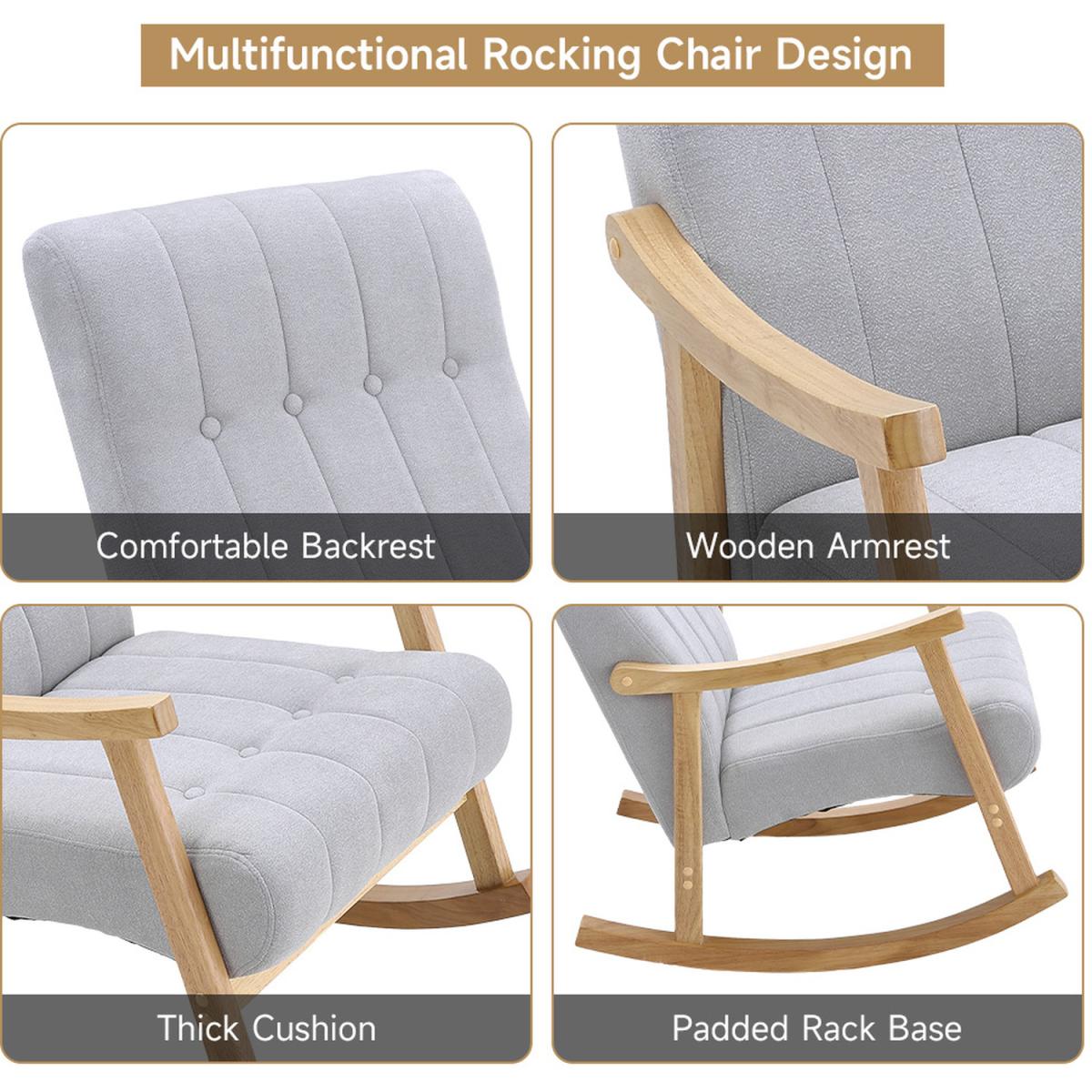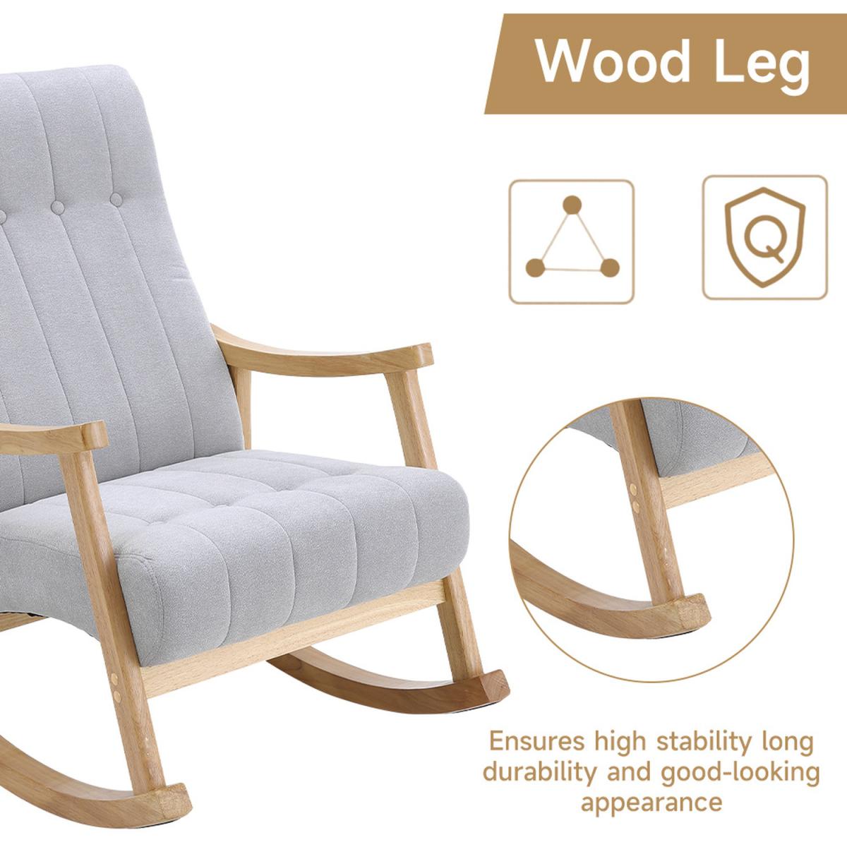Elevate your relaxation experience with our Velvet Upholstered Tufting Rocking Chair. Crafted for both style and safety, this rocking chair boasts a solid wooden structure that allows you to rock with confidence. Sink into the deep-padded seat and high backrest, offering you unparalleled comfort,It's also the perfect spot to unwind after a long day or to enjoy a leisurely read. The pared-down design of this rocking chair makes it a versatile addition to any living room, bedroom, or lobby. It seamlessly complements various interior styles, from classic to modern. Our rocking chair features a sturdy rubberwood frame that ensures durability and stability. You can rock away without worries, knowing that this chair is built to last. The tufted design of the chair pairs beautifully with its velvety fabric, adding a touch of sophistication to any space. It's a piece that's sure to catch the eye and become a focal point in your home. Whether you're seeking a cozy spot for relaxation or a stylish addition to your decor, this Velvet Upholstered Tufting Rocking Chair fits the bill perfectly.
