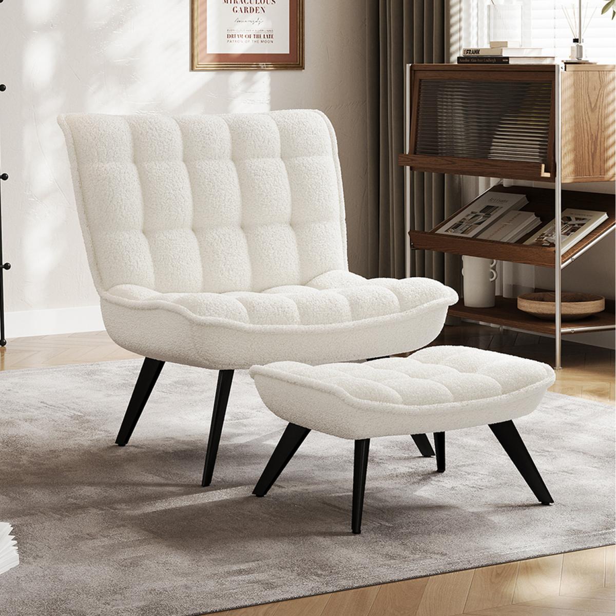 Enhance your living space with this elegant white accent chair, designed to blend seamlessly with any home decor while offering superior comfort. The teddy fleece seat is filled with premium sponge for a soft, luxurious feel, while the S-spring design provides excellent support, ensuring a pleasant sitting experience. Built with a sturdy iron frame and flat iron legs, this chair offers durability and long-term stability. The included footstool adds extra comfort by allowing you to rest your feet, making it perfect for relaxing, reading, or napping. Additionally, the footstool doubles as an extra seating option when needed. Ideal for any room, this accent chair provides a cozy retreat to unwind and enjoy some well-deserved relaxation.