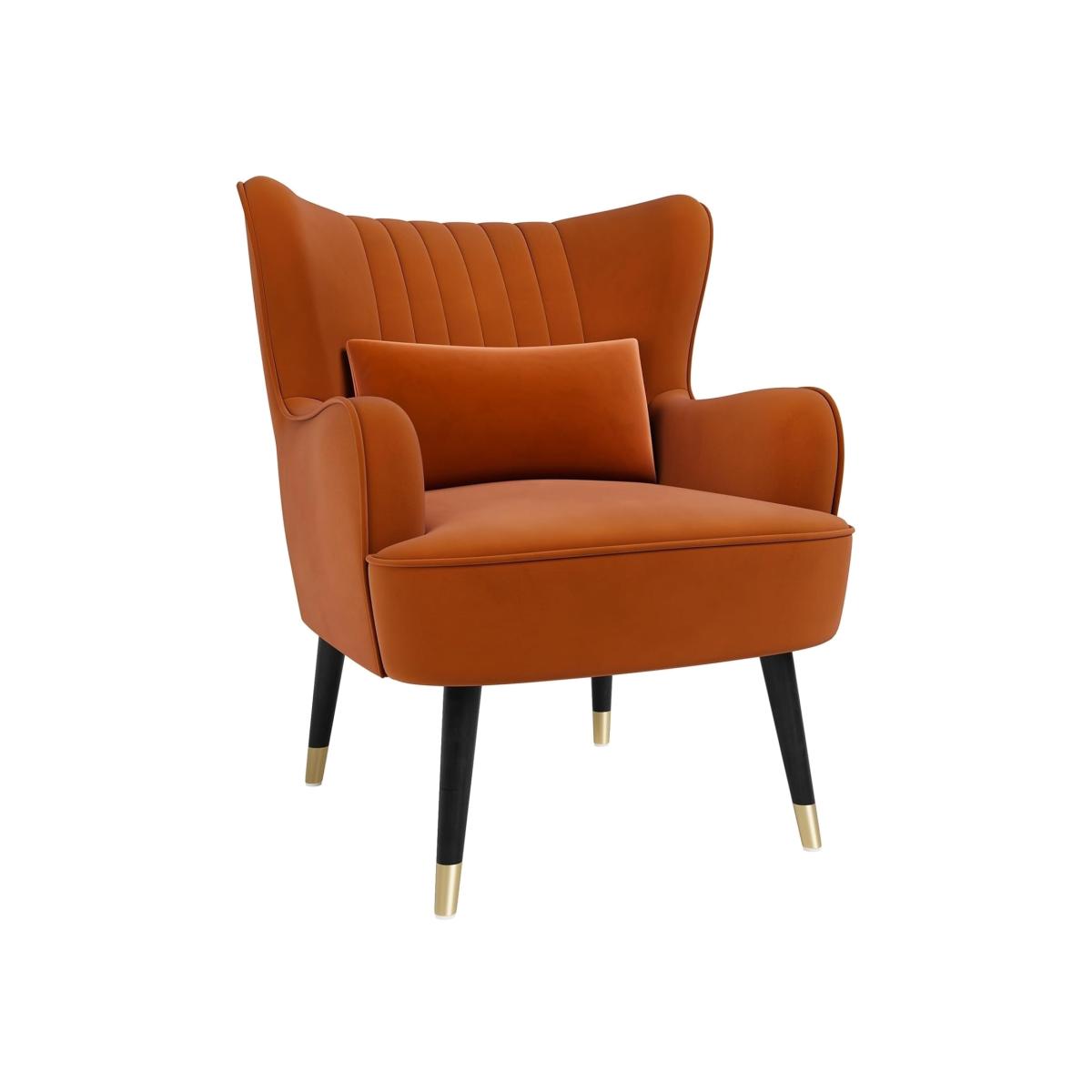 This elegant velvet armchair combines style and durability with its solid wooden frame and legs. The integrated backrest and seat ensure a sturdy construction, capable of supporting up to 180kg. Adjustable anti-skid foot pads enhance stability, so you don¿t have to worry about the chair shifting or wobbling. The chair is upholstered in breathable velvet fabric and features a generously cushioned seat and backrest, filled with pocket springs and high-density foam for exceptional comfort. It also includes a lumbar pillow for added support. The luxurious design makes this armchair a beautiful addition to any room, effortlessly complementing your home decor. Its wide, thick cushion provides the perfect spot for relaxation after a long day, whether you're reading a book or chatting with friends. Compact in size, the armchair fits easily beside a sofa in the living room, near a window in the bedroom, or in a study or office space, enhancing any area with its stylish presence. Assembly is simple and hassle-free: just attach the legs, and your new chair is ready to enjoy. For your convenience, the cushion can be flipped over to reveal the accessories and assembly manual stored inside. Velvet Accent Chair with Lumbar Pillow, Modern Wing Back Armchair Lounge Chair, Large Occasional Chair for Living Room Bedroom Study Room Office(Orange)