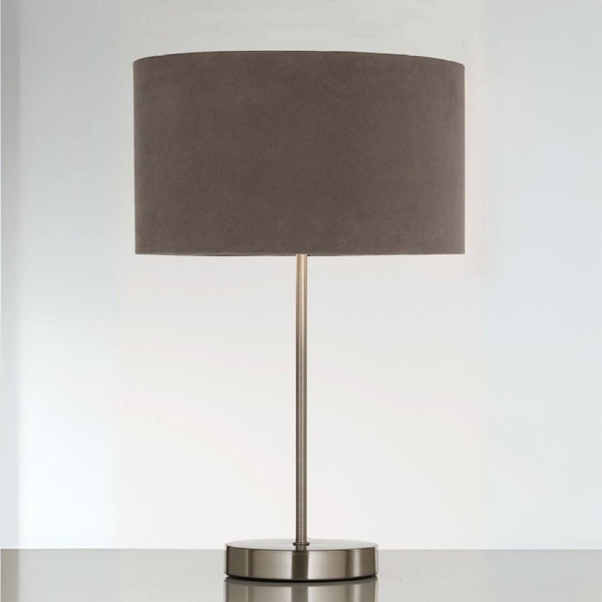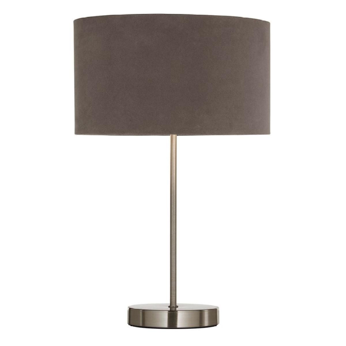 Velvie 1-light table lamp, featuring a slender stick design, a brushed chrome finish and a grey velvet drum shade with a brushed chrome metallic inner. The Velvie table lamp is a striking combination of modern sophistication and luxurious textures. Featuring a slender stick design with a sleek brushed chrome finish, this lamp adds a polished, contemporary look to any space. The grey velvet drum shade exudes elegance, with its rich, soft fabric offering a refined contrast to the cool metallic sheen of the brushed chrome inner lining, which enhances the lamp's light output with a subtle, shimmering effect. Ideal for living rooms, bedrooms or hallways, the Velvie lamp serves as both a stylish accent piece and a functional light source. Its sleek design make it a perfect fit for modern, chic interiors, while the unique velvet and chrome combination creates an atmosphere of understated luxury. Velvie 1-light table lamp, featuring a slender stick design, a brushed chrome finish and a grey velvet drum shade with a brushed chrome metallic inner. The Velvie table lamp is a striking combination of modern sophistication and luxurious textures. Featuring a slender stick design with a sleek brushed chrome finish, this lamp adds a polished, contemporary look to any space. The grey velvet drum shade exudes elegance, with its rich, soft fabric offering a refined contrast to the cool metallic sheen of the brushed chrome inner lining, which enhances the lamp's light output with a subtle, shimmering effect. Ideal for living rooms, bedrooms or hallways, the Velvie lamp serves as both a stylish accent piece and a functional light source. Its sleek design make it a perfect fit for modern, chic interiors, while the unique velvet and chrome combination creates an atmosphere of understated luxury.