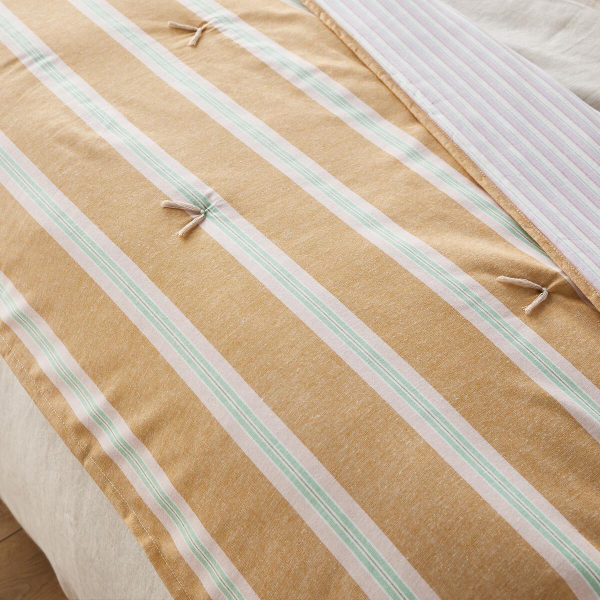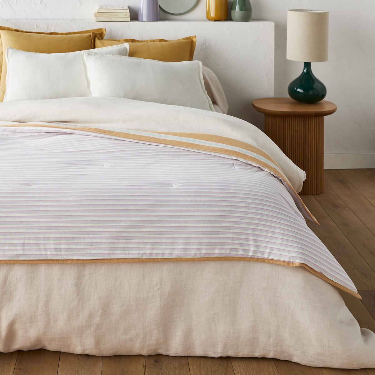 A graphic composition, a combination of stripes and variation of colours... The Vence quilt made from a cotton/linen fabric will help create a country atmosphere in the bedroom. Cotton & linen fabric combines the softness of cotton and the raw appearance of linen. Its crumpled appearance does not require ironing. Product Details • Cover 90% cotton, 10% linen • Padding 100% polyester, 120g/m² • Front: Wide stripe pattern • Back: Narrow stripe pattern • Edge-to-edge finish. Care Advice • Machine washable at 40°C • By washing your laundry at 30°C instead of 40°C, you limit energy consumption. Dimensions • Square: 150 x 150cm • Rectangular: 90 x 190cm • OEKO-TEX® Standard 100. Standard 100 certification by OEKO-TEX® tests textile products for harmful substances via an independent, international label.