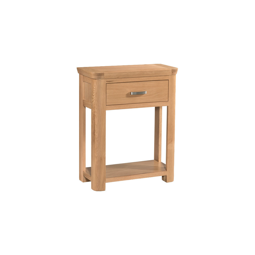 The Veneto oak small console table was designed to achieve quality, elegance, and functional use. It has a unique and stylish design, complete with a glossy and radiant light oak finish. This console table is perfectly compact and will therefore take up very little floor space. It was crafted using solid oak wood and oak veneer, with a sturdy and enduring frame. Stylish, strong and incredibly functional, the Veneto oak small console will be a striking addition to your dining room. Durable console table with an elegant and timeless design. Built using solid oak wood and oak veneers, with a strong solid wood frame. Radiant light oak finish that introduces a bright and traditional texture to your dining room. Perfectly compact frame takes up very little space. Chunky solid oak top that serves as a sturdy platform. 1 dovetailed drawer with a metal handle. Low magazine shelf. Wooden handles also available. Large console table also available. Complete the look with more items from this collection.