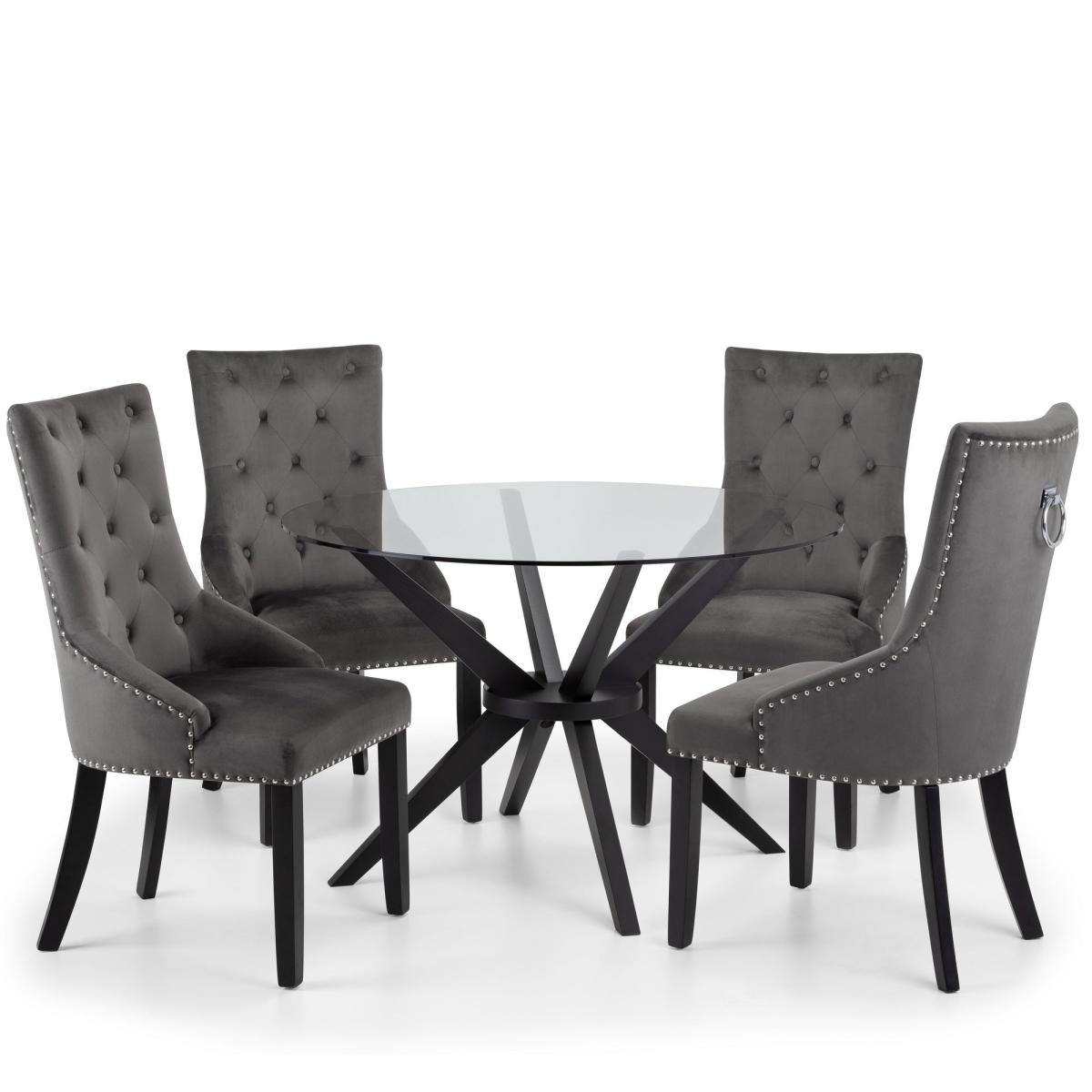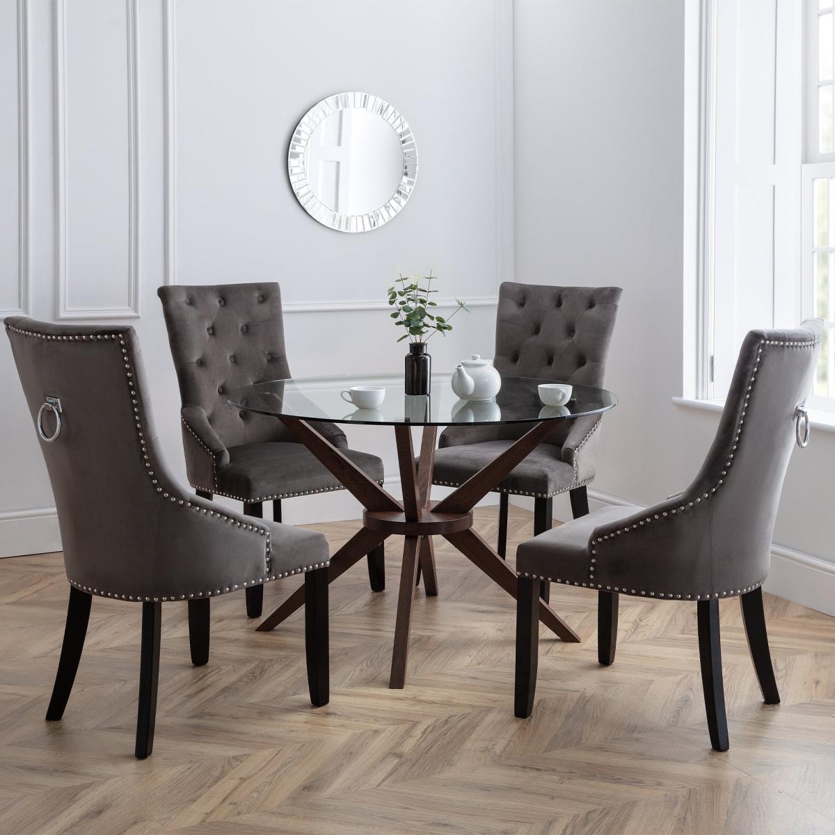 I’m a big fan of these knocker-back grey dining chairs for the way they balance elegance and everyday comfort. The gently tufted velvet seat and subtle nail-head trim give a hint of classic glamour, while the ring pull on the back keeps them feeling fresh and modern. They sit equally well in a neutral, Scandi-inspired kitchen or a richer, jewel-toned dining room - try pairing them with a dark wood or marble-topped table and a low-pendant light in aged brass. For a relaxed look layer a natural-fibre rug beneath, or introduce scatter cushions in contrasting textures if you’re using them around a casual farmhouse table.