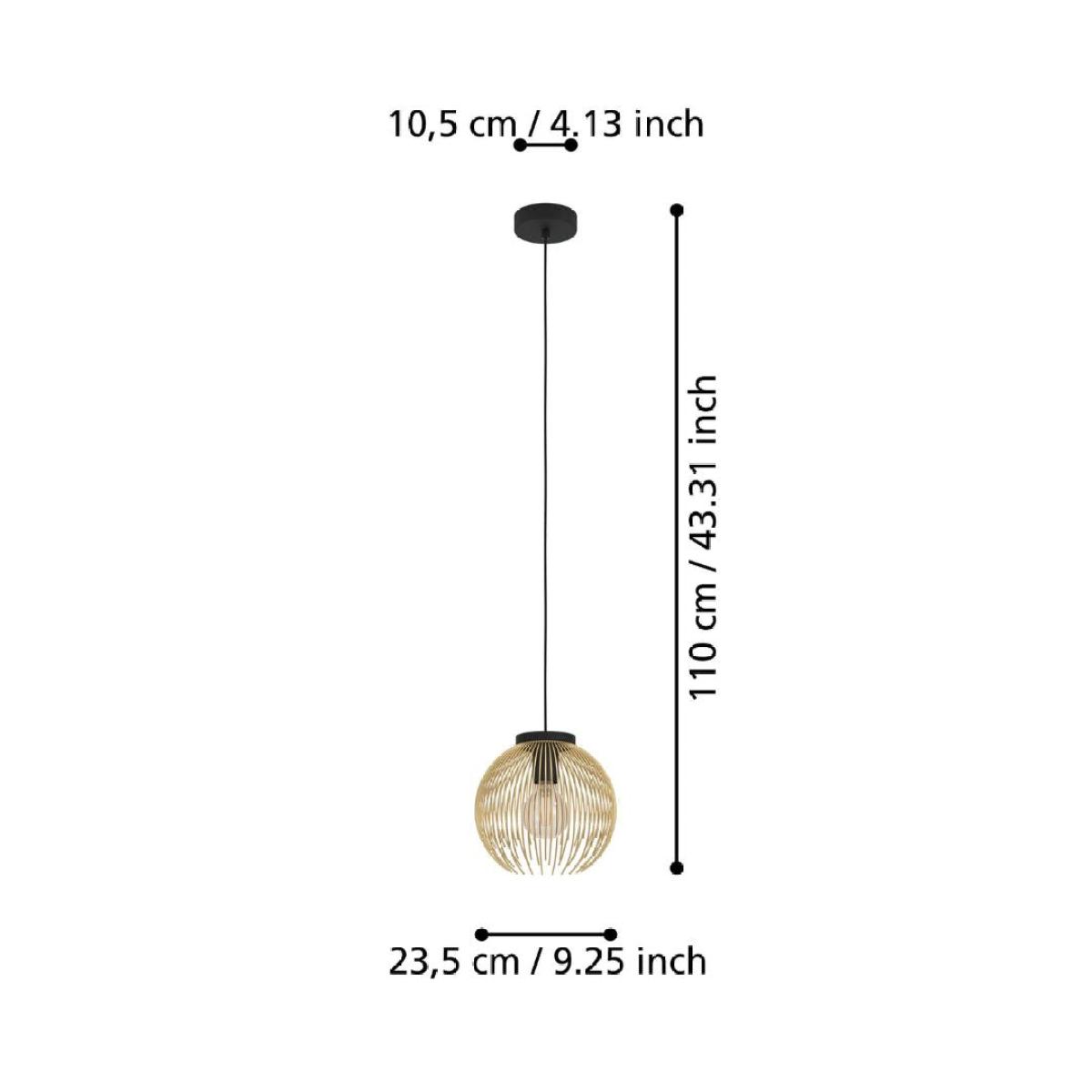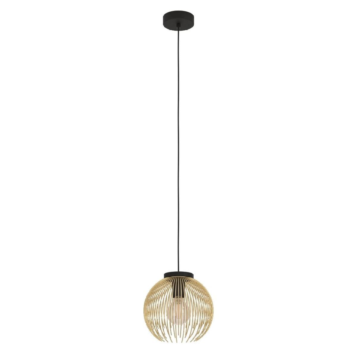 The Venezuela pendant light features a gold-coloured wire lampshade suspended from a round black metal canopy on a black textile cable. The wire shade curves harmoniously over the lightbulb and generates a fascinating display of light and shadow once illuminated, complementing modern interiors, blending seamlessly in any living room or above the dining room table. The product has an E27 lamp holder and requires 1 x E27 lightbulb, which is not included. The Venezuela pendant light features a gold-coloured wire lampshade suspended from a round black metal canopy on a black textile cable. The wire shade curves harmoniously over the lightbulb and generates a fascinating display of light and shadow once illuminated, complementing modern interiors, blending seamlessly in any living room or above the dining room table. The product has an E27 lamp holder and requires 1 x E27 lightbulb, which is not included.