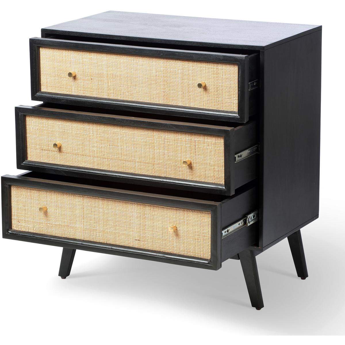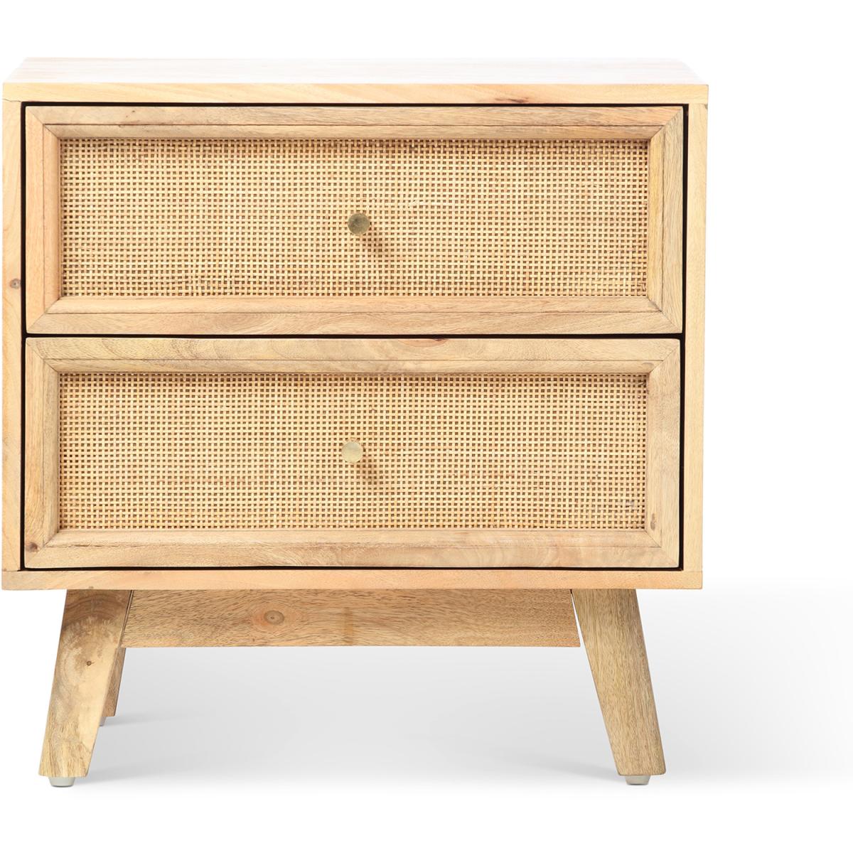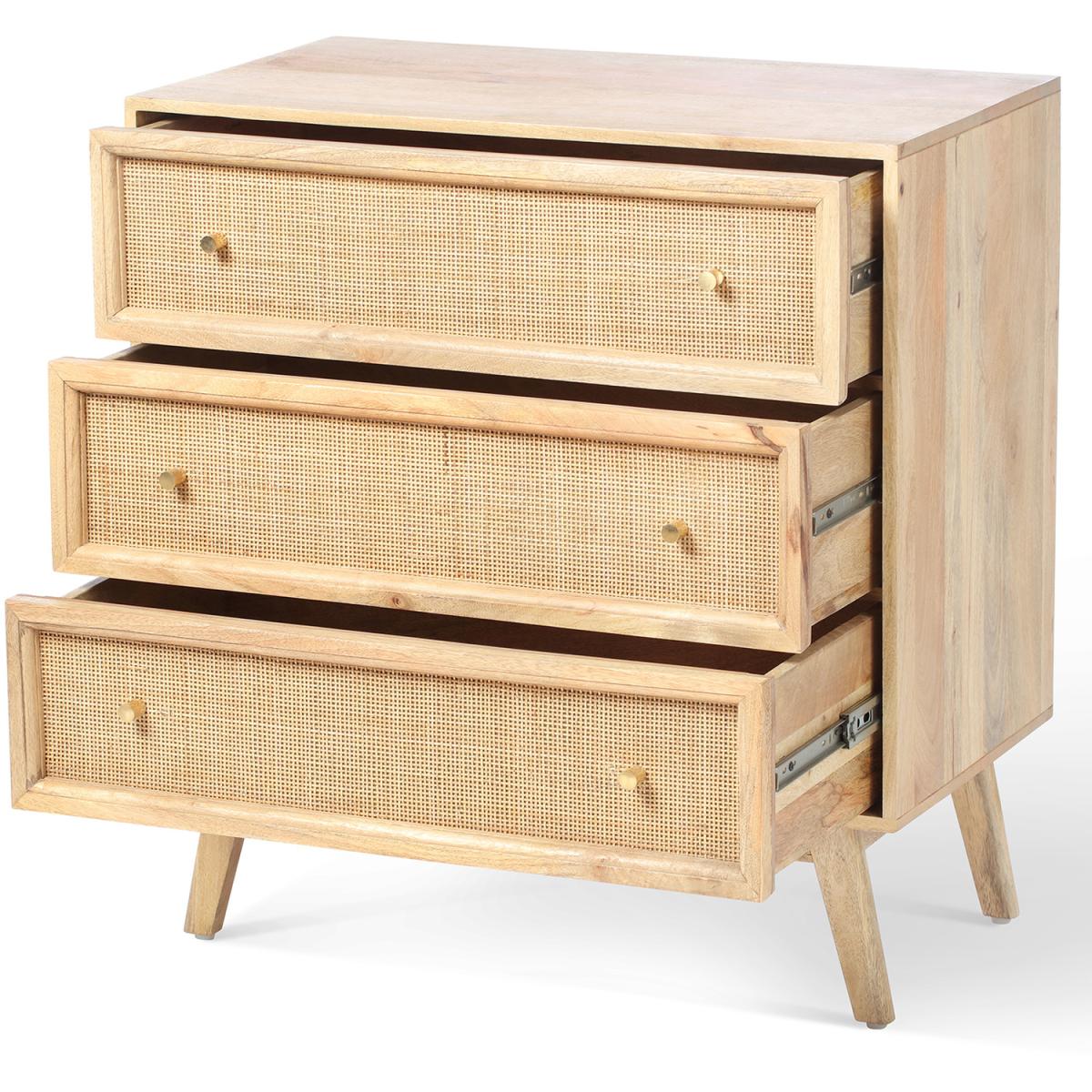 Solid mango wood chest of 3 drawers in natural with natural rattan paneling and gold handle detailing.