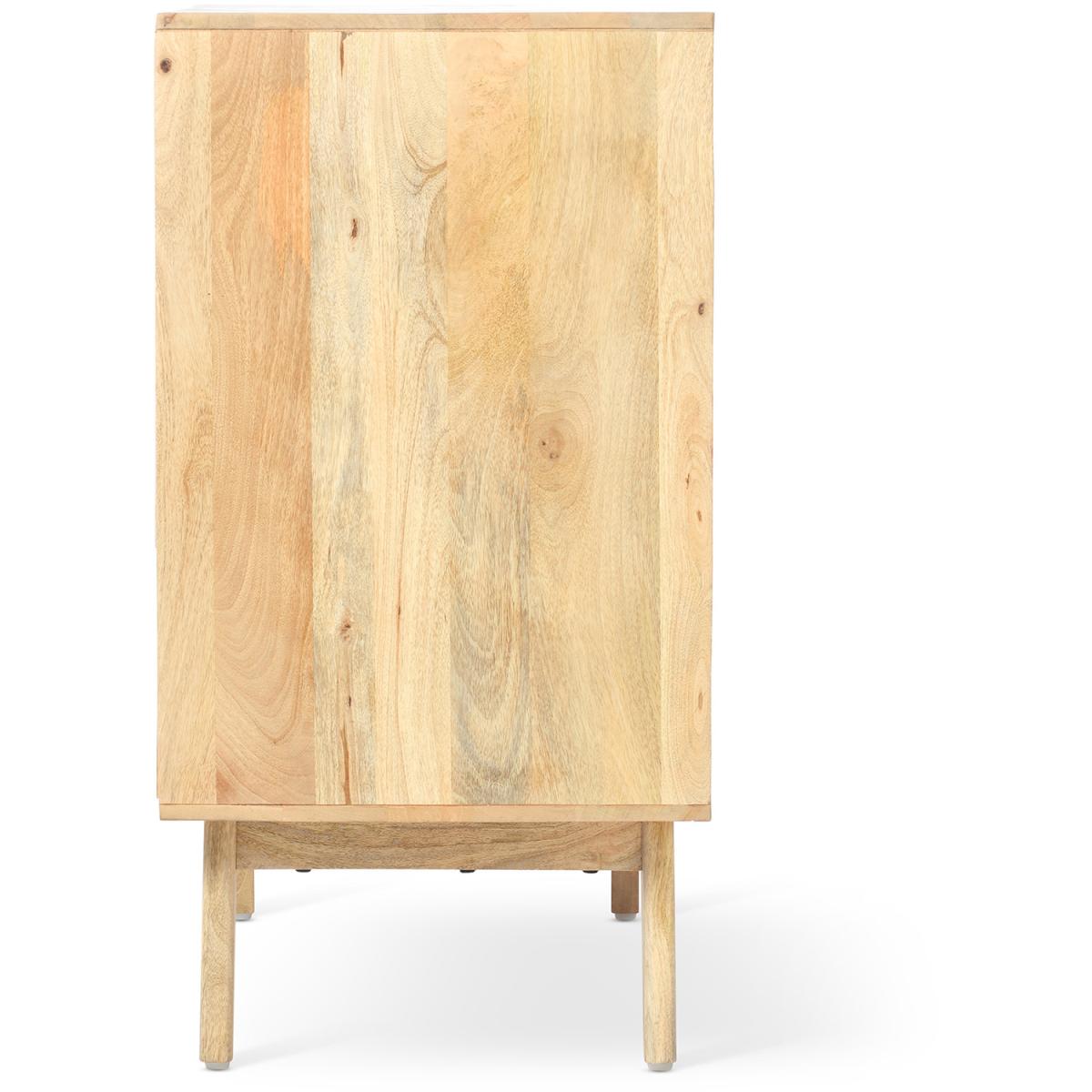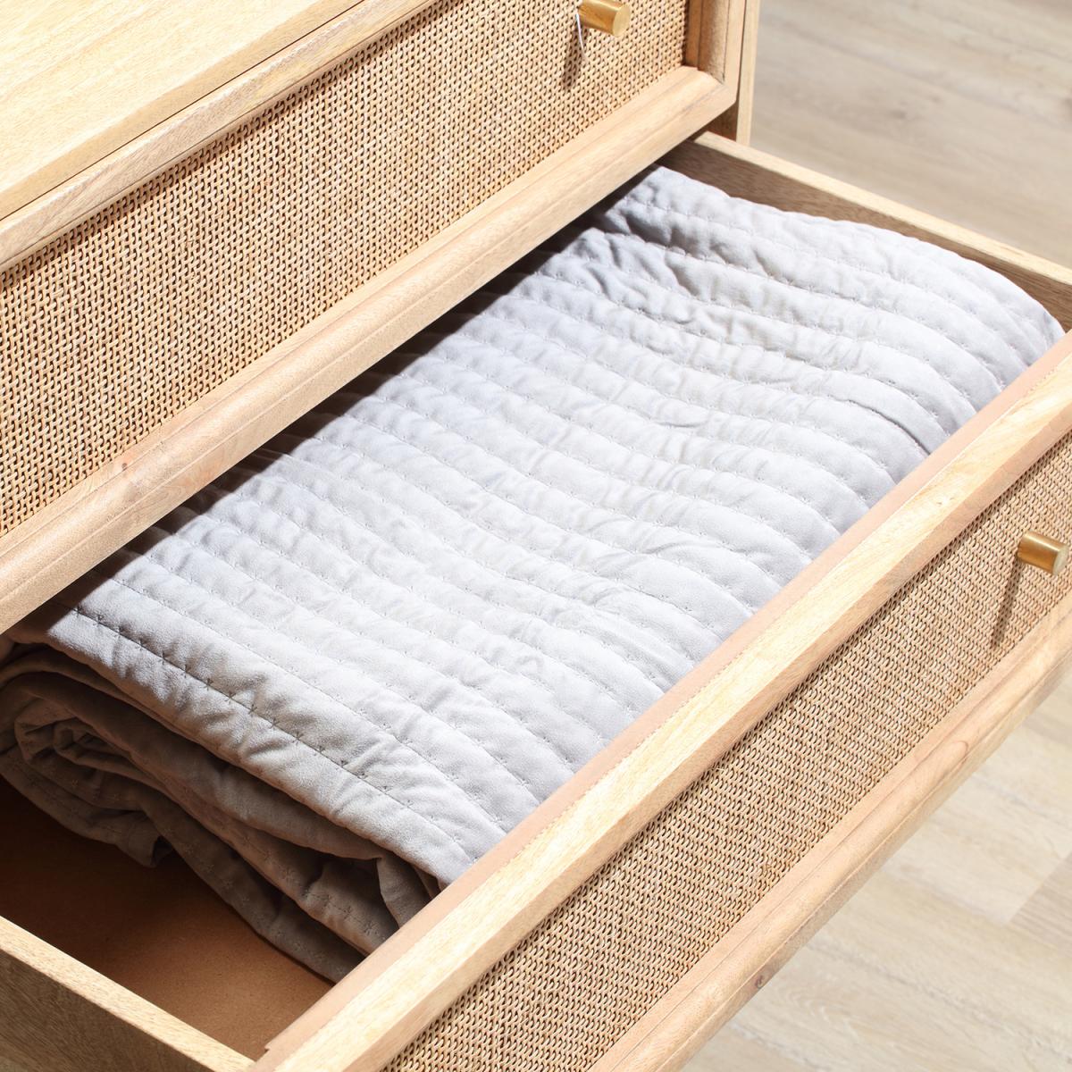I love this piece for its blend of rattan detailing and mango wood, which adds a warm, natural texture to a range of interiors. It works particularly well in coastal, Scandi, or boho schemes thanks to its neutral tone and relaxed aesthetic. Practical styling tips include pairing it with light linens, woven baskets, or greenery on top for a fresh look. It can serve both as a functional storage solution and a statement piece, making it ideal for bedrooms or living spaces where a touch of natural elegance is desired. Keep accessories minimal to let the craftsmanship and texture shine through.