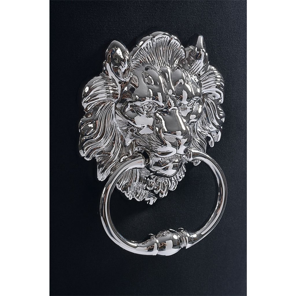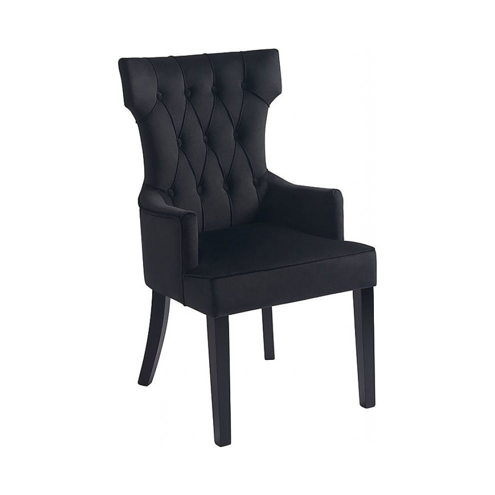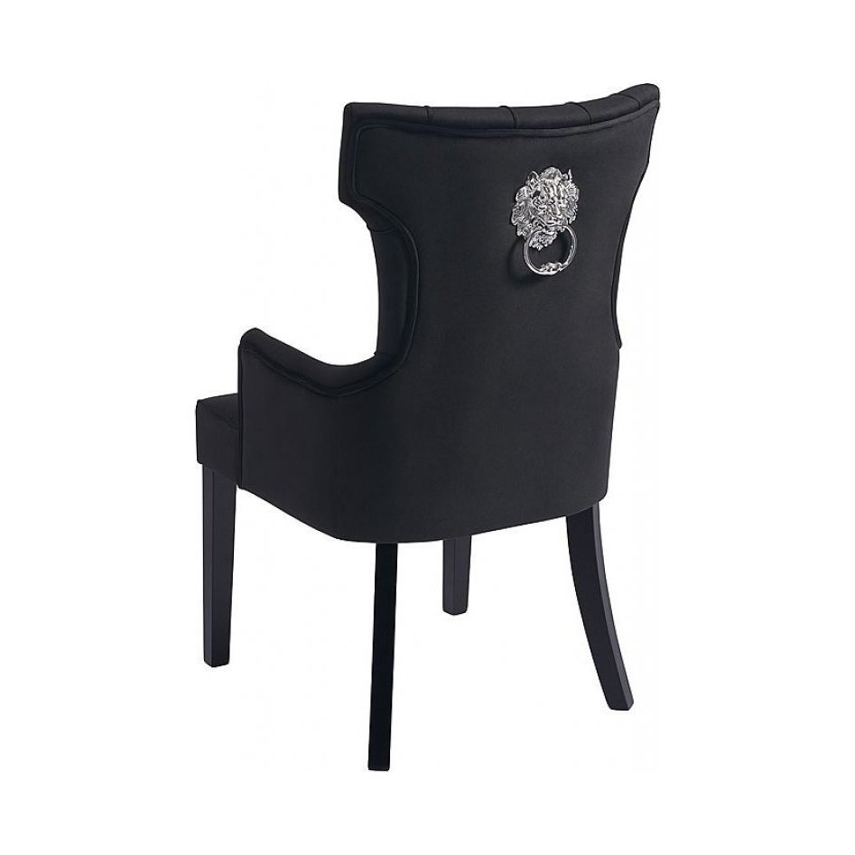 A distinctive and elegant carver chair. Coordinates with our Venice dining chair and counter stool. Featuring an impressive polished aluminium lion ring handle. Finely tailored velvet upholstery with pinched pleat detailing and deep buttoning. Comfortable foam seat with sprung webbing. Satin black stained legs. Minimal assembly required, simply attach legs.
